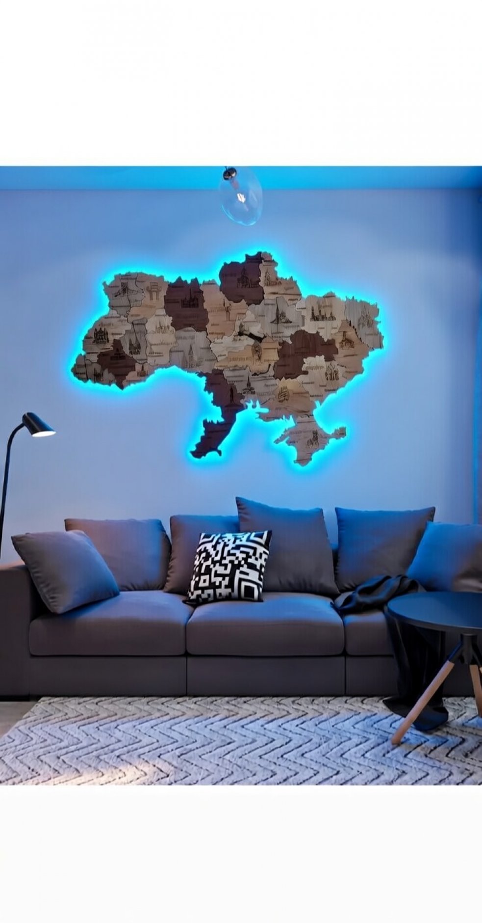 Інтер'єрна дерев'яна карта України з підсвіткою різноманітно простір будинку, дачі або офісу, краще ніж наклейка для стін. Украсит стены кухни или комнаты (спальные, гостиной) и придаст уют. Розмір карти України :105*72,155*105,205*140,255*170 см. Карта з дерева (ХДФ) — легка, швидко збирається як пазли і чудово кріпиться на стену двостороннім скотчем-на вспененій основі. При бажанні карту можна без праці сняти за допомогою канцелярського ножа, підцепив по контуру. Гладку поверхню декору протирайте вологою тряпочкою, надрукований лазером малюнок не втрачає яскравість і вид.Вибираєте карту світуУкраїни просто так для себе? Гости непременно помічають стильну декорацію! А також карта України з кордонами областей стане інтерактивним атрибутом для навчальних та дитячих ігор. Ищете идеальный подарок? И женщинам, и мужчинам получить приятно оригинальный презент. Карту можна подарувати як рідним: маме, папе, чоловіку, жене, дедушке, бабушке, брату, сестре або ребенку, так і дівчині, парню, другу, подруге, коледжу, вчителю, вихователю, начальнику. .Найкраща ідея для новогоднього сюрпризу дітям і дорослим до нового року!