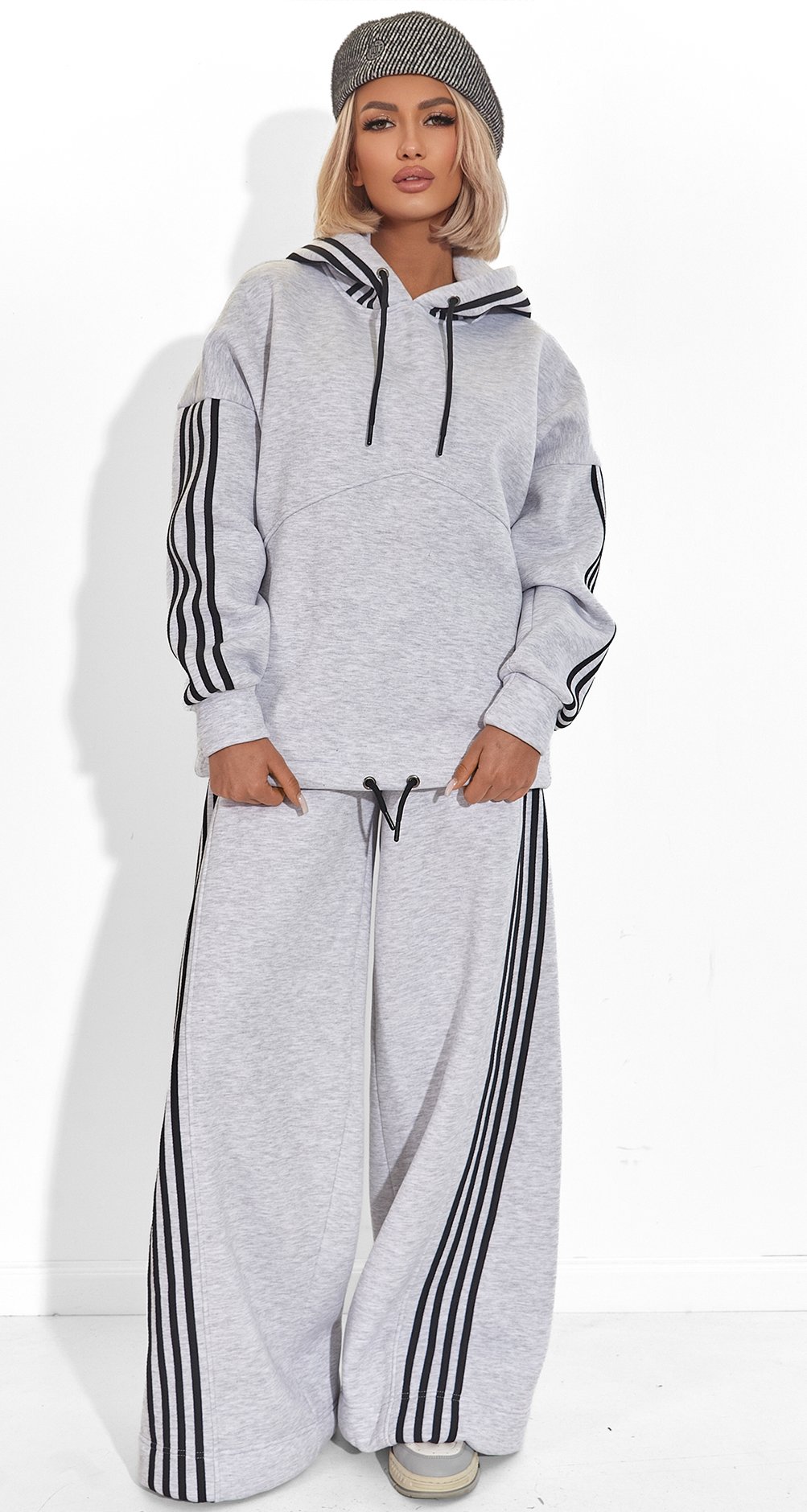 Спортивний Шик: Контрастні чорні лампаси та глибокий капюшон, виконаний в основній тканині (сірий), створюють чистий, графічний образ. Це класика, яка ніколи не вийде із моди.