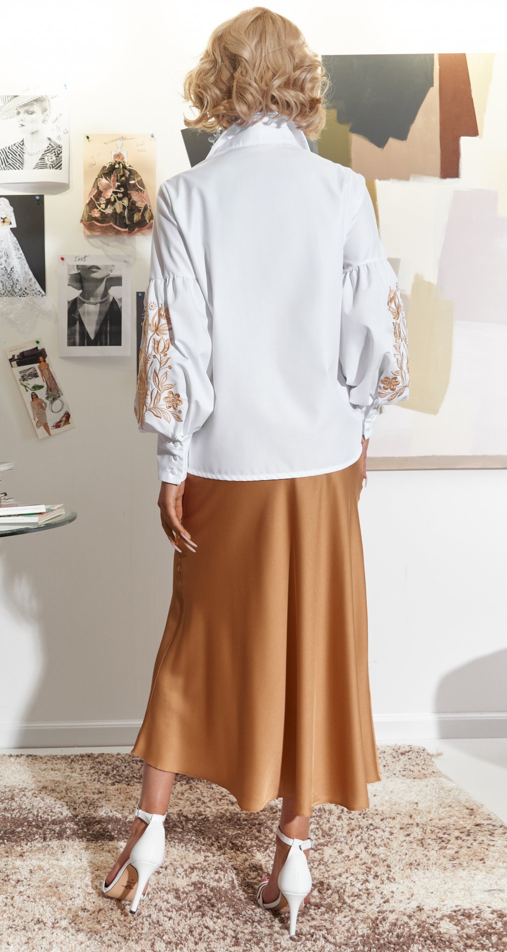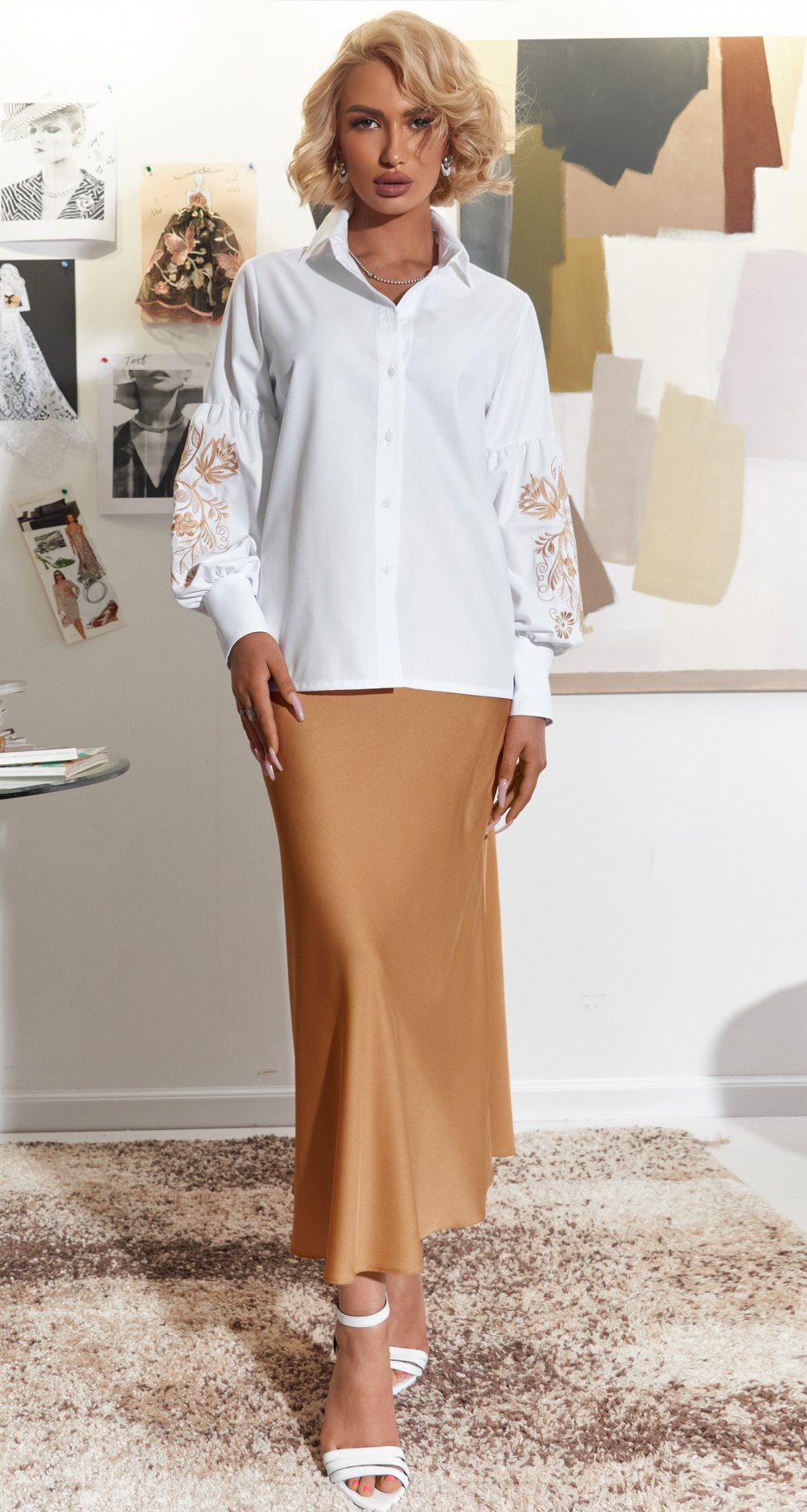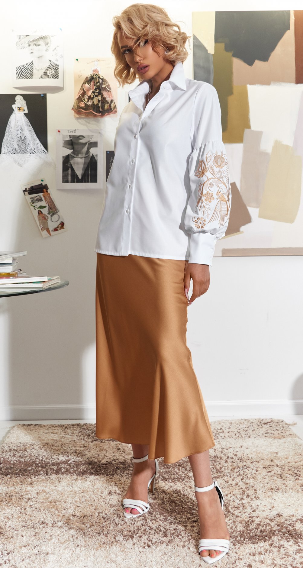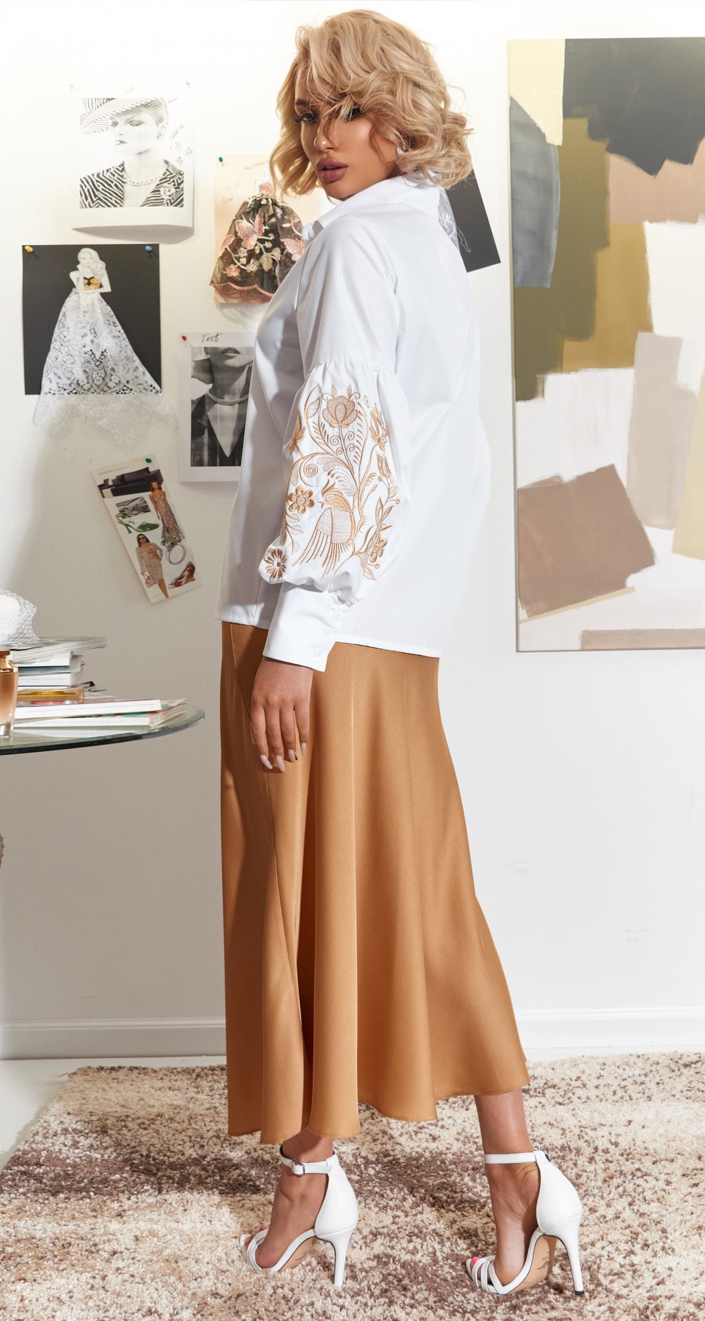 Ця стильна блузка створена для тих, хто цінує унікальність і якість. Її класичний білий колір надає універсальності, дозволяючи легко поєднувати її як з діловим костюмом, так і з повсякденними джинсами або модною спідницею (як на фото!). Але справжня родзинка – це, безумовно, красива вишивка на рукавах. Деталізовані візерунки в золотисто-коричневих тонах надають цій жіночій блузці неповторний шарм і благородство.