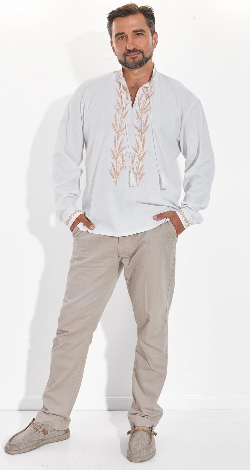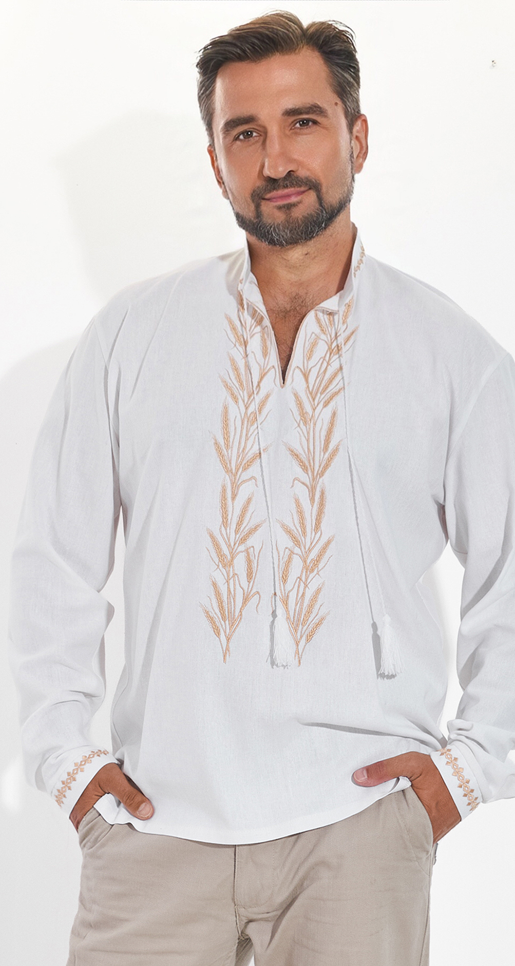 * Вишуканий дизайн: Центральним елементом вишиванки є машинна вишивка у вигляді колосків пшениці. Цей традиційний візерунок символізує родючість, багатство та благополуччя, приносячи глибокий зміст у ваш образ.