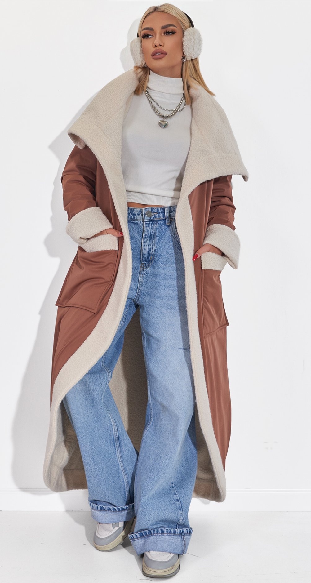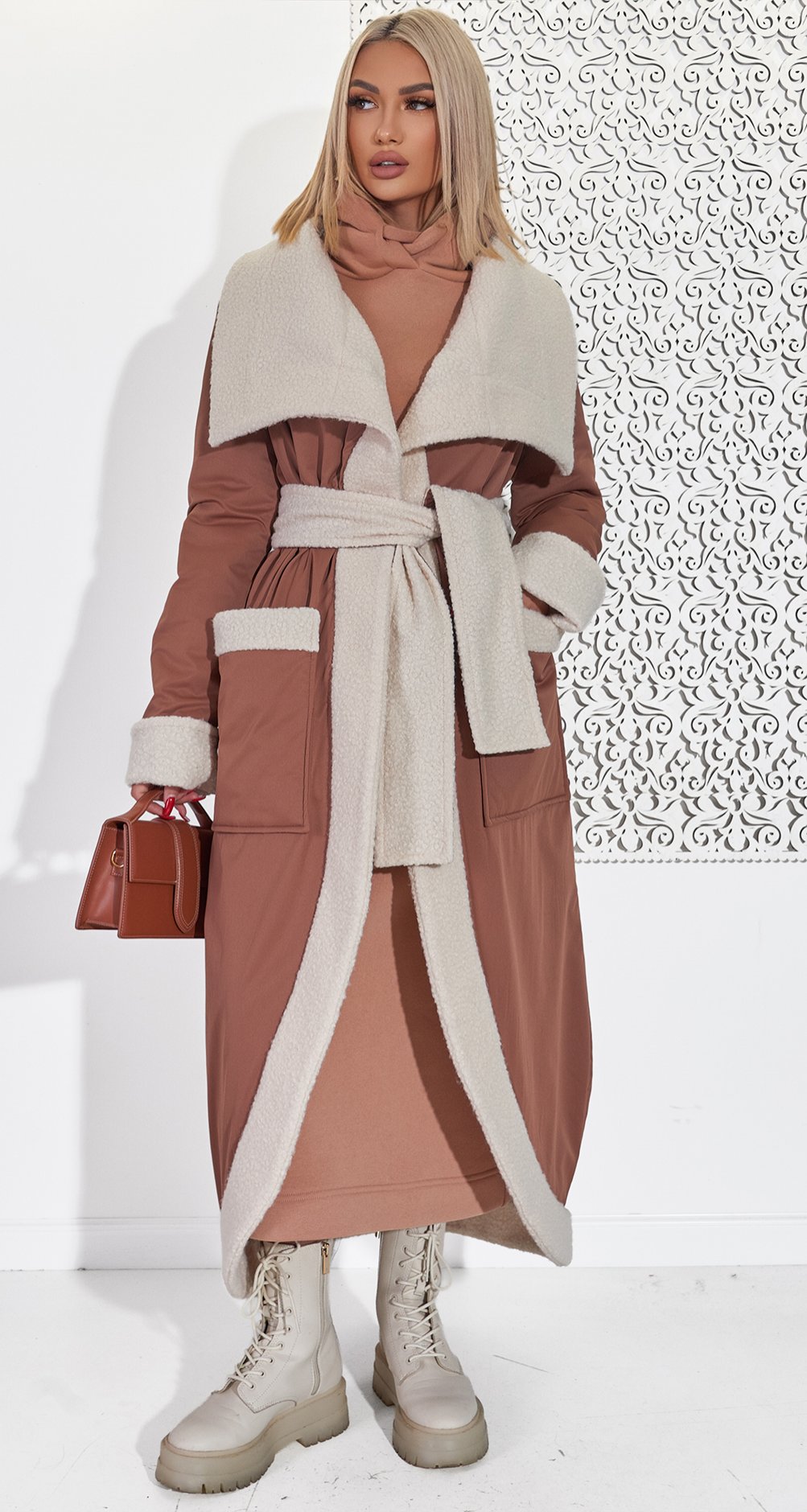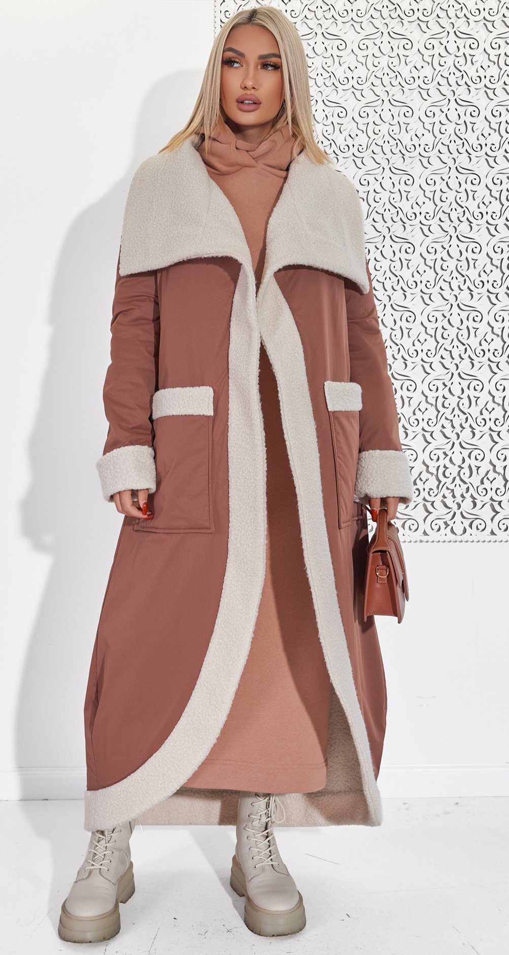 Довгий крій максі, стильний комір з відворотами та оздоблення контрастним хутром по краю роблять це пальто по-справжньому ефектним. Носіть його навстіж або підкресліть талію широким поясом.