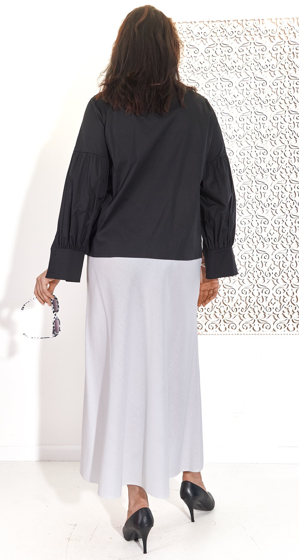 Ефектна бавовняна сорочка - ідеальна основа для стильного образу. Її головний акцент — оригінальні рукави з розрізами, що розстібаються, які створюють незвичайний і незабутній силует.