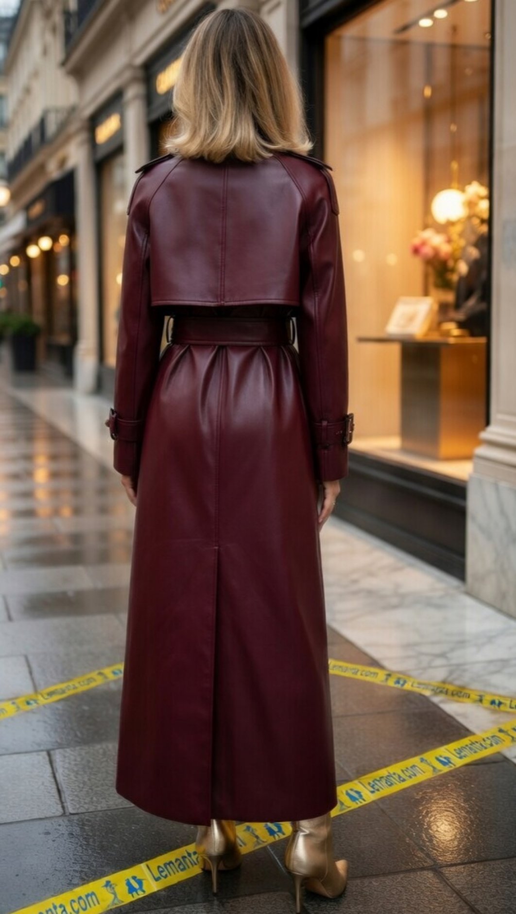 Your exit will be unforgettable. Our new elongated trench coat made of premium eco-leather in a deep burgundy shade is a manifesto of confidence and impeccable taste. It is created for those who are not afraid to be in the center of attention.