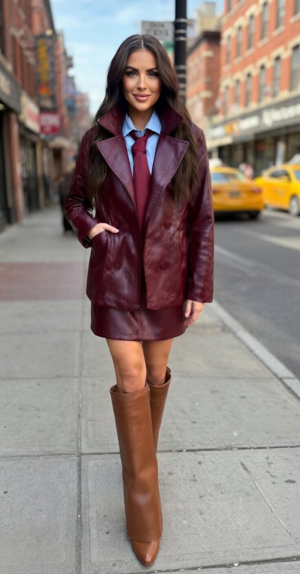 This eco-leather suit in deep burgundy color is the epitome of daring elegance and "street-style luxe". It was created for those who like structural things with character, which at the same time remain comfortable to wear.