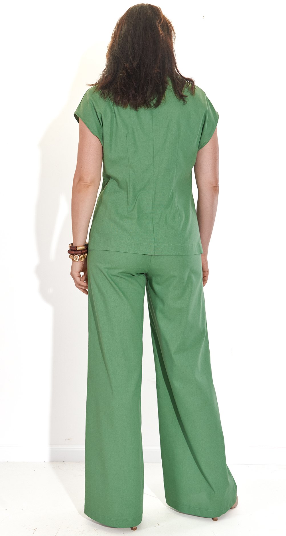 ​Versatility: Wear the suit as a set for walks by the sea or separate it: the vest perfectly complements our shorts made of eco-leather, and the palazzo pants make a perfect pair with a knitted cotton blouse.