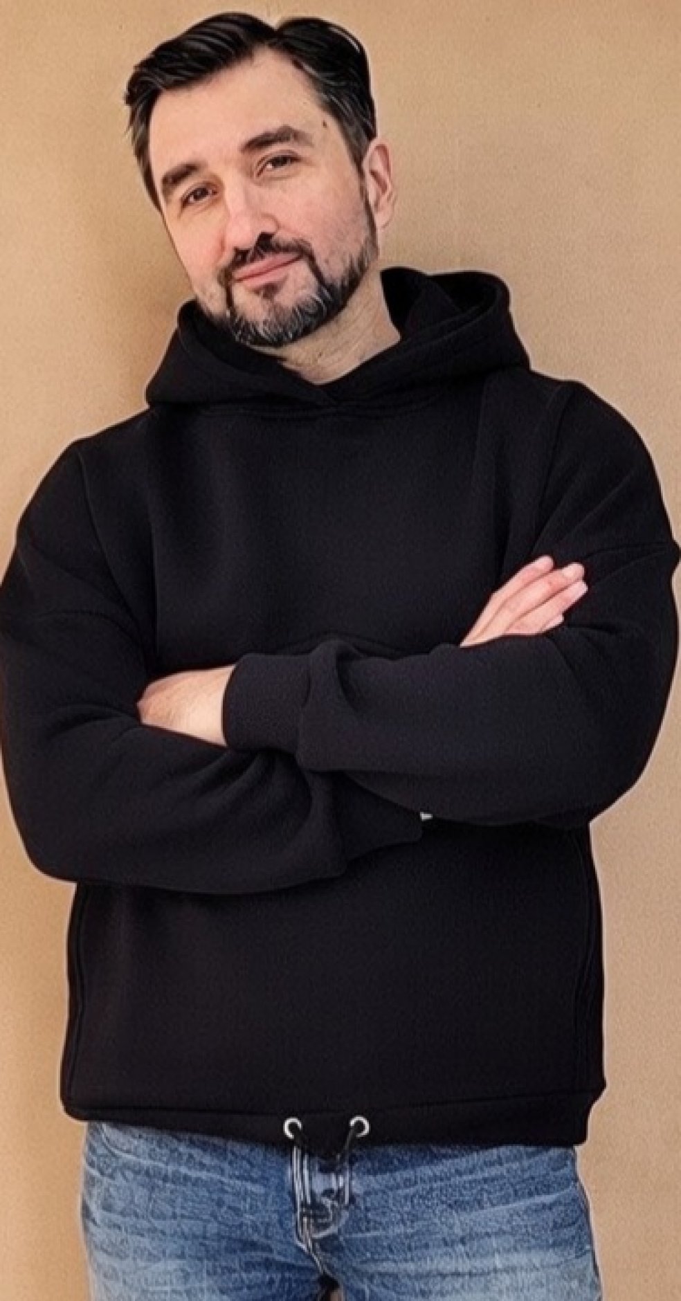Style and cut: Oversize cut (as on the model) is now at the peak of popularity, and the accented V-shaped neckline on the chest and the drawstring at the bottom (to adjust the volume) make it not just basic, but designer.