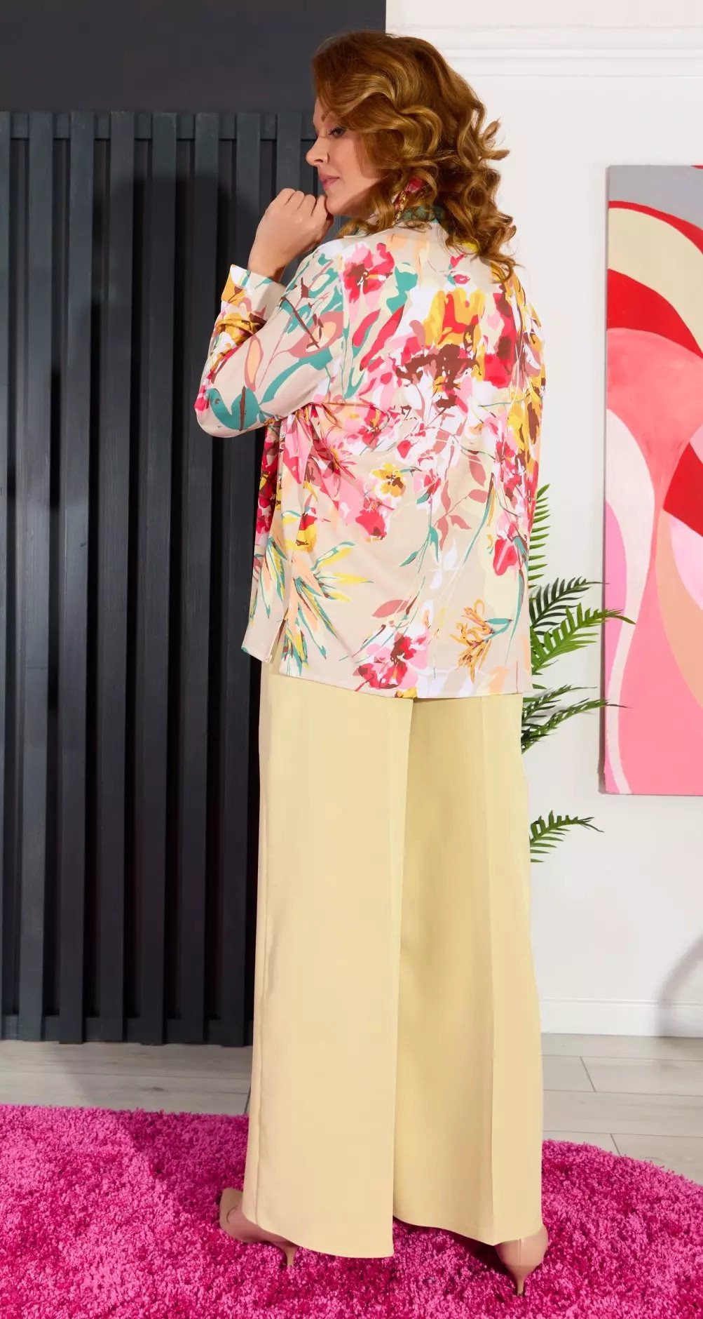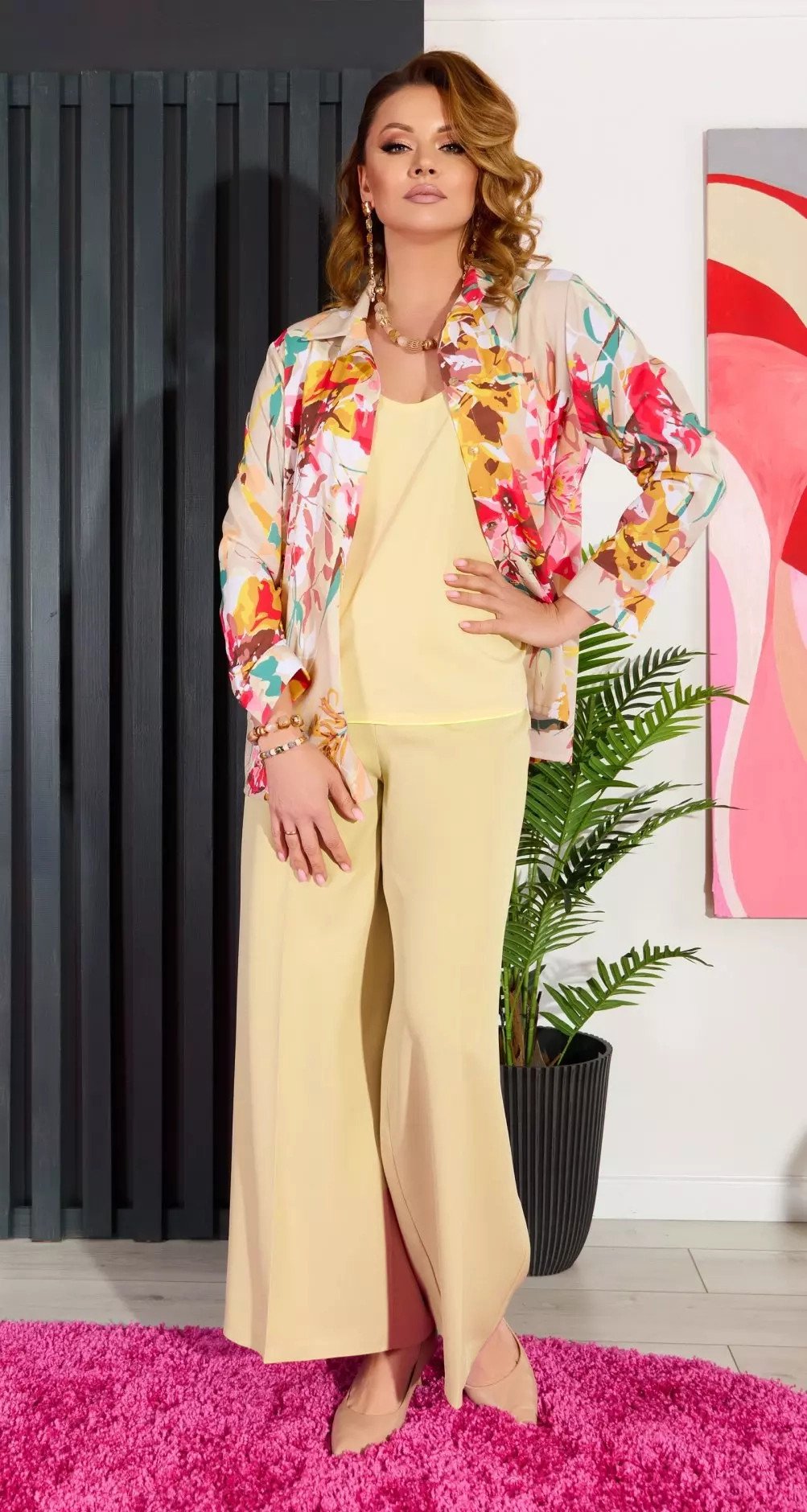 A shirt with a beautiful print made of light fabric and trousers with a one-piece belt!