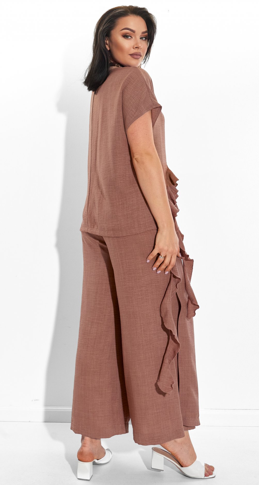 Immerse yourself in the world of relaxed elegance with our exclusive linen suit! This exquisite set, consisting of an airy blouse with flirty frills and a stylish skirt-trousers, will become your indispensable companion on hot summer days and cool evenings.