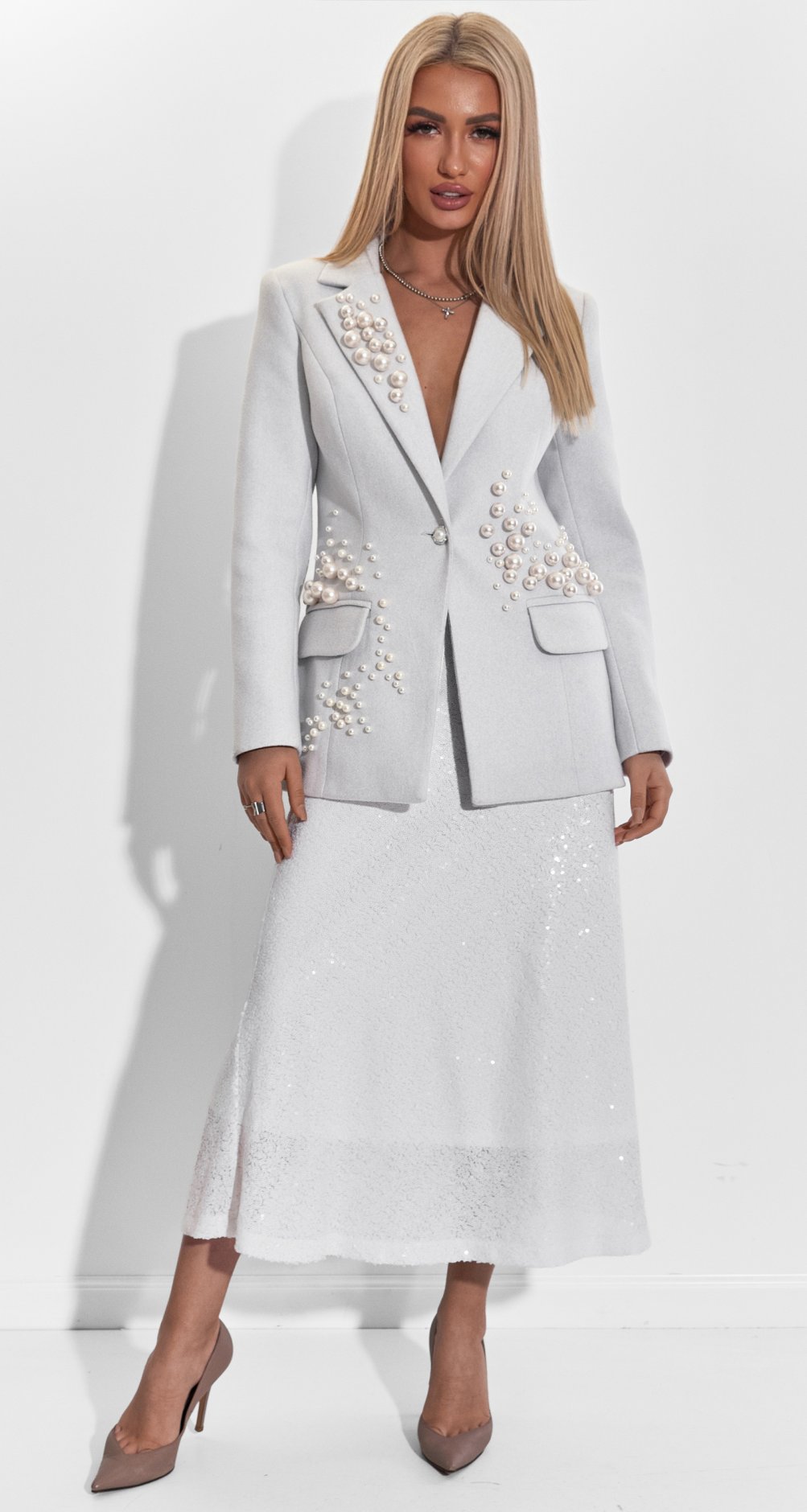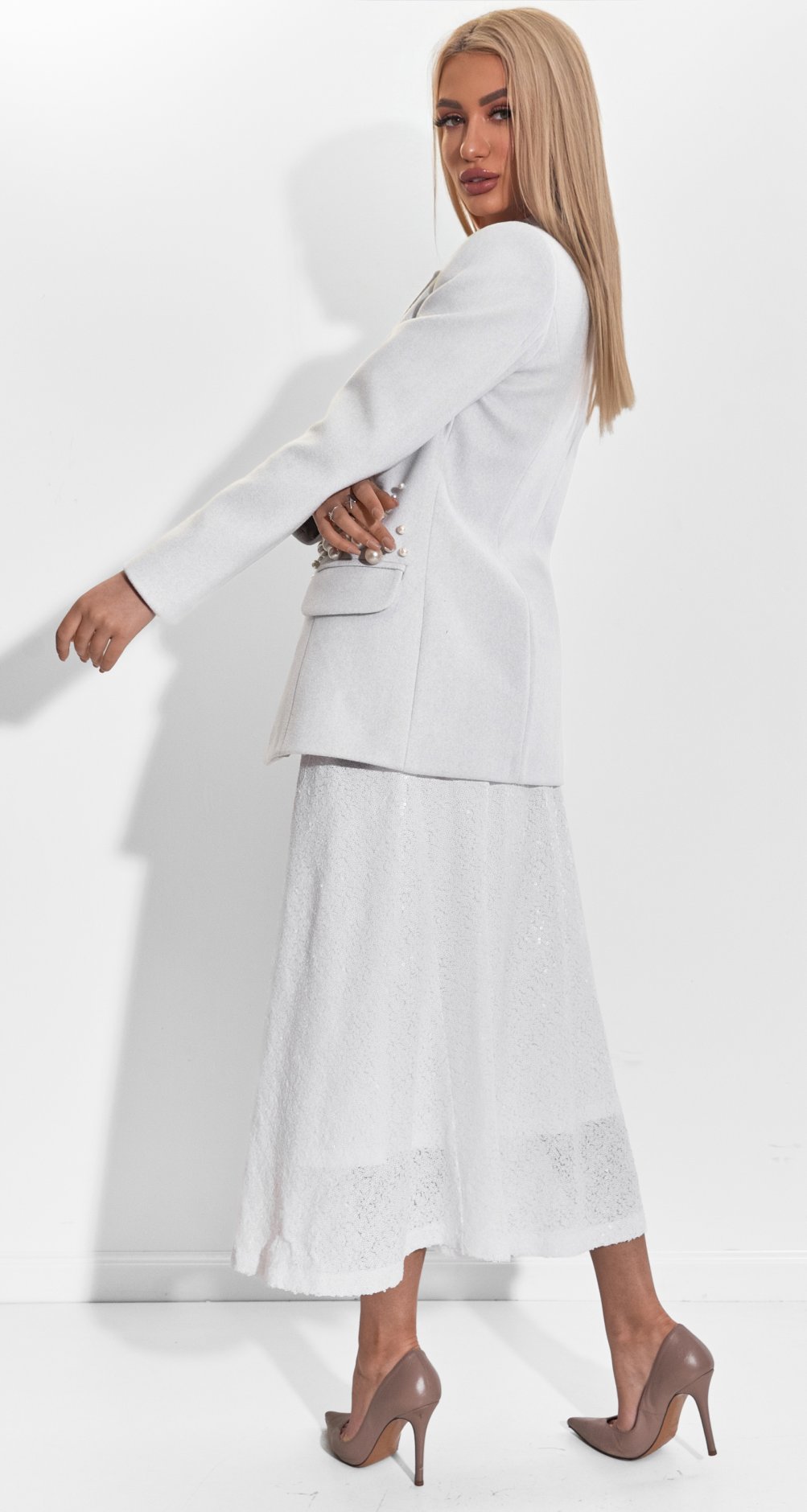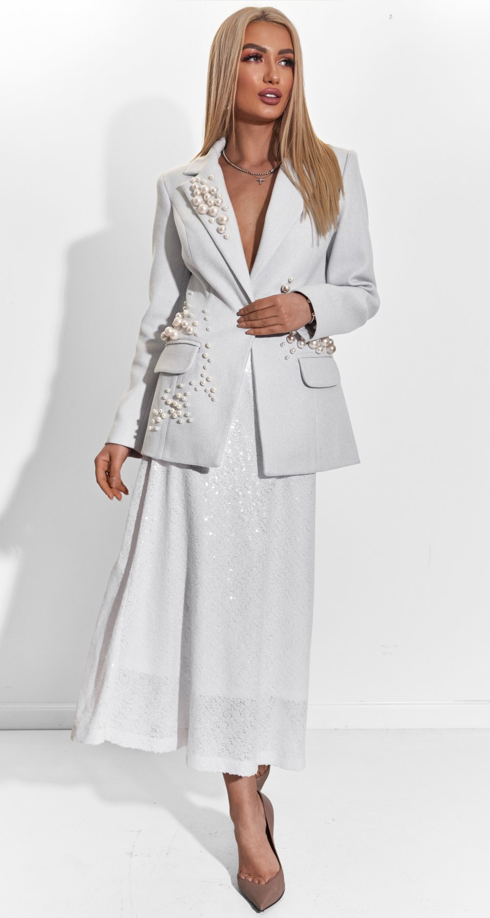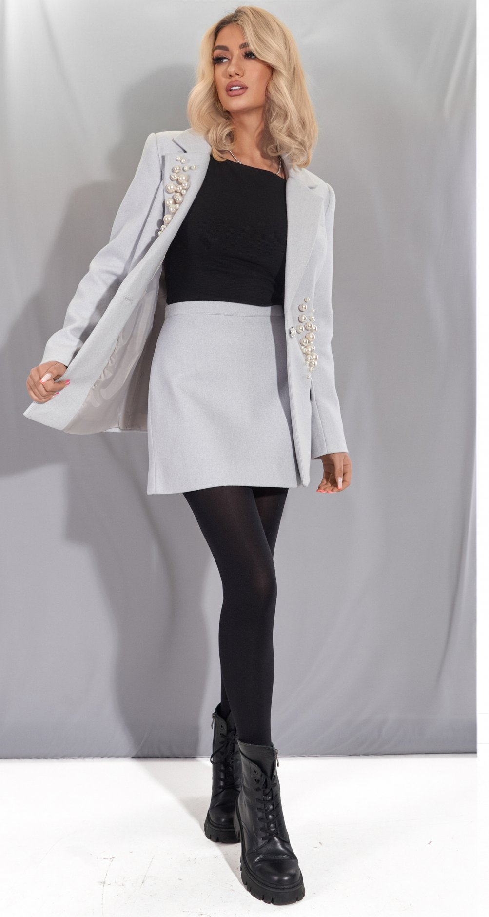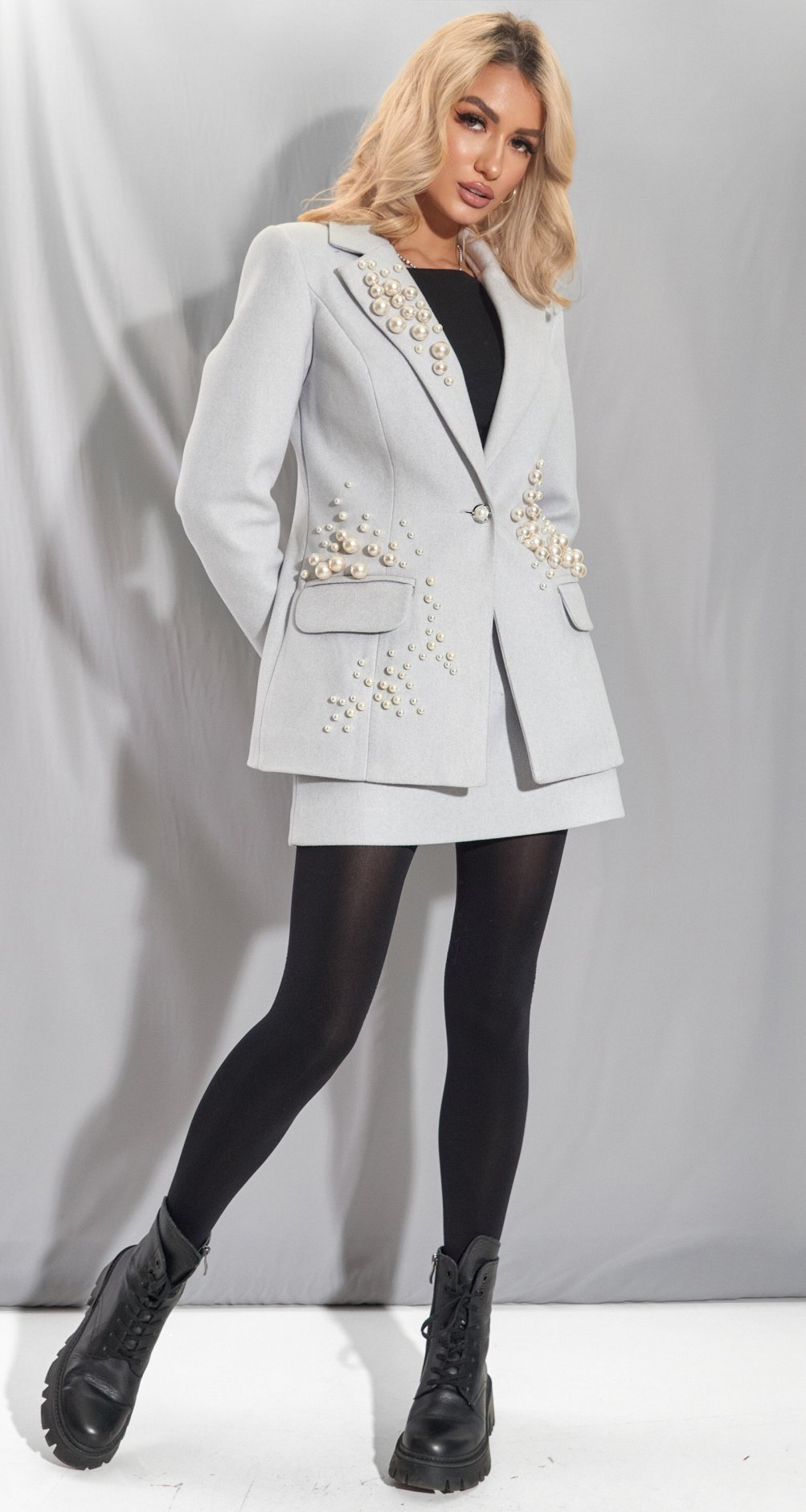 A spectacular suit made of fine cashmere is the perfect combination of comfort and elegance. Pearl decor emphasizes trendiness and adds a touch of sophistication to every look. An elongated jacket and mini-skirt create a stylish silhouette in which you will definitely not go unnoticed. Ideal for those who like to combine classics with fashionable accents.