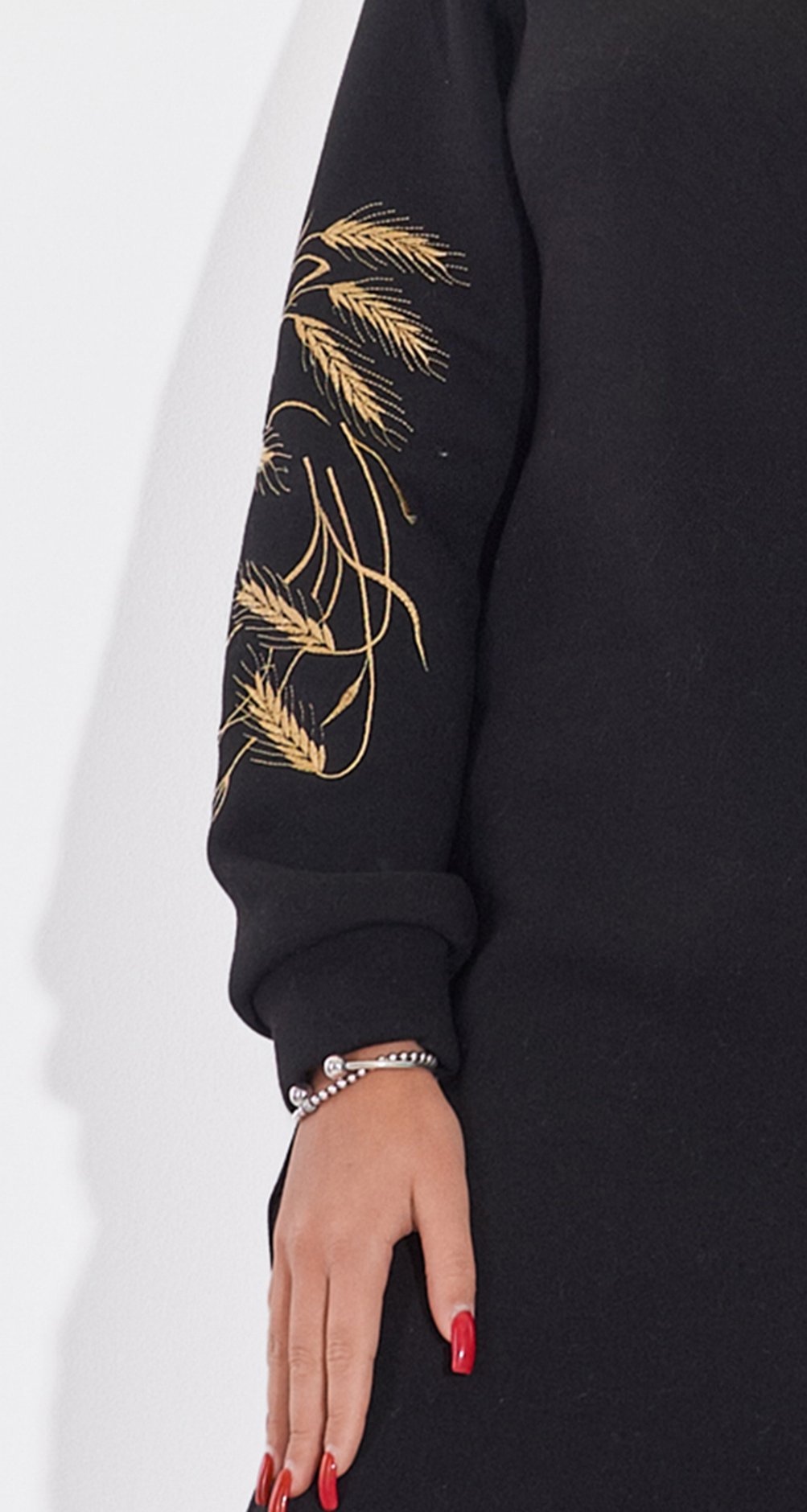 Стильний акцент: Елегантний, стриманий сірий колір ідеально поєднується з трендовою вишивкою колосків золотистого кольору на рукавах. Це не просто декор, а символ благополуччя та українського духу, що додає образу унікальності та глибини.