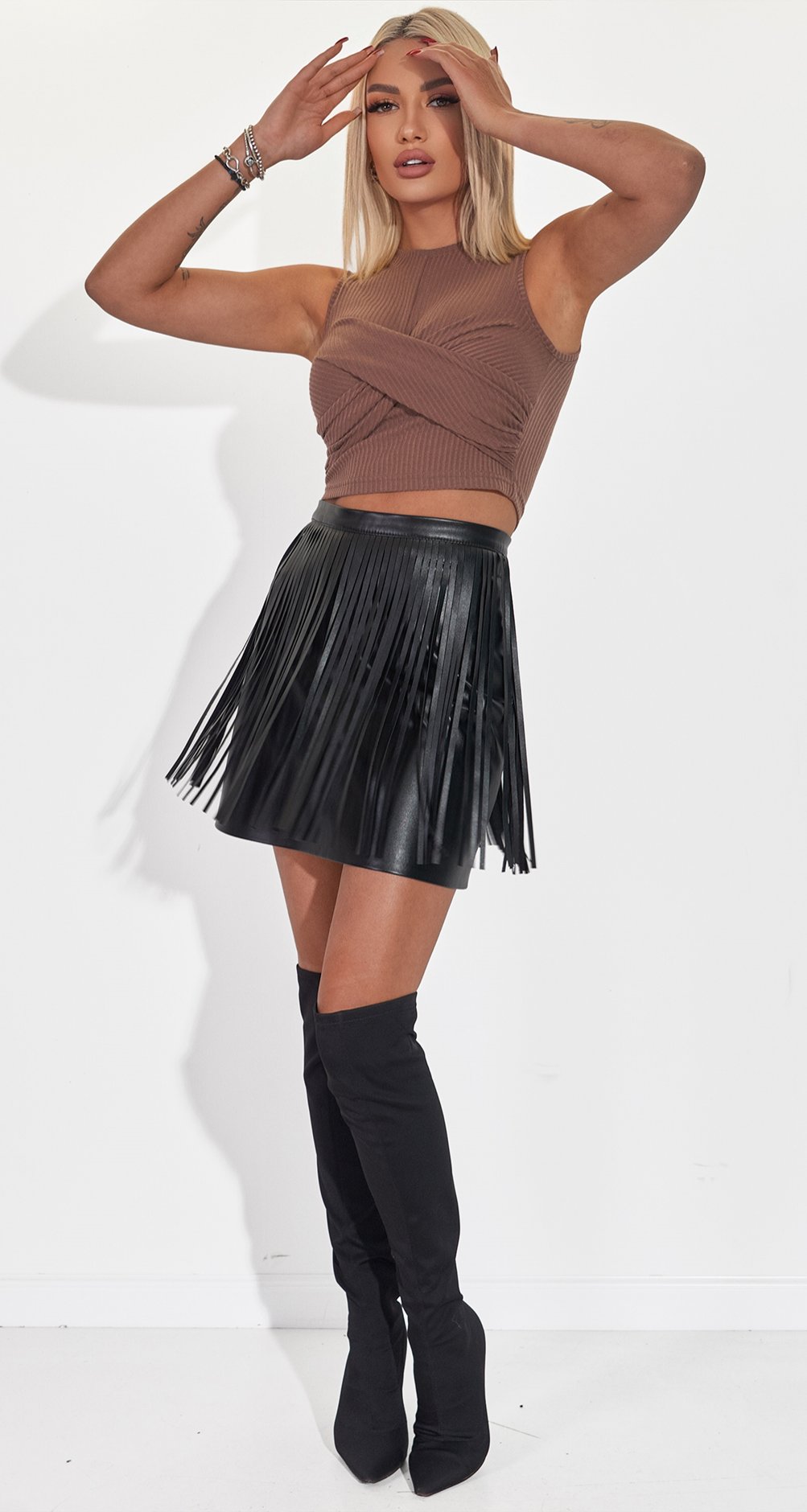 Низь: Шкіряна міні-спідниця (як на фото) або шорти з високою талією.
