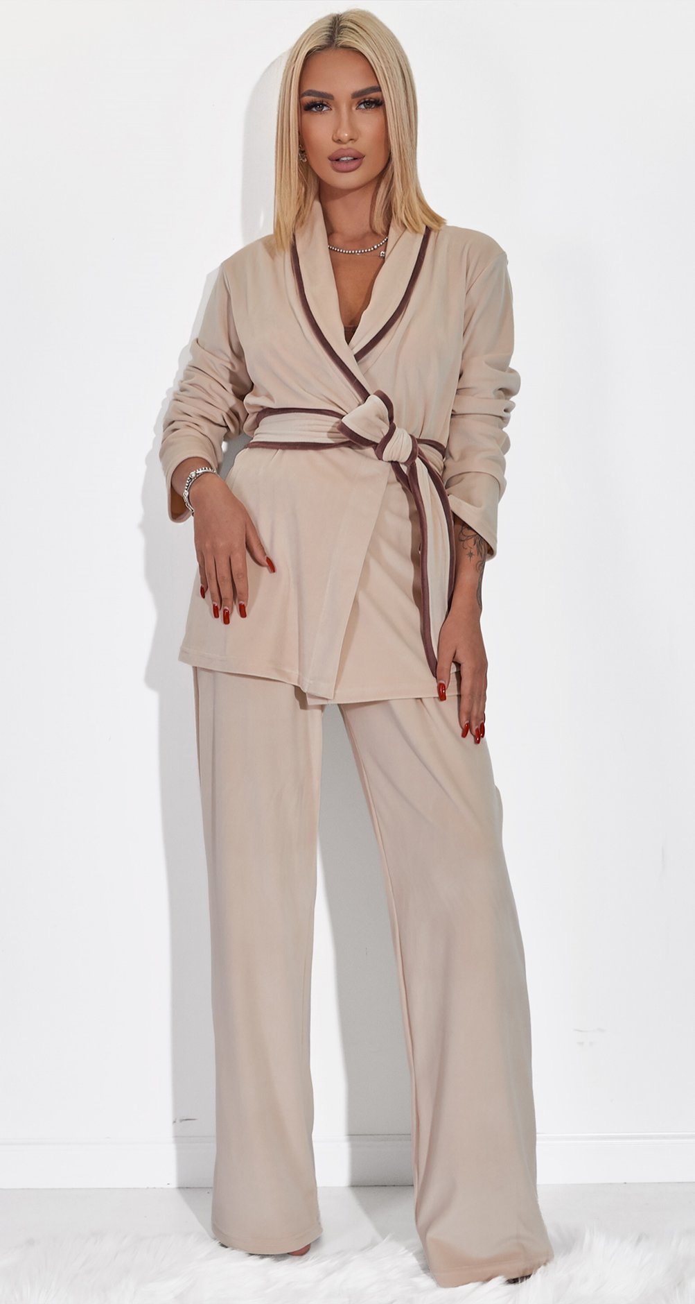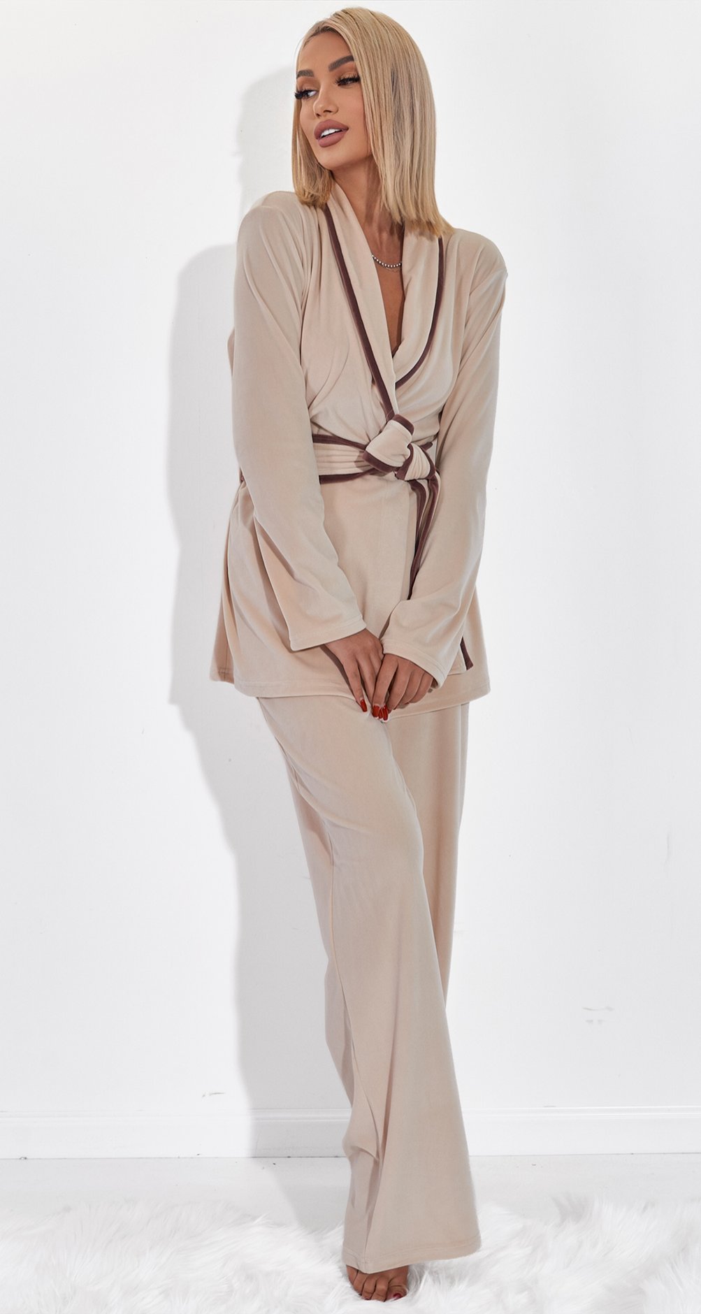 Бездоганний Стиль: Комплект, що складається з штанів зі зручним поясом на гумці і елегантного халата-кімоно з контрастними деталями і поясом, підкреслить вашу жіночність навіть вдома.
