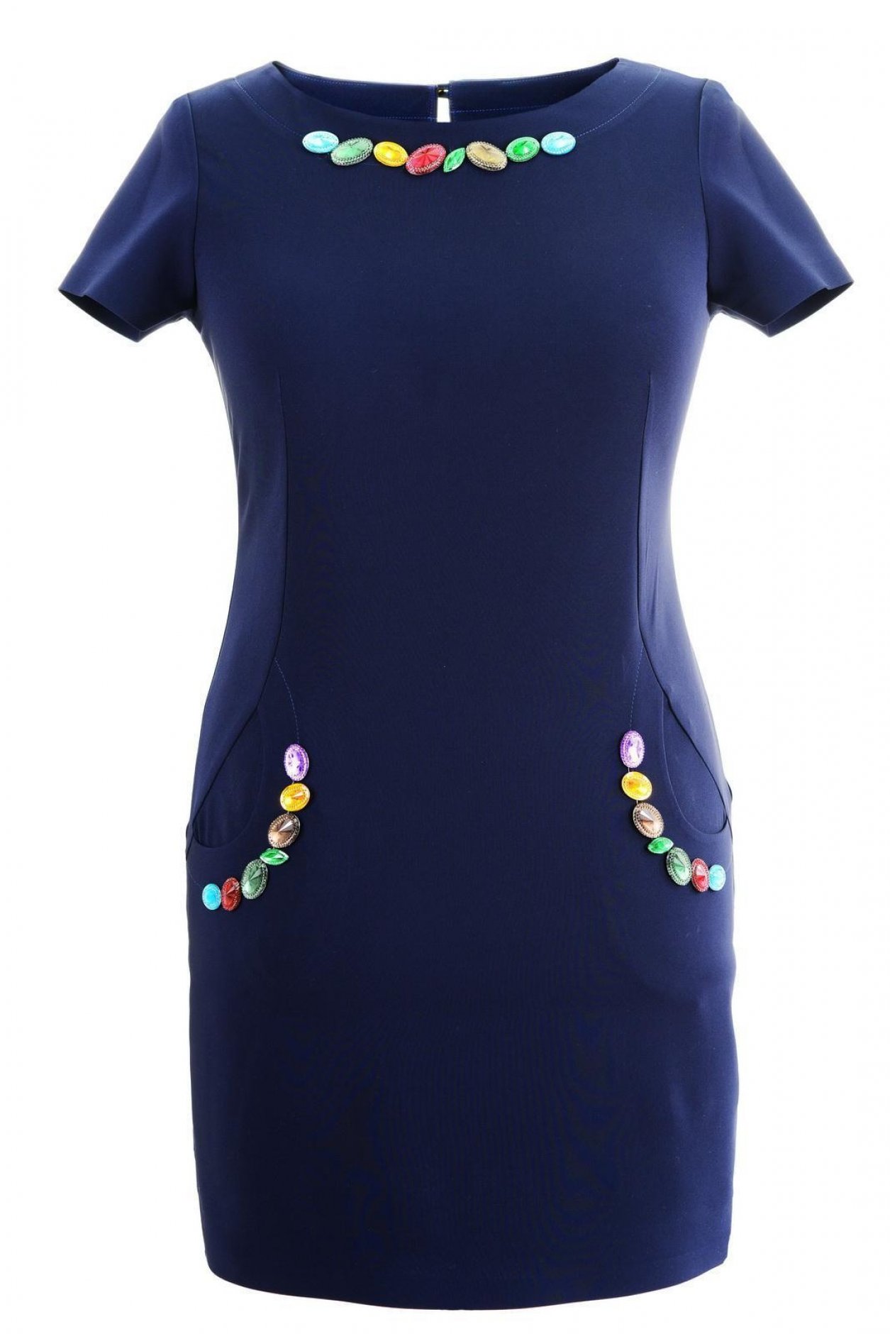 Сукня прикрашена яскравими кристалами у горловини та кишеньок.