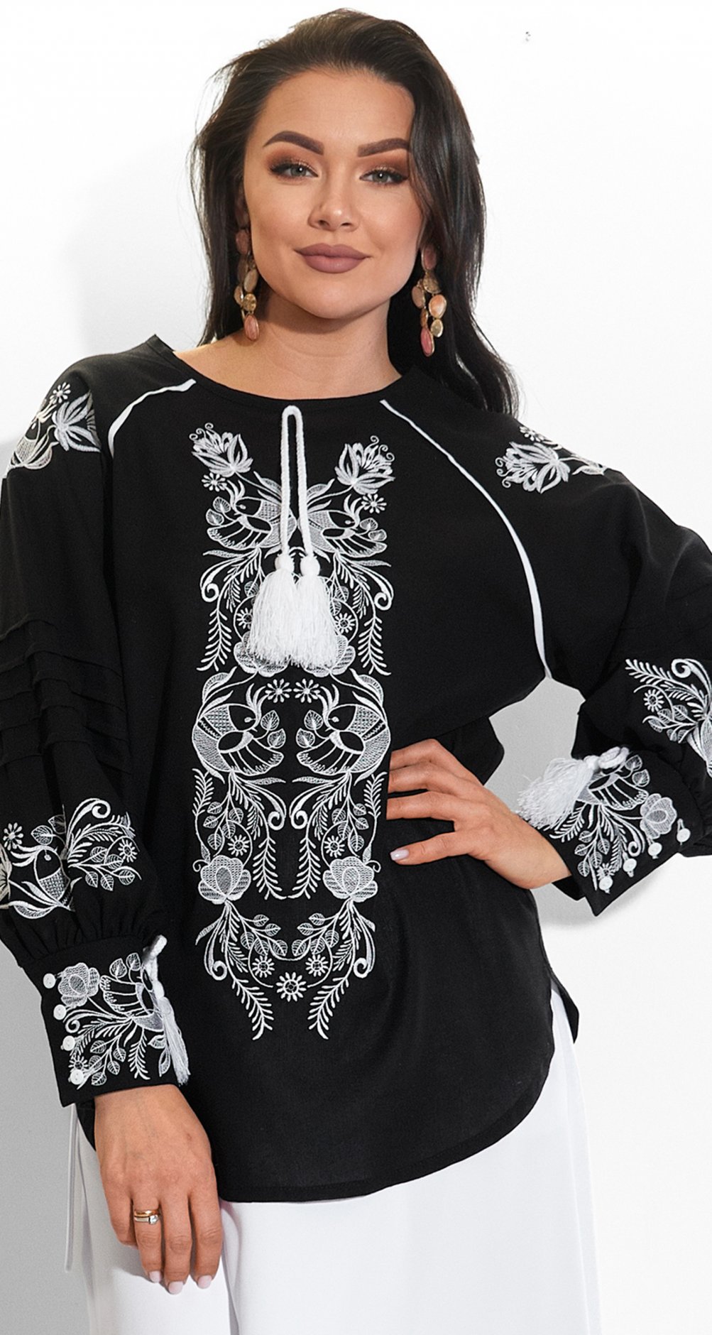 Класичний крій з пишними рукавами та акуратною горловиною забезпечує свободу рухів та універсальність у поєднаннях. Чорно-біла кольорова гама робить цю вишиванку неймовірно практичною для вашого гардеробу. Вона легко комбінується зі спідницями, брюками різних кольорів та фасонів, дозволяючи створювати безліч модних образів – від повсякденних до ошатних.