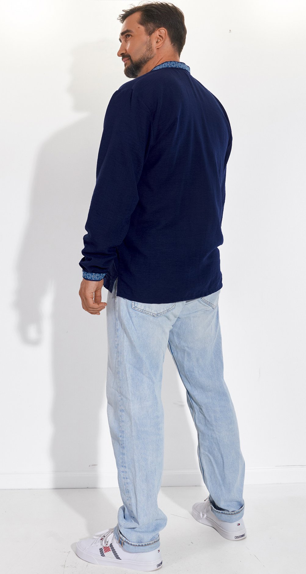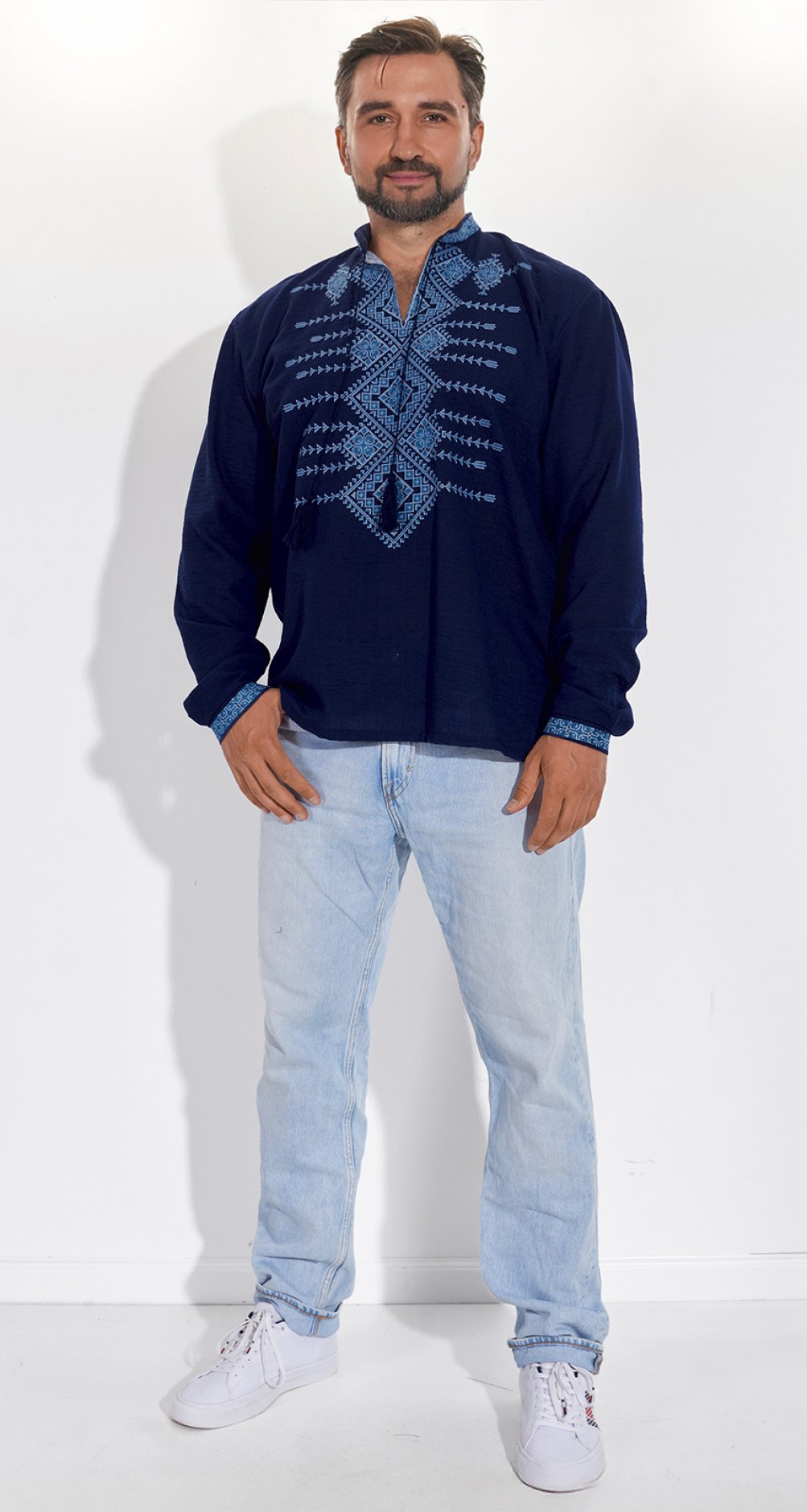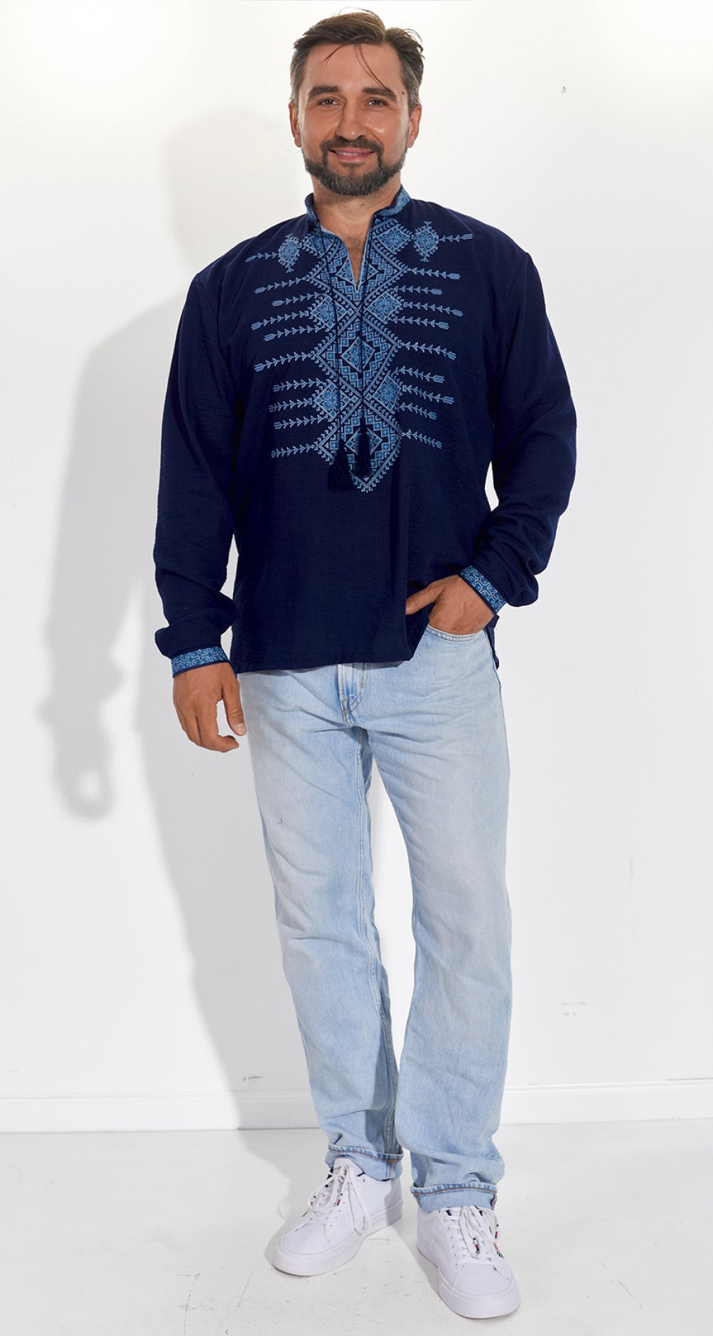 * Гармонічний візерунок: Вишивка виконана у глибоких відтінках синього, що символізує небо, воду та духовність. Геометричні орнаменти, що прикрашають комір, груди та манжети, створюють елегантний та мужній образ.