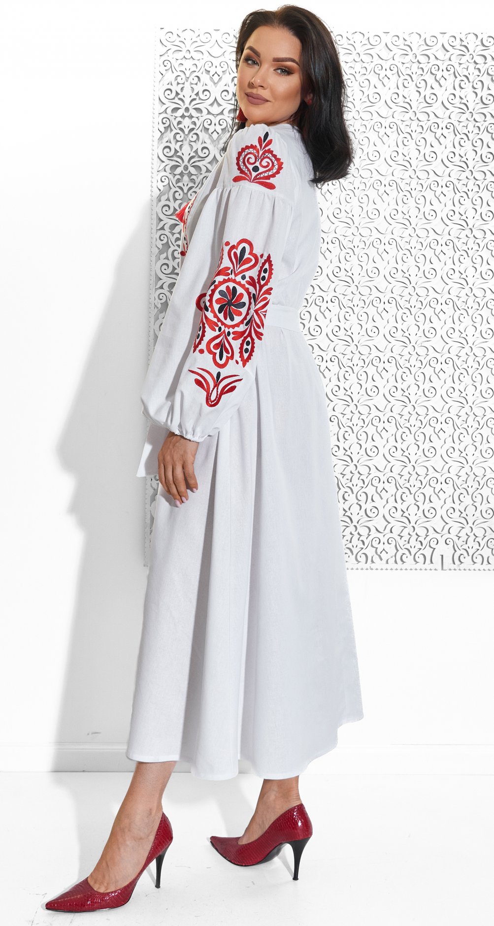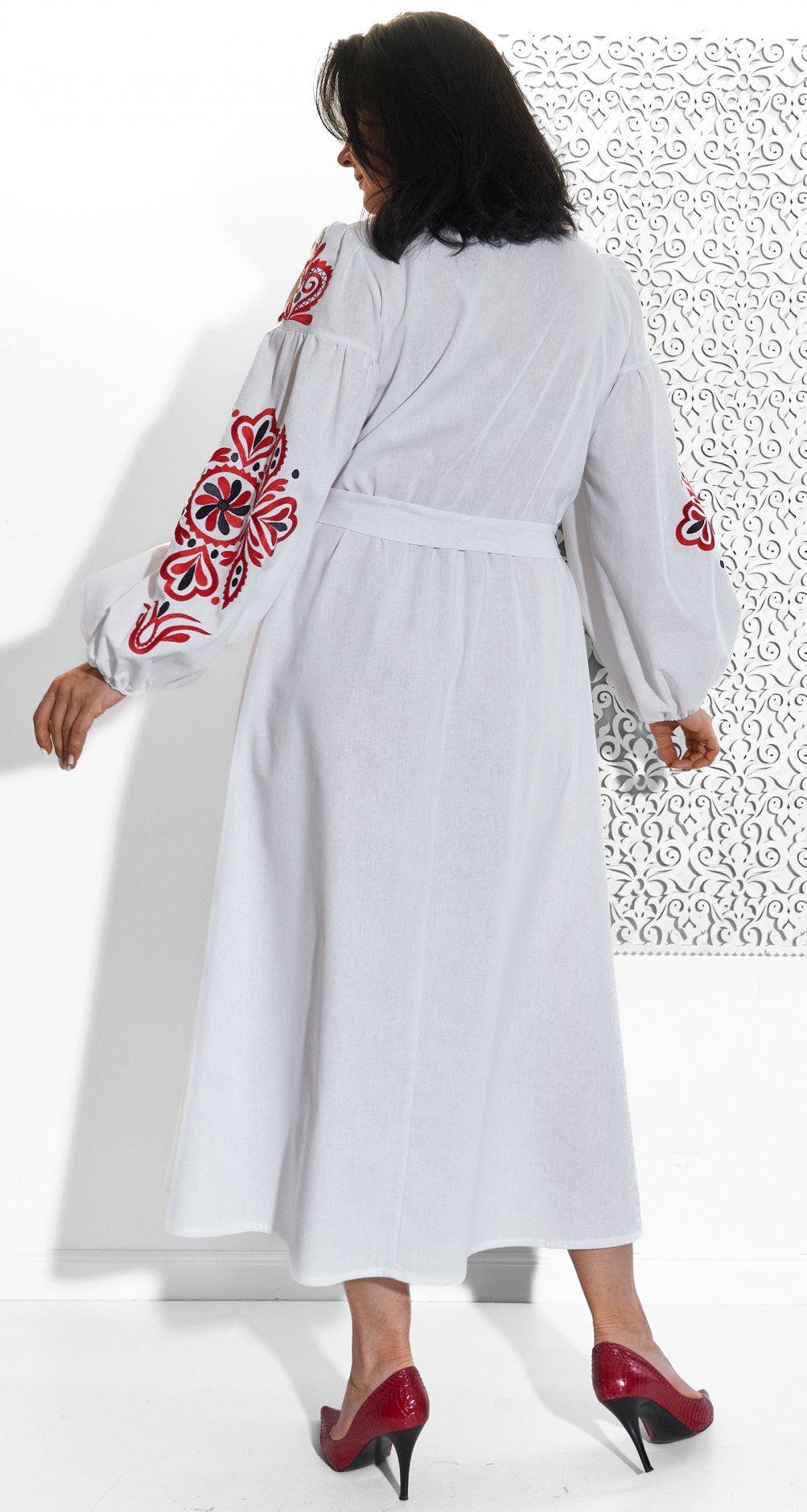 Представляємо вам втілення української душі – лляну сукню міді, прикрашену вручну вишитими мотивами. Натуральний льон забезпечує комфорт та легкість, а червоно-біла кольорова гама вишивки несе у собі глибокий символізм. Пишні рукави зібрані на манжету, а акцент на талії створюється за допомогою пояса в тон. Ця сукня стане яскравим акцентом вашого гардеробу, поєднуючи культурну спадщину і сучасні тенденції.