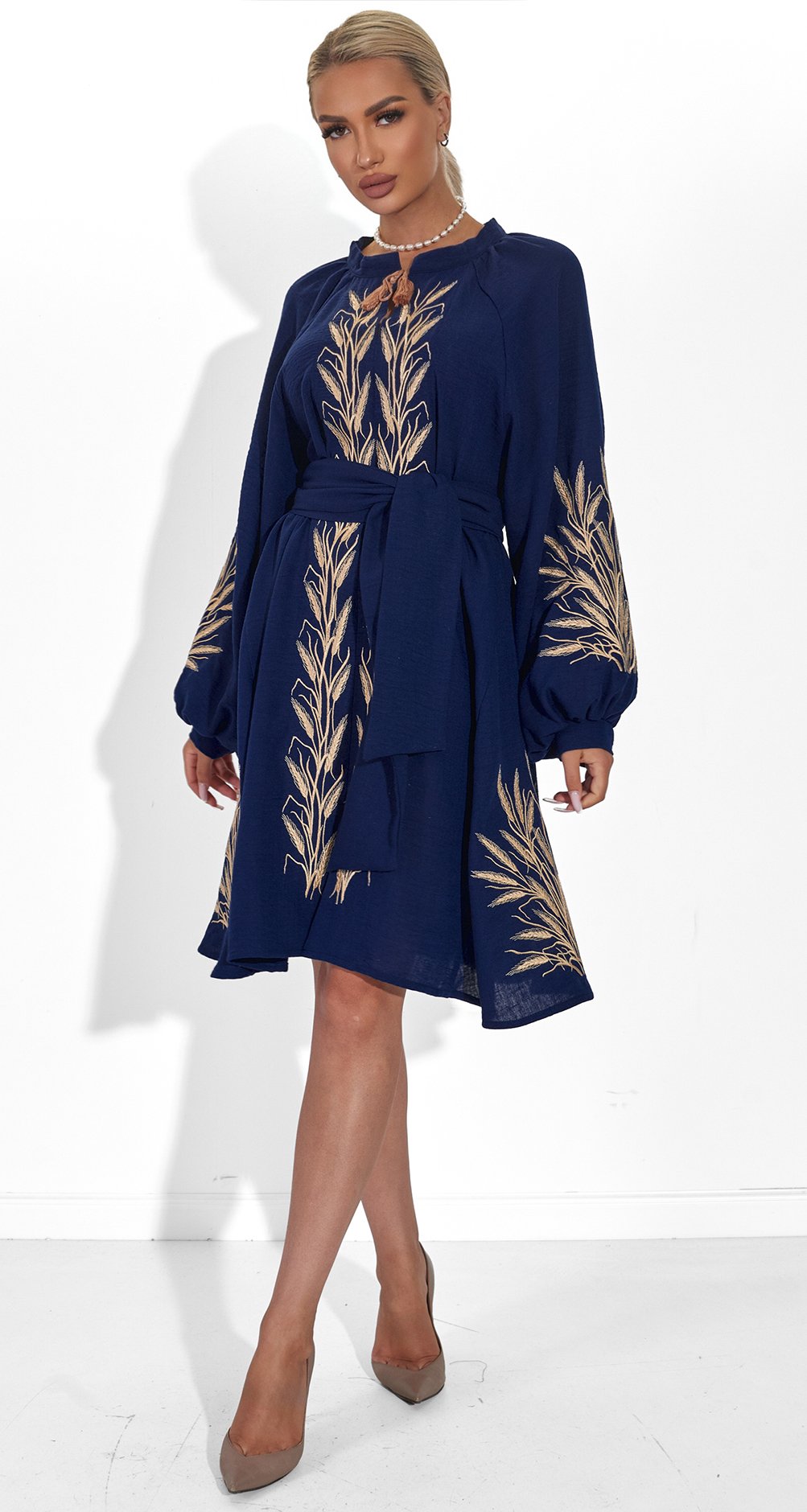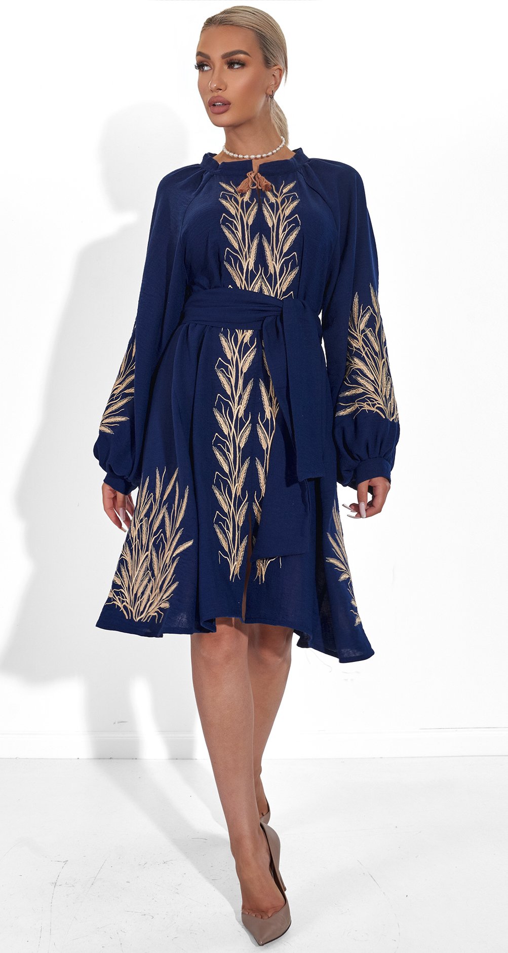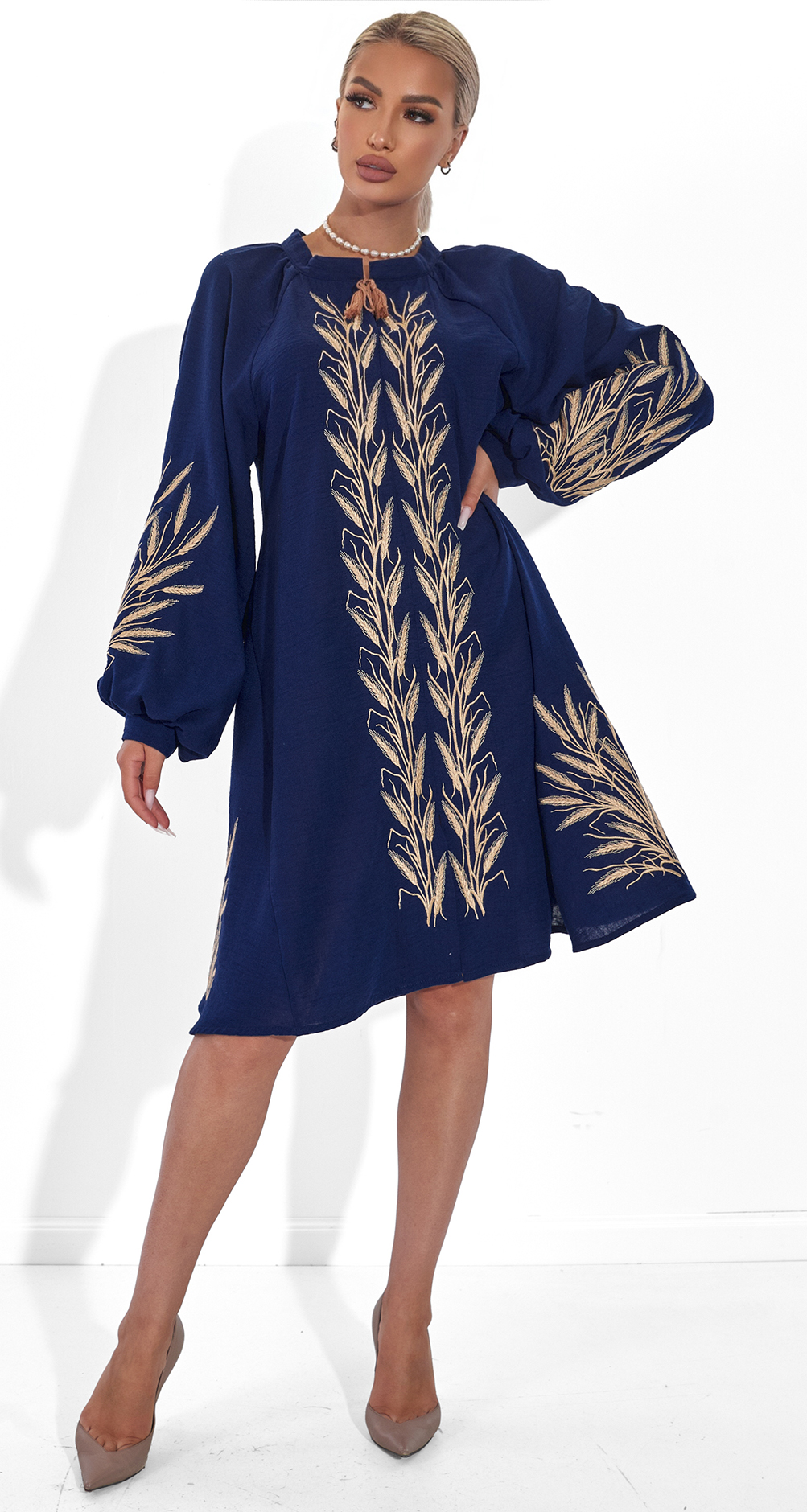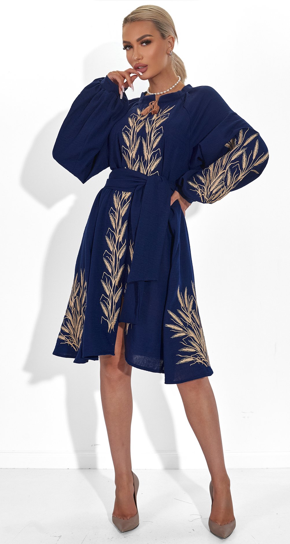 * Вишукана вишивка: Сукня прикрашена золотистою вишивкою у вигляді колосків, що символізує багатство і родючість.