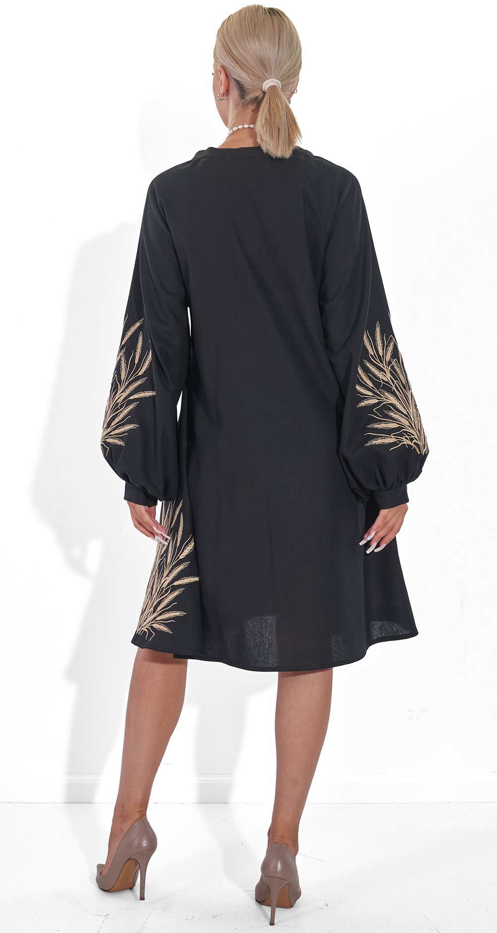 * Вишукана вишивка: Сукня прикрашена золотистою вишивкою у вигляді колосків, що символізує багатство і родючість.
