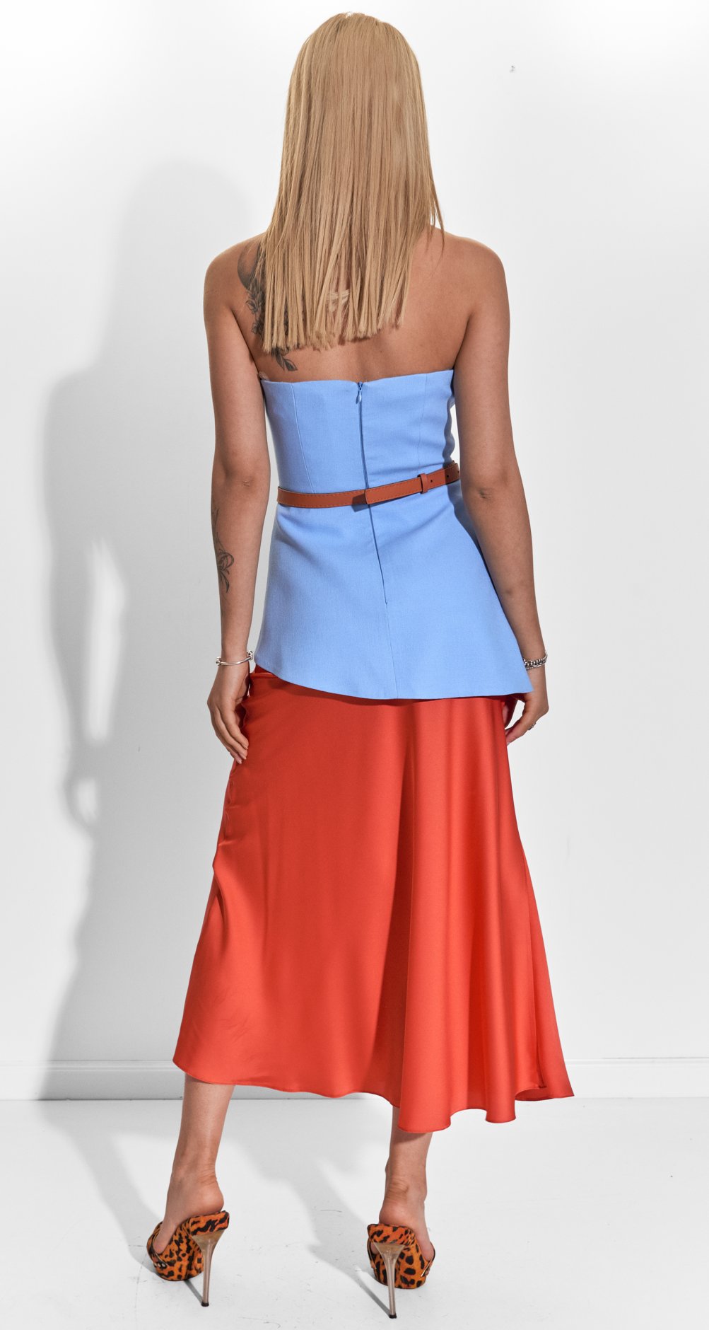 Цей лляний корсет з асиметричним низом – втілення витонченого стилю та сучасного шику. Білий колір, чіткий силует та витончене розширення від талії створюють візуально стрункий та гармонійний образ. Він легко вписується як у вечірні виходи, так і стильний повсякденний образ.