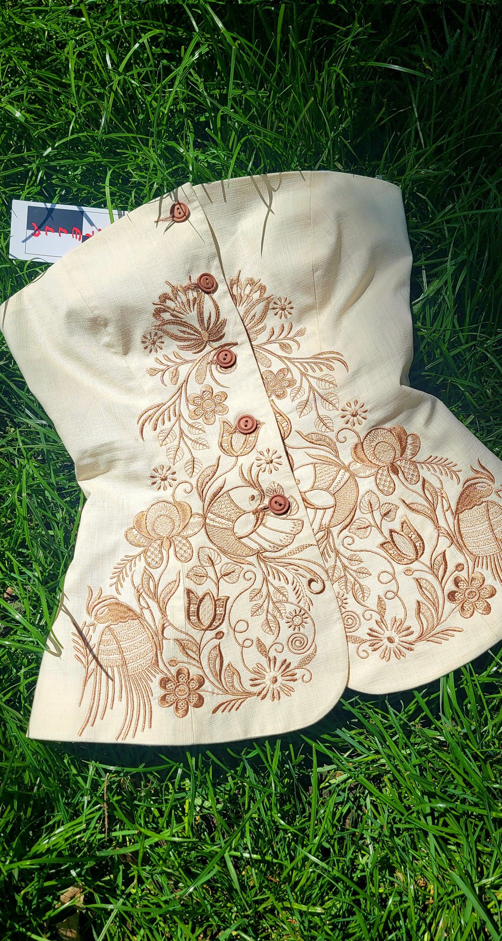 Відчуйте дотик природи з нашим лляним корсетом, прикрашеним неповторною вишивкою. Дихаючий льон подарує вам відчуття легкості, а м'яка бавовняна підкладка забезпечить комфорт на весь день. Ідеальний вибір для тих, хто цінує натуральні матеріали та вишуканий стиль.