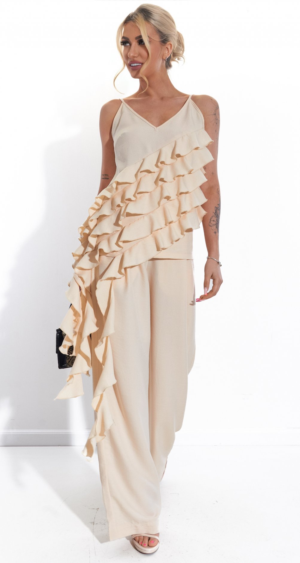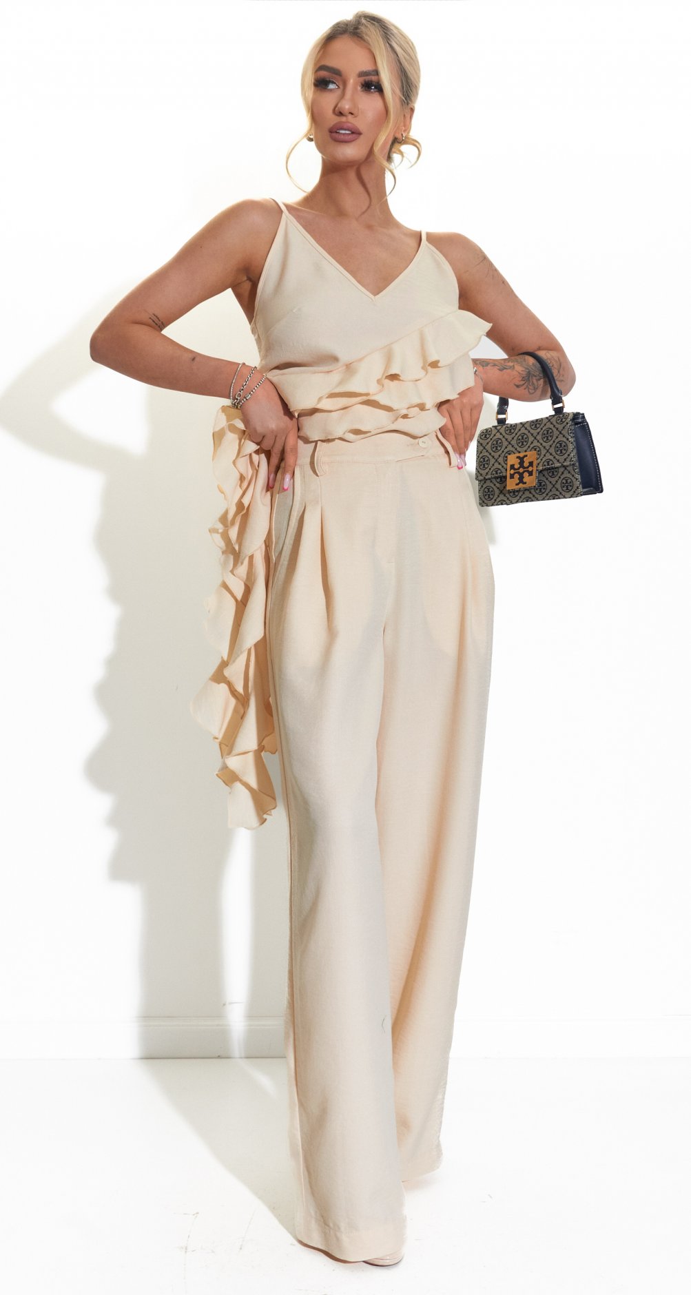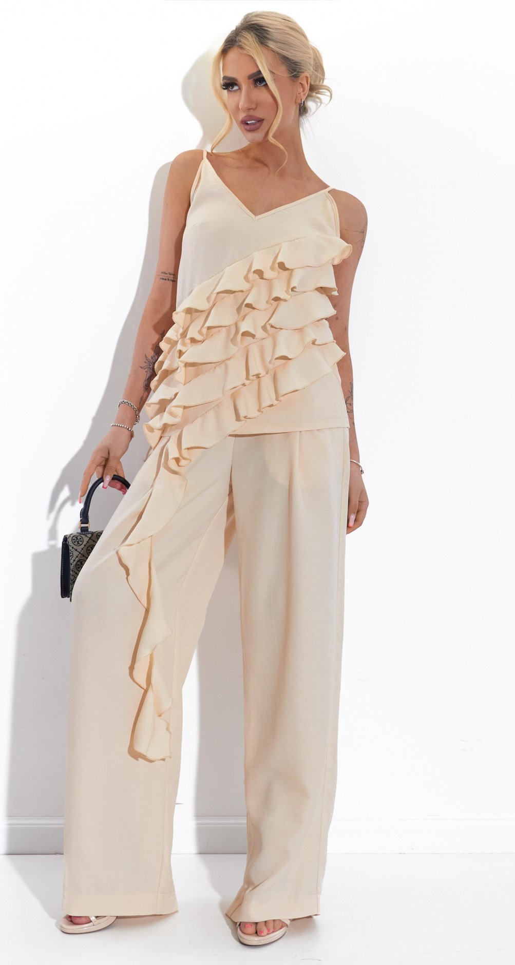 Повітряний топ з каскадом ніжних воланів додасть вашому образу романтичності та жіночності, м'яко струмуючи при кожному русі. Широкі штани-палаццо, немов шовковий вітер, подарують вам неймовірний комфорт та свободу.