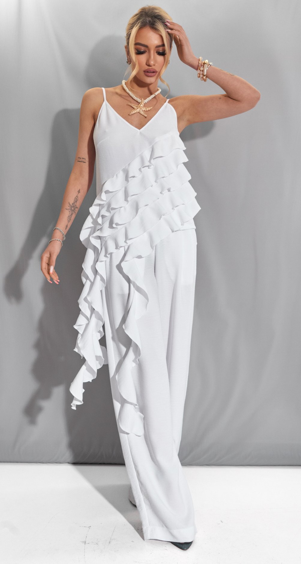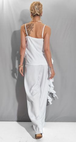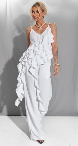 Повітряний топ з каскадом ніжних воланів додасть вашому образу романтичності та жіночності, м'яко струмуючи при кожному русі. Широкі штани-палаццо, немов шовковий вітер, подарують вам неймовірний комфорт та свободу.