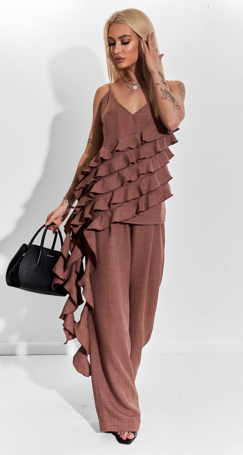 Повітряний топ з каскадом ніжних воланів додасть вашому образу романтичності та жіночності, м'яко струмуючи при кожному русі. Широкі штани-палаццо, немов шовковий вітер, подарують вам неймовірний комфорт та свободу.