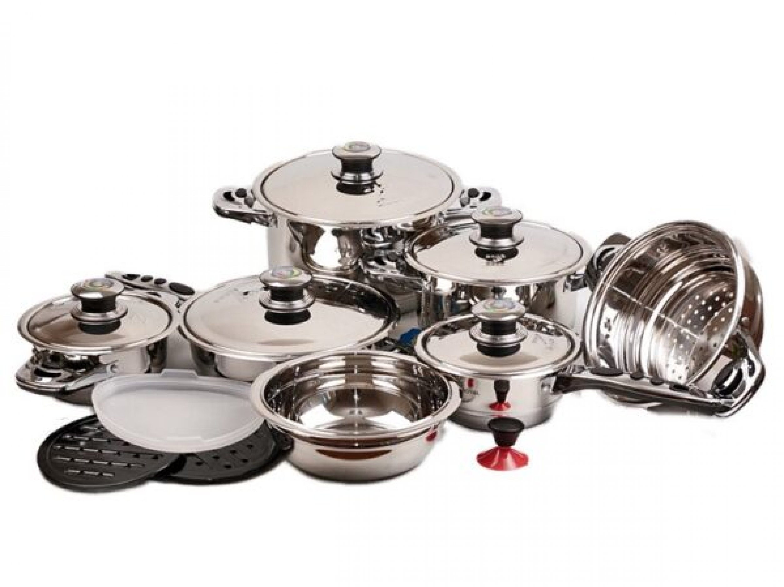 - Ковшик об'ємом 1,6 л + кришка з термометром - 3,1-літрова каструля + кришка з термометром - велика каструля ємністю 6,3 л + кришка з термометром - 1,8 л каструля + кришка з термометром - 2,9 лі + кришка з термометром – 2 підставки для каструль – миска з пластиковою кришкою – кошик з ручкою для смаження – присоска для кришок. Цей набір можна використовувати на всіх типах плит: газових, електричних, індукційних, керамічних плит, інфрачервоних та інших. Ручки не нагріваються і легко мити їх і в посудомийній машині. Виготовлений із нержавіючої сталі преміум якості, рекомендованої фахівцями зі здорового харчування, оскільки під час приготування шкідливі для організму речовини не потрапляють до організму. Завдяки накопиченню тепла, що розподіляється всередині страви, їжа рівномірно піддається тепловій обробці, що дозволяє готувати її з мінімальною кількістю жиру та зменшеною кількістю води. Це скорочує час приготування і тим самим заощаджує енергію.