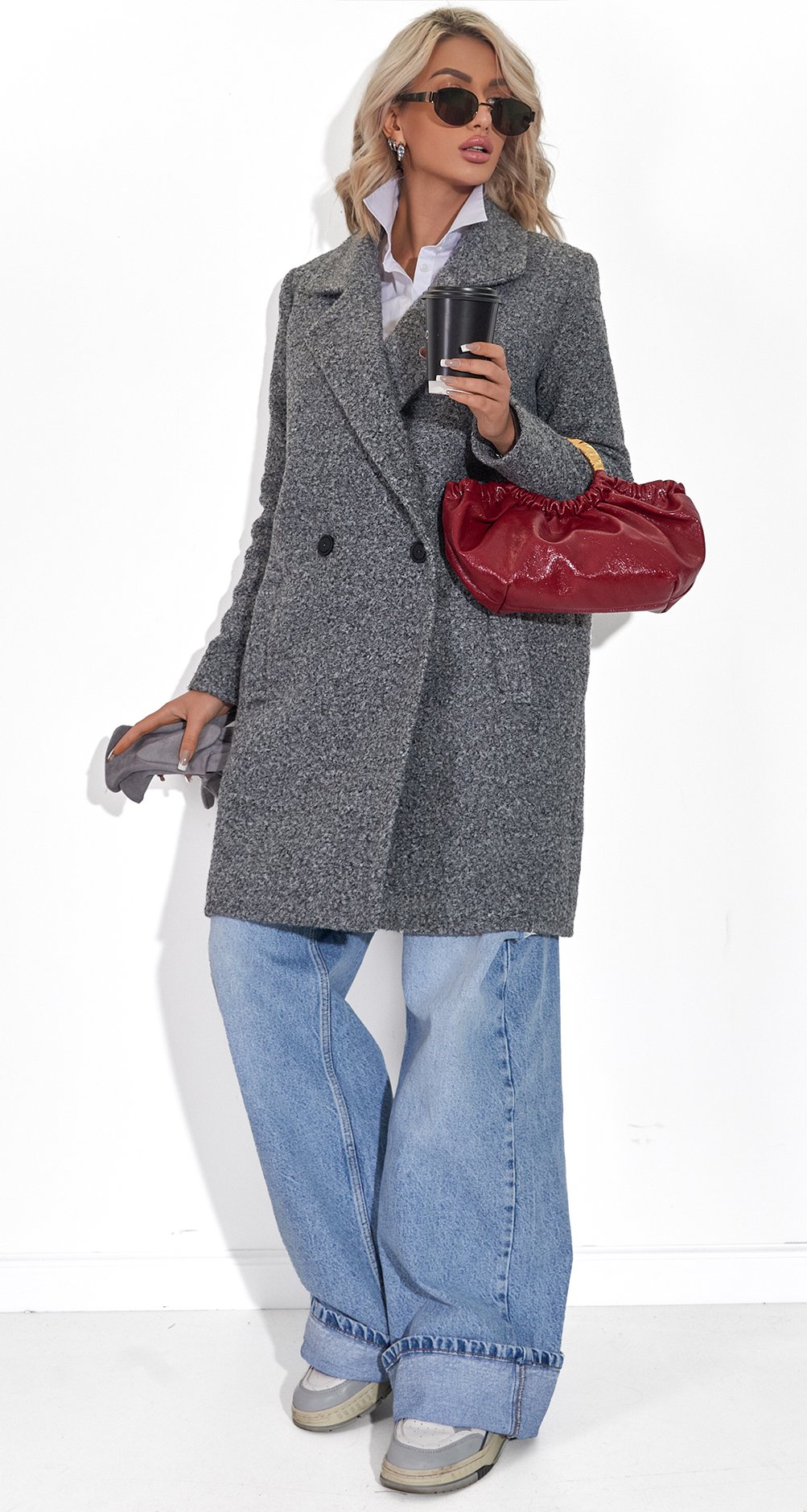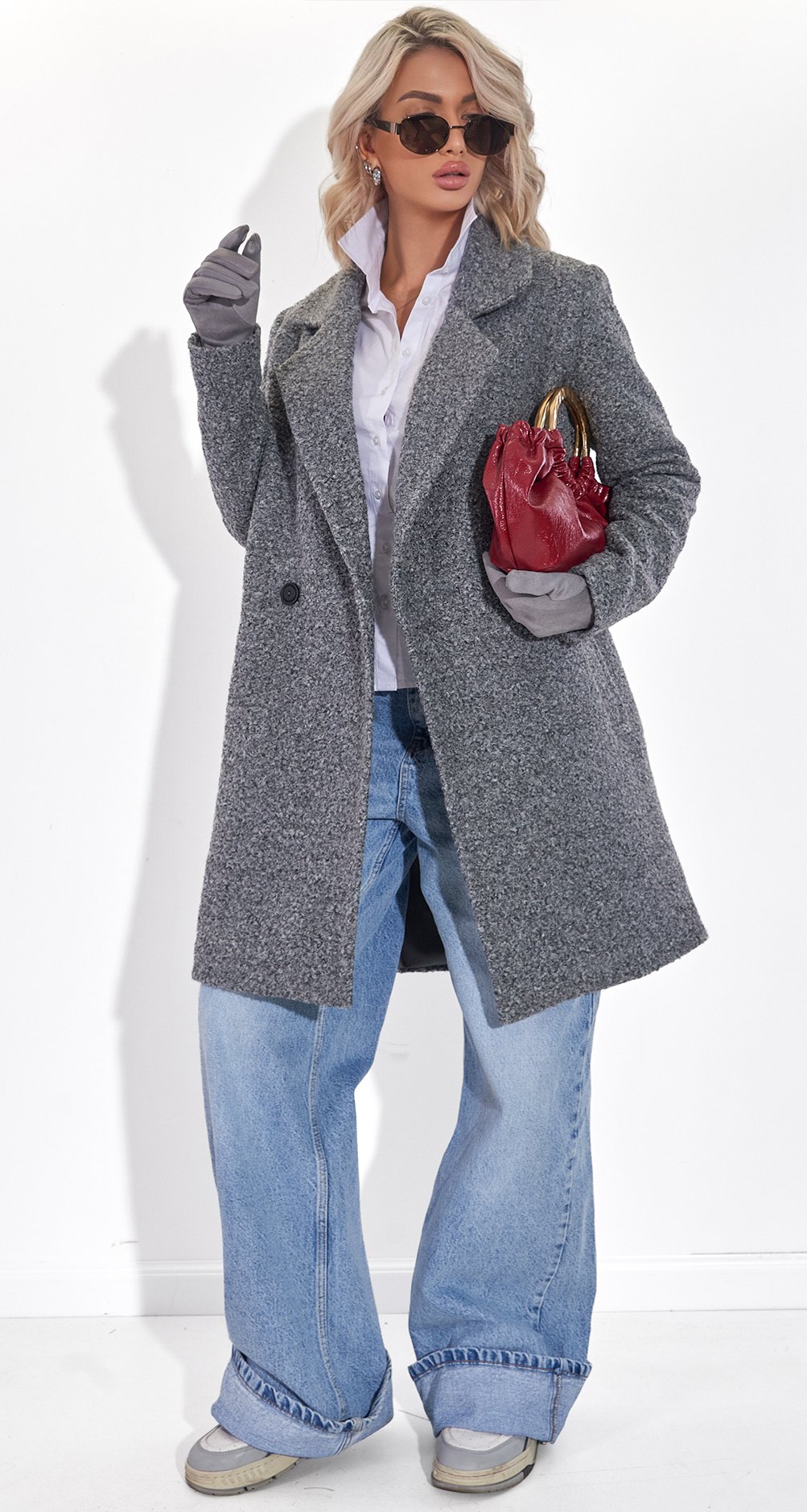 Приваблива текстура Увага: Забудь про гладкі тканини! Це пальто має топову фактуру - дрібні "баранчики" або петельки, які виглядають дорого і надають обсягу. Стильний сірий меланж, який ідеально комбінується з усім: від яскравих сумок (як цей hot red!❤️) до класичних джинсів.