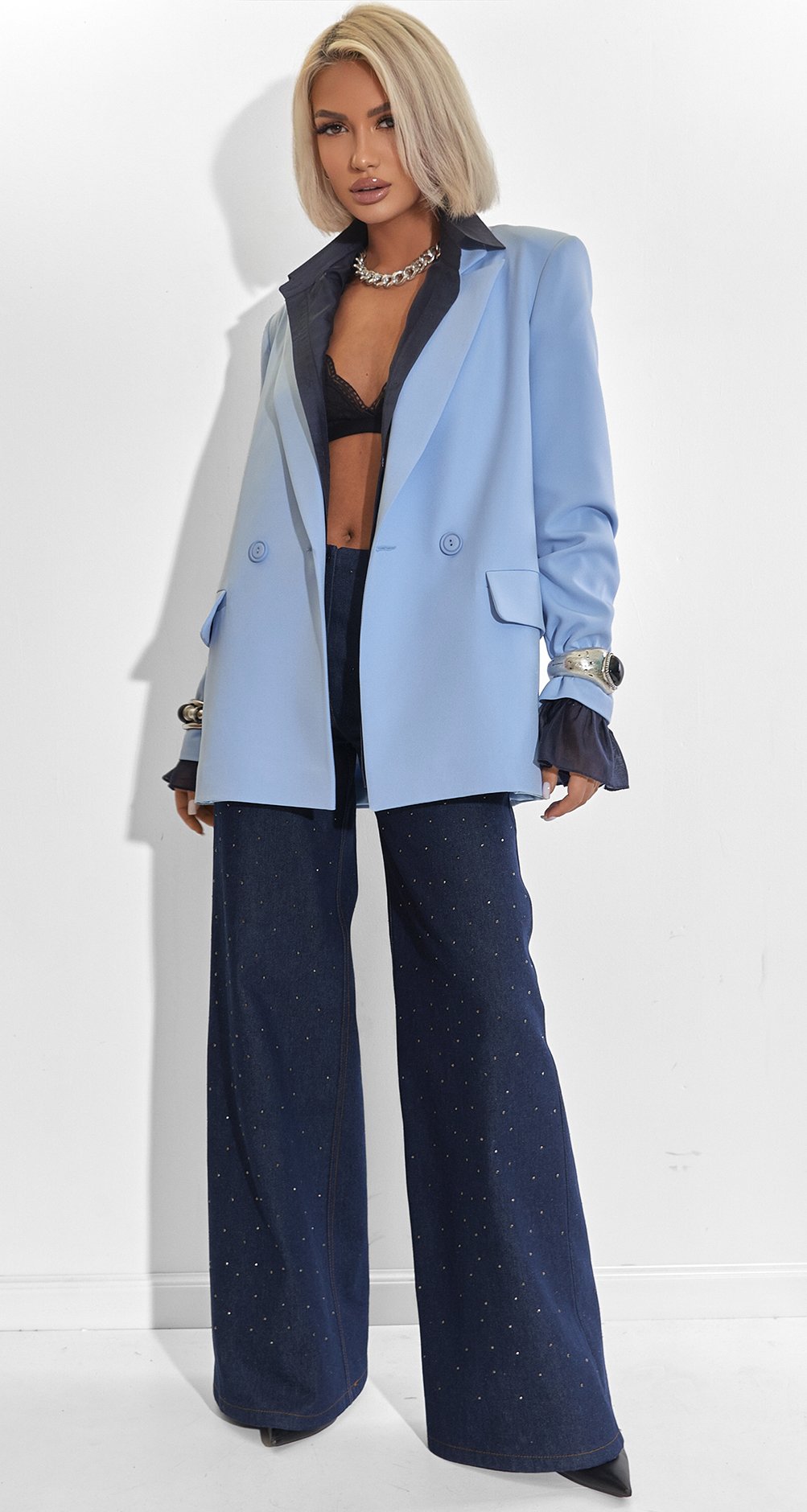 Для створення по-справжньому ефектного образу доповніть його нашими джинсами зі стразами та контрастною блузою, як на фото. Піджак чудово виглядає з легкими сукнями або класичними брюками.