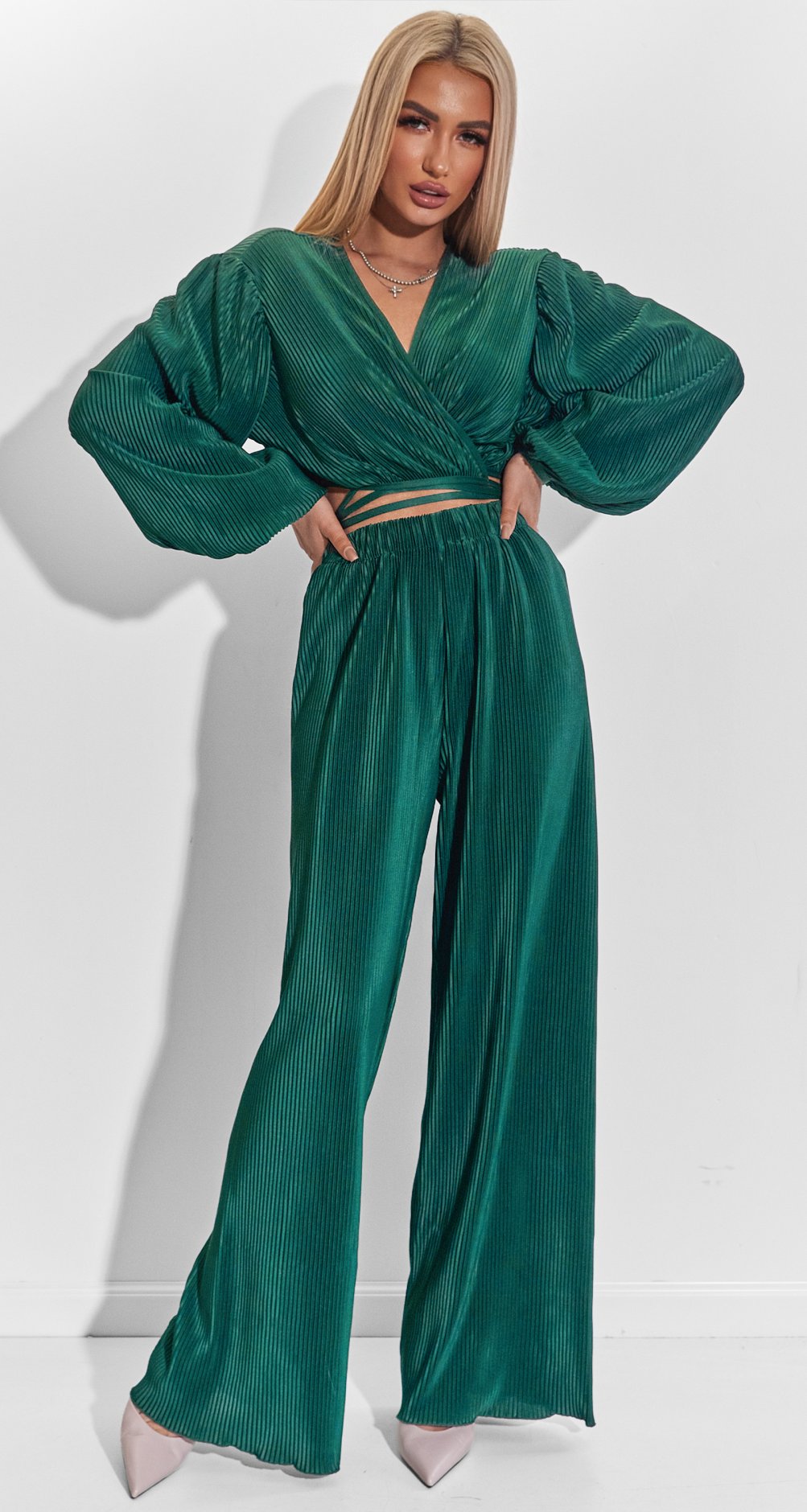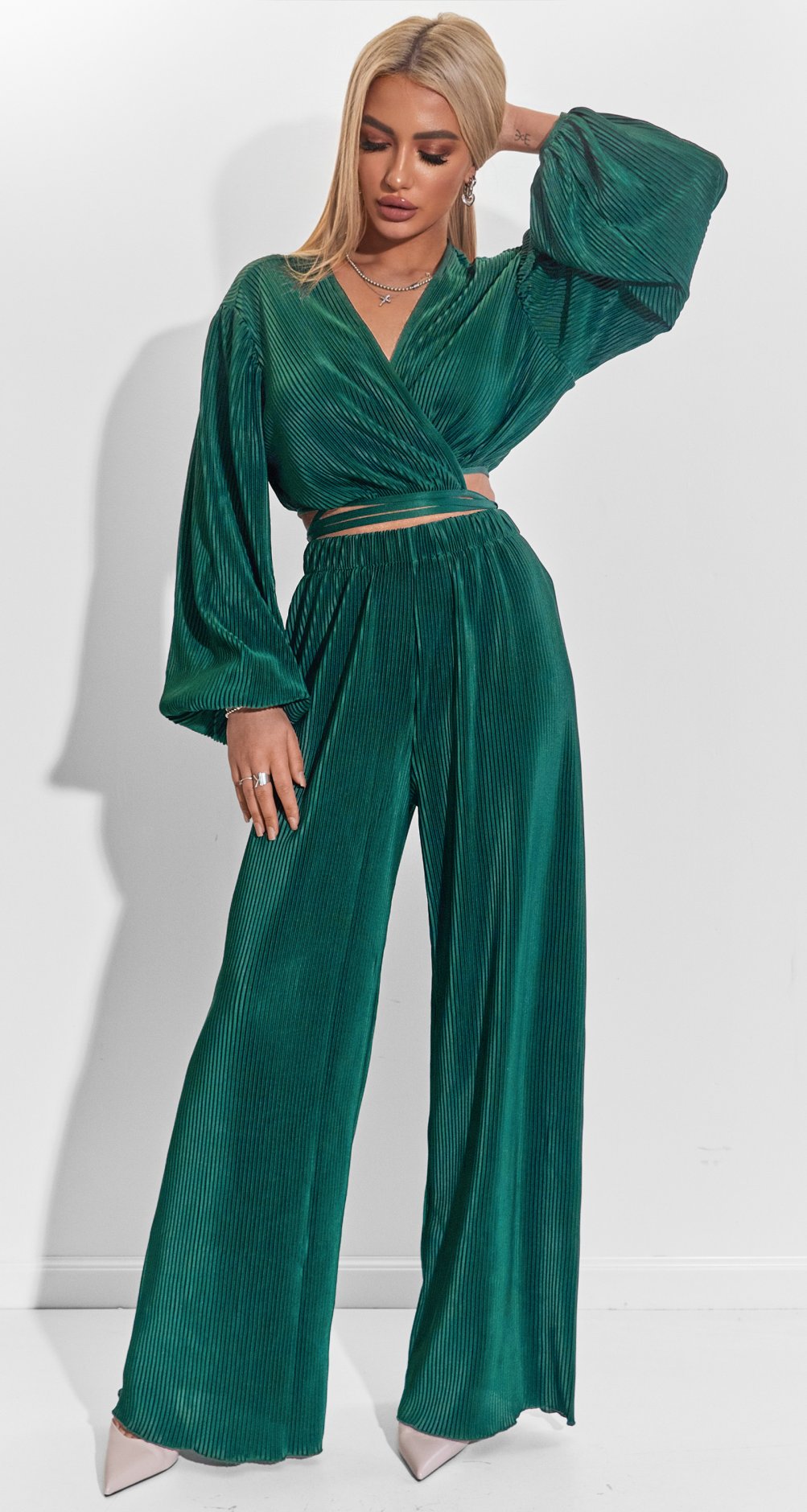 Цей комплект, що складається з елегантного укороченого топу із запахом та широких штанів, створює неймовірно жіночний та витончений образ. М'яка плісирована тканина ніжно обволікає фігуру, даруючи відчуття легкості та свободи рухів.
