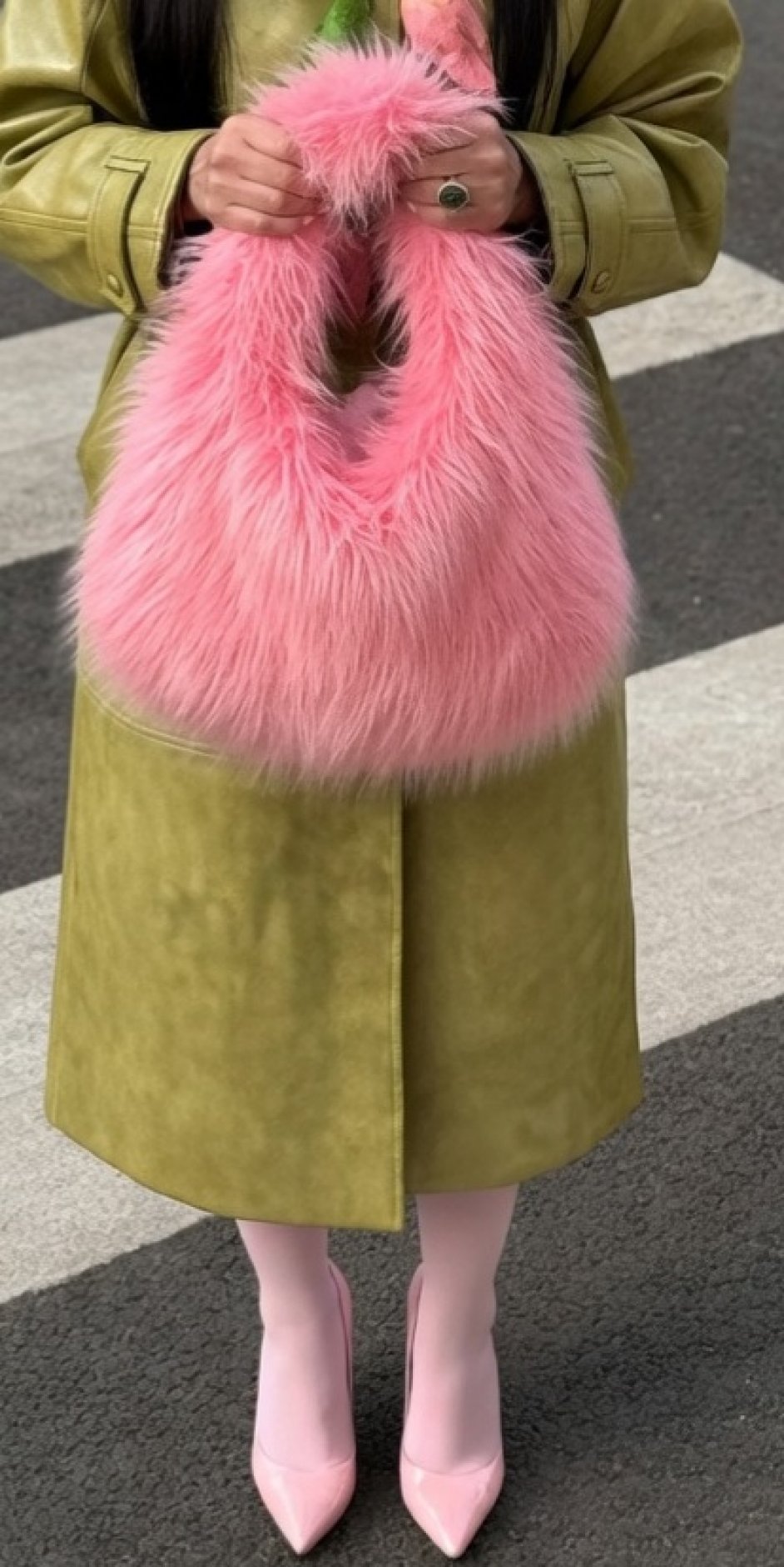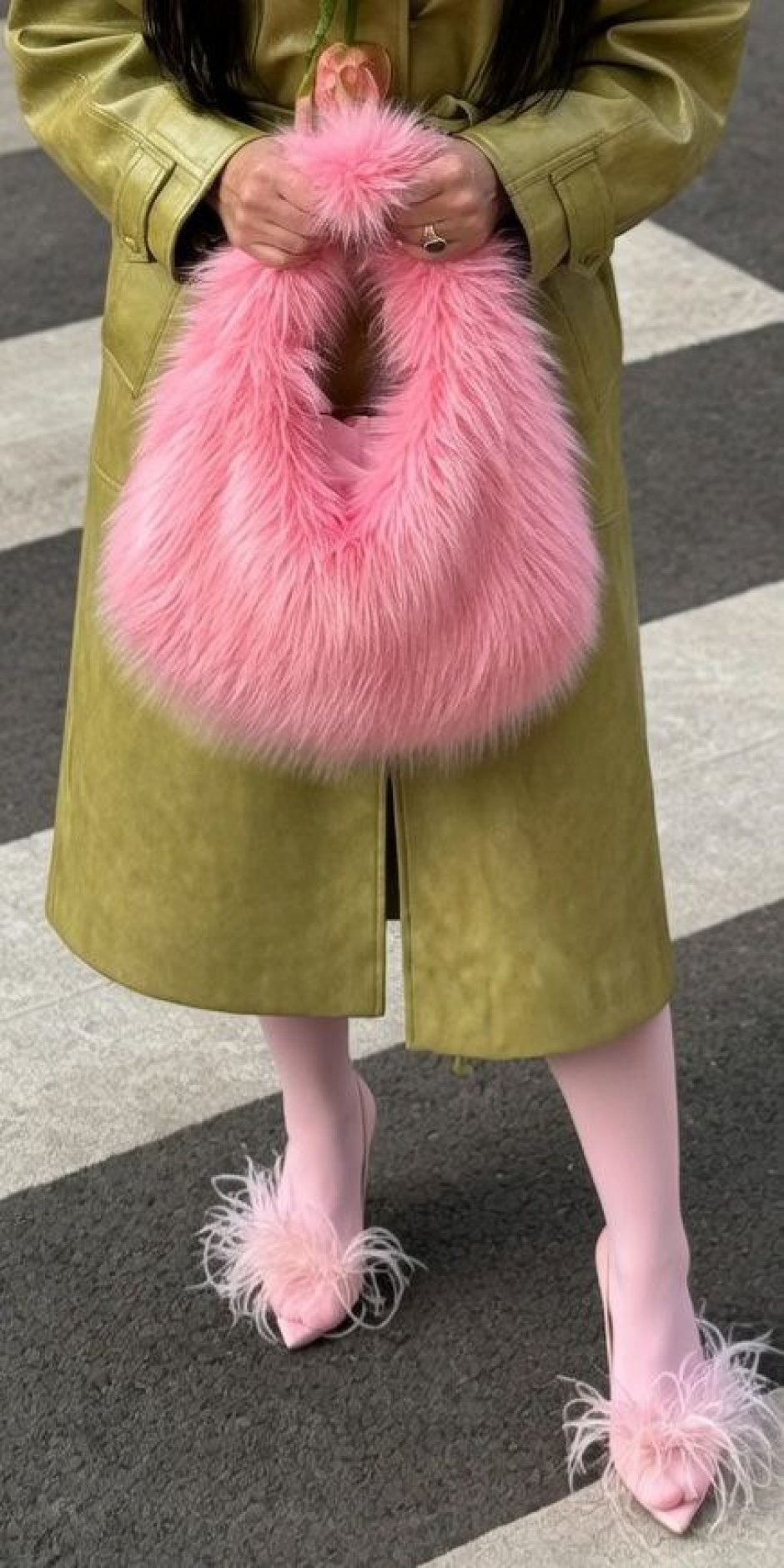 Як видно на фото, вона неймовірно круто виглядає з верхнім одягом оливкових або пастельних тонів, створюючи ультрамодний колор-блок.