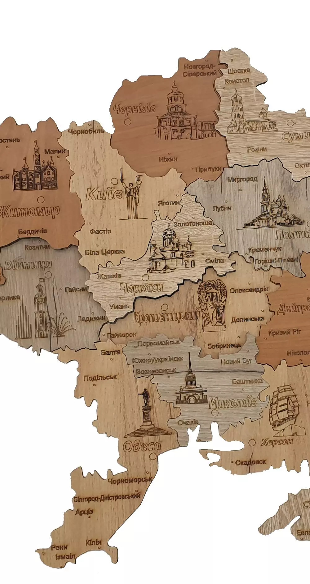 Интерьерная деревянная карта Украины разнообразит пространство дома, дачи или офиса, лучше чем наклейка для стены. Украсит стены кухни или комнаты (спальни, гостиной) и придаст уют. Размер карты Украины :58*38,100*67,150*100,200*134,250*165 см. Карта из дерева (ХДФ) — легкая, быстро собирается как пазлы и прекрасно крепится на стену двусторонним скотчем-на вспененной основе . При желании карту можно без труда снять при помощи канцелярского ножа, подцепив по контуру. Гладкую поверхность декора протирайте влажной тряпочкой, напечатанный лазером рисунок не потеряет яркость и вид.Выбираете карту мираУкраины просто так для себя? Гости непременно заметят стильную декорацию! А также карта Украины с границами областей станет интерактивным атрибутом для учебы и детских игр. Ищете идеальный подарок? И женщинам, и мужчинам приятно получить оригинальный презент. Карту можно подарить как родным: маме, папе, мужу, жене, дедушке, бабушке, брату, сестре или ребенку, так и девушке, парню, другу, подруге, коллеге, учителю, воспитателю, начальнику. .Лучшая идея для новогоднего сюрприза детям и взрослым к новому году!