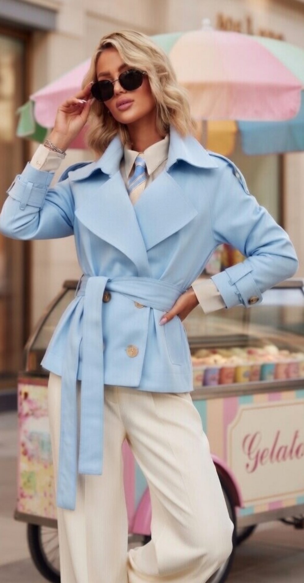 Этот кроп-тренч в классическом голубом оттенке — идеальное прочтение современной классики. Он сочетает в себе эстетику традиционного тренчкота и дерзкий укороченный силуэт, который визуально удлиняет ноги и делает образ невероятно динамичным.