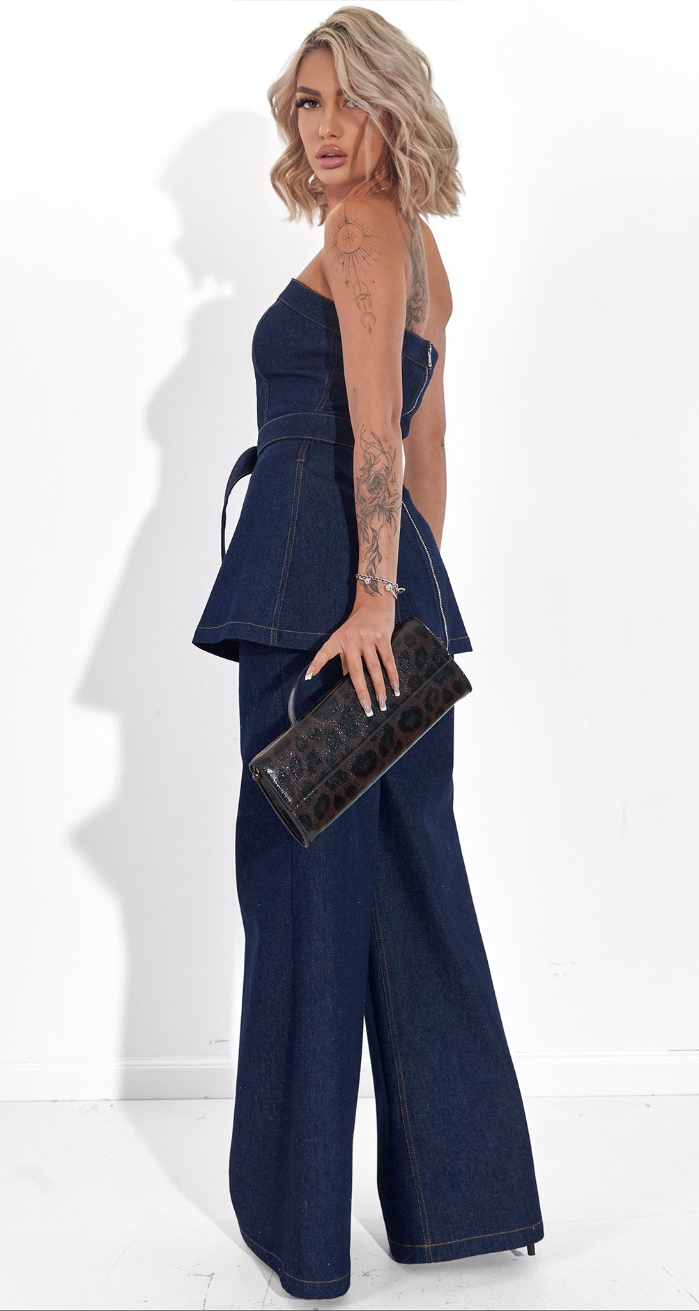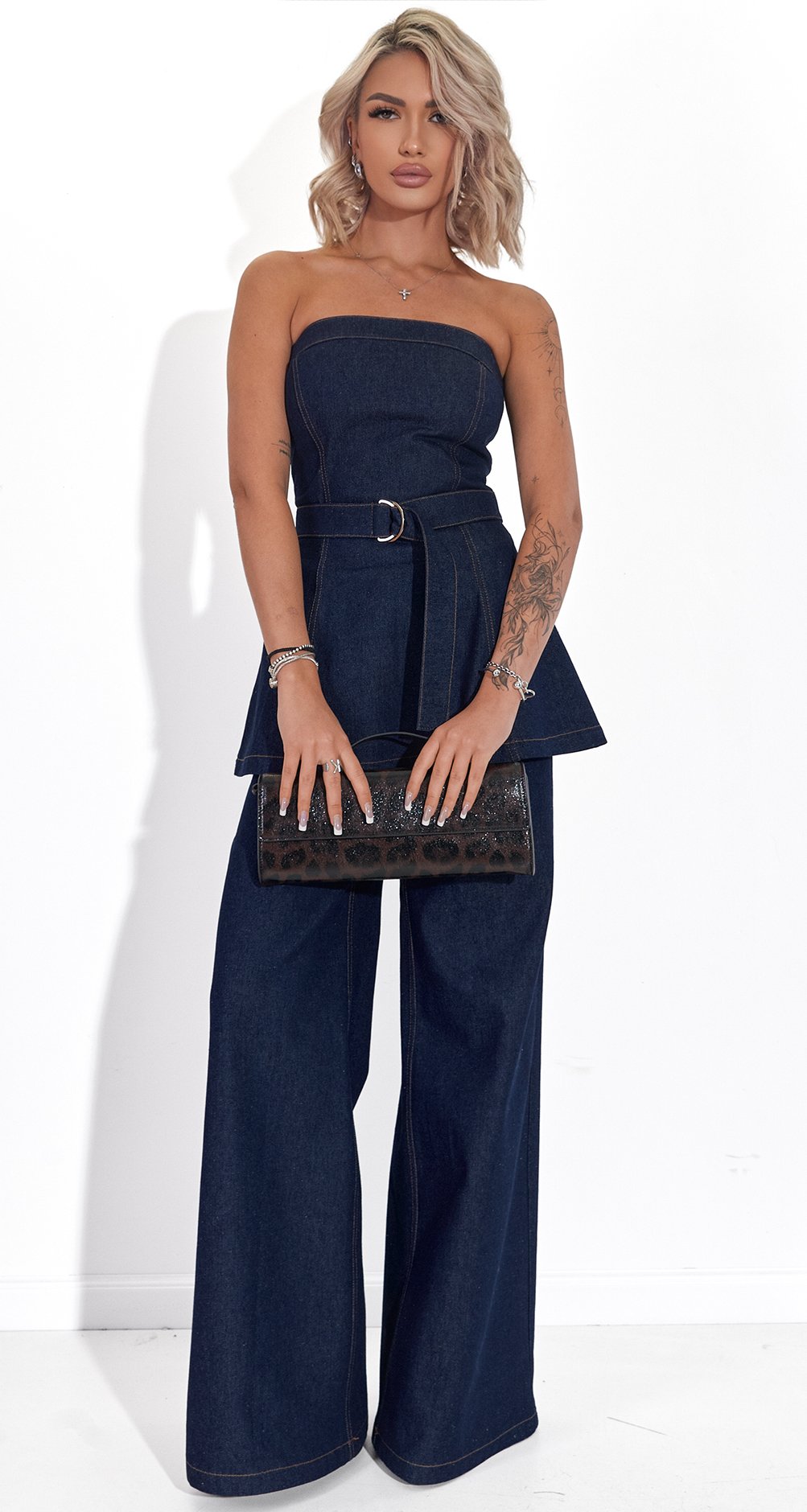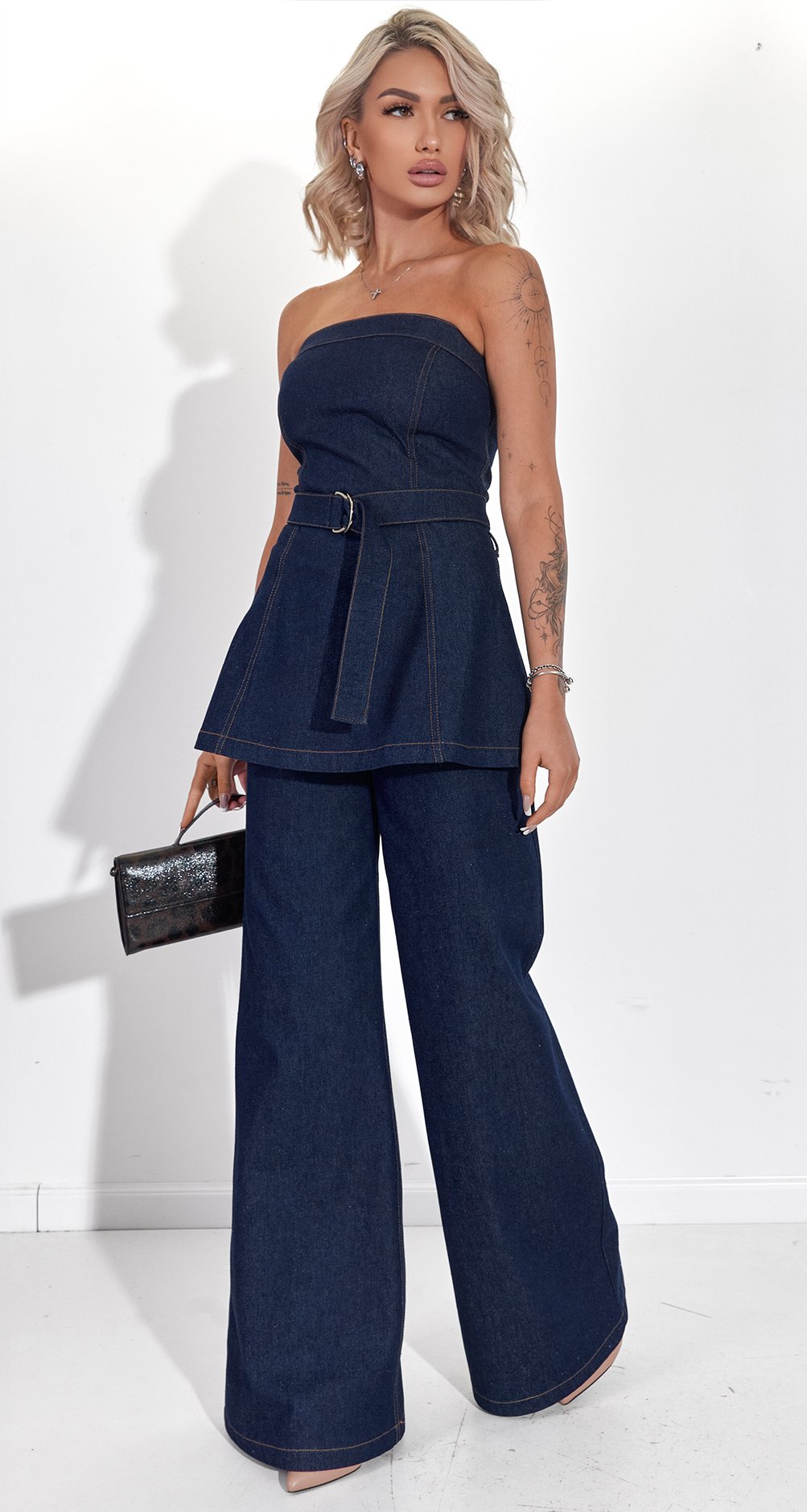 Представляем Ультрамодный джинсовый комплект: корсетный топ-бюстье с элегантным поясом и стильные брюки-палаццо с высокой посадкой.