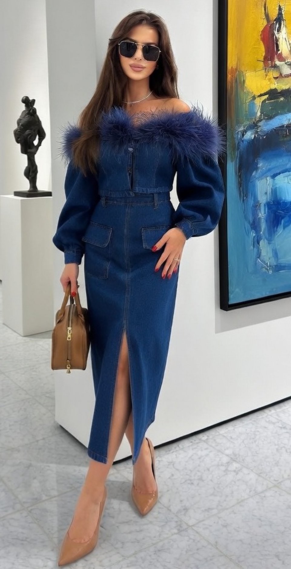 Этот джинсовый комплект — настоящий вызов обыденности. Мы соединили грубую эстетику денима с хрупкостью натуральных перьев, чтобы создать образ, который невозможно забыть.