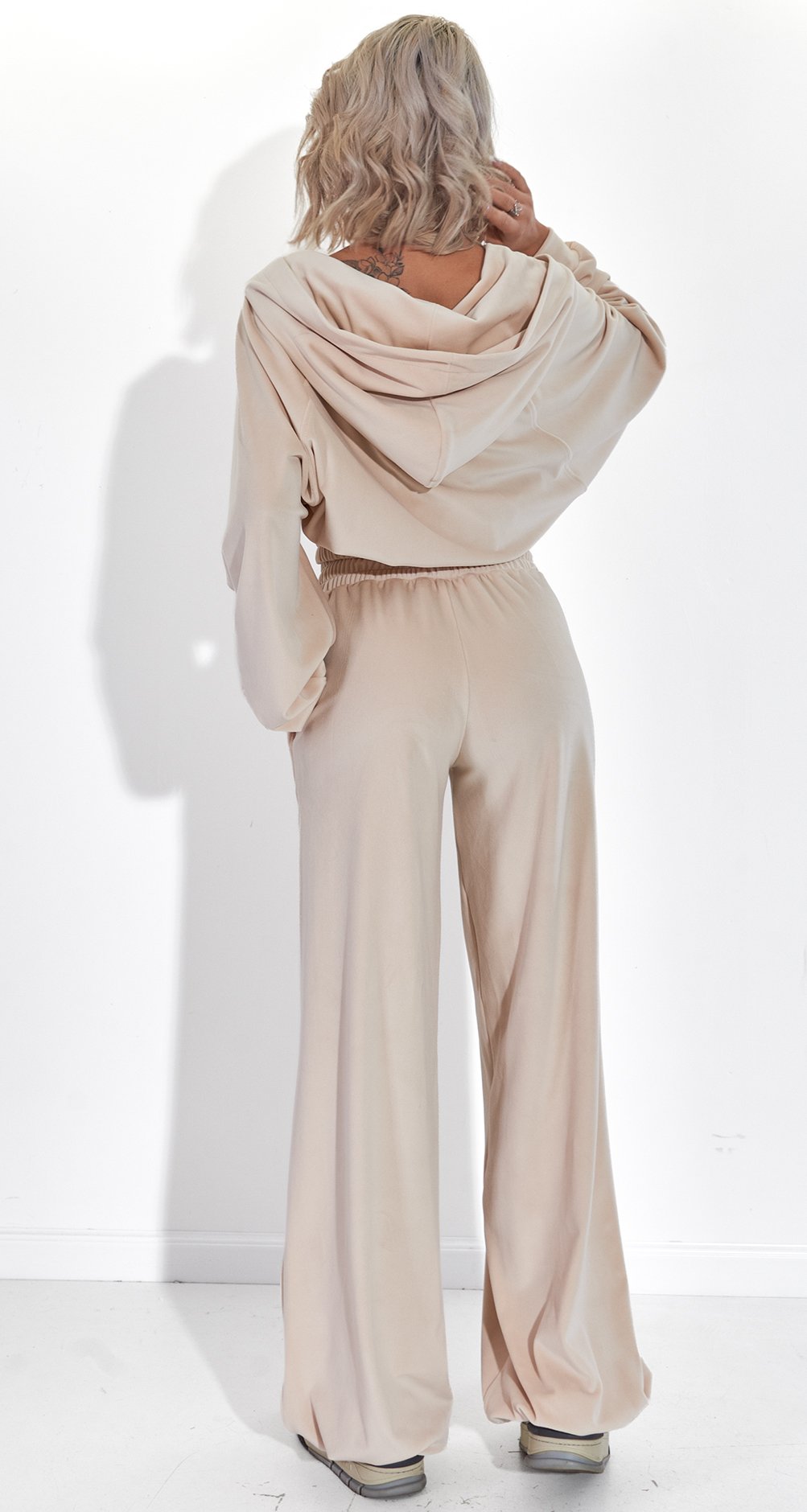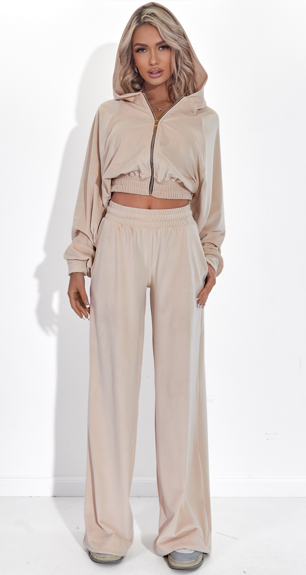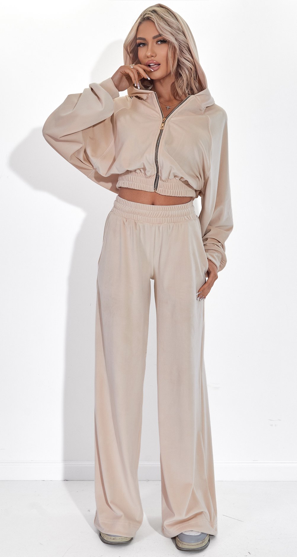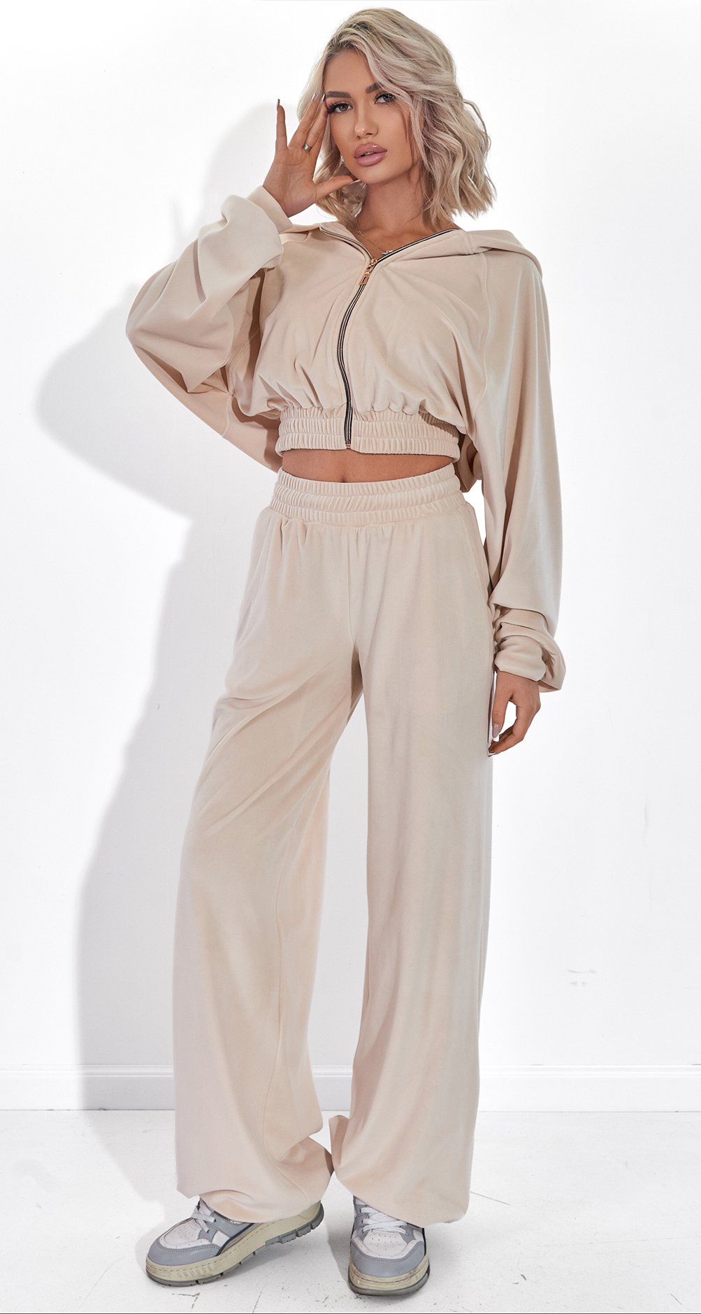 Идеальный Крой: Укороченный худи на молнии с объемом "летучая мышь" и высокие широкие брюки-палаццо — силуэт, который визуально стройнит и удлиняет ноги.