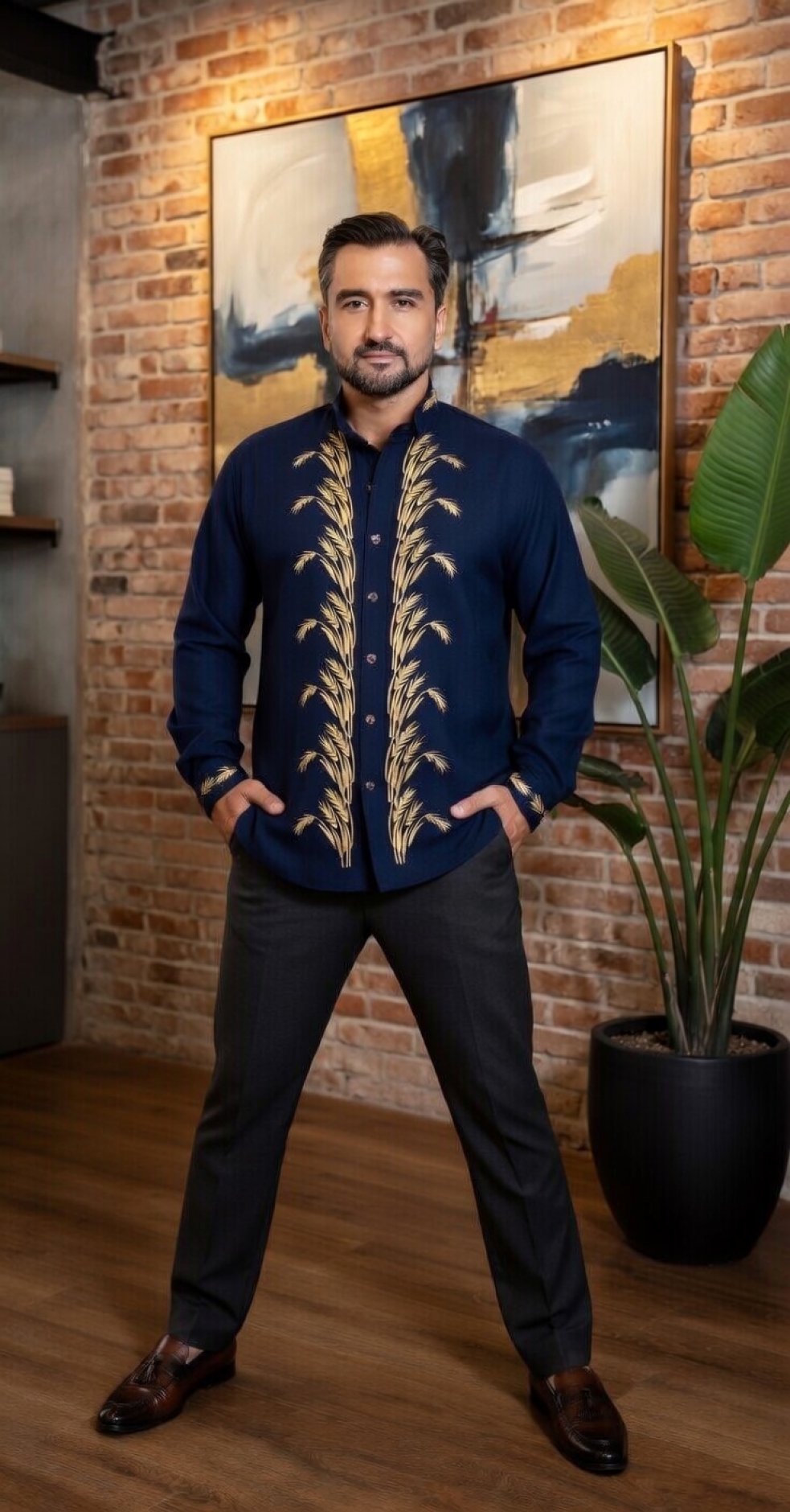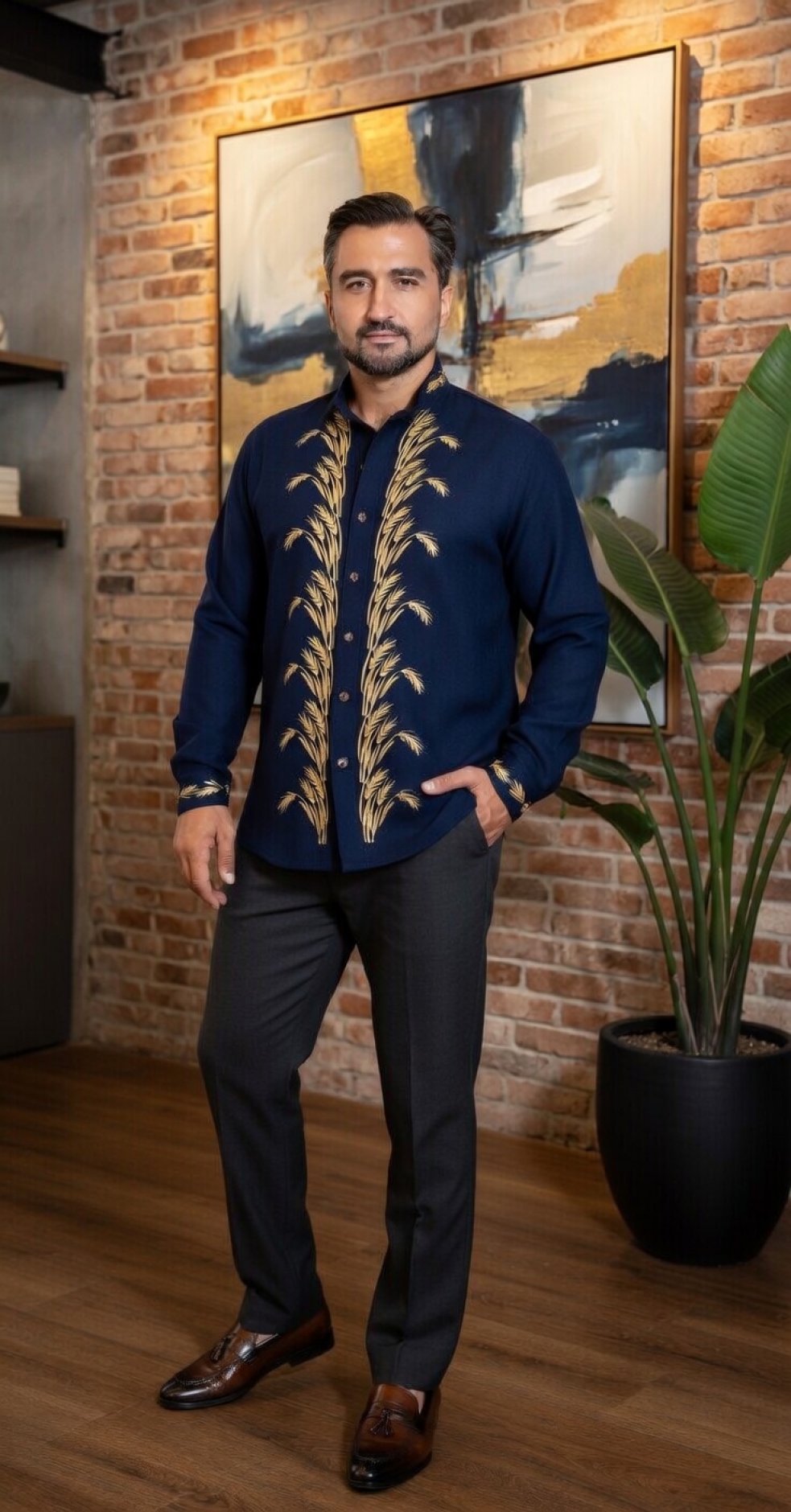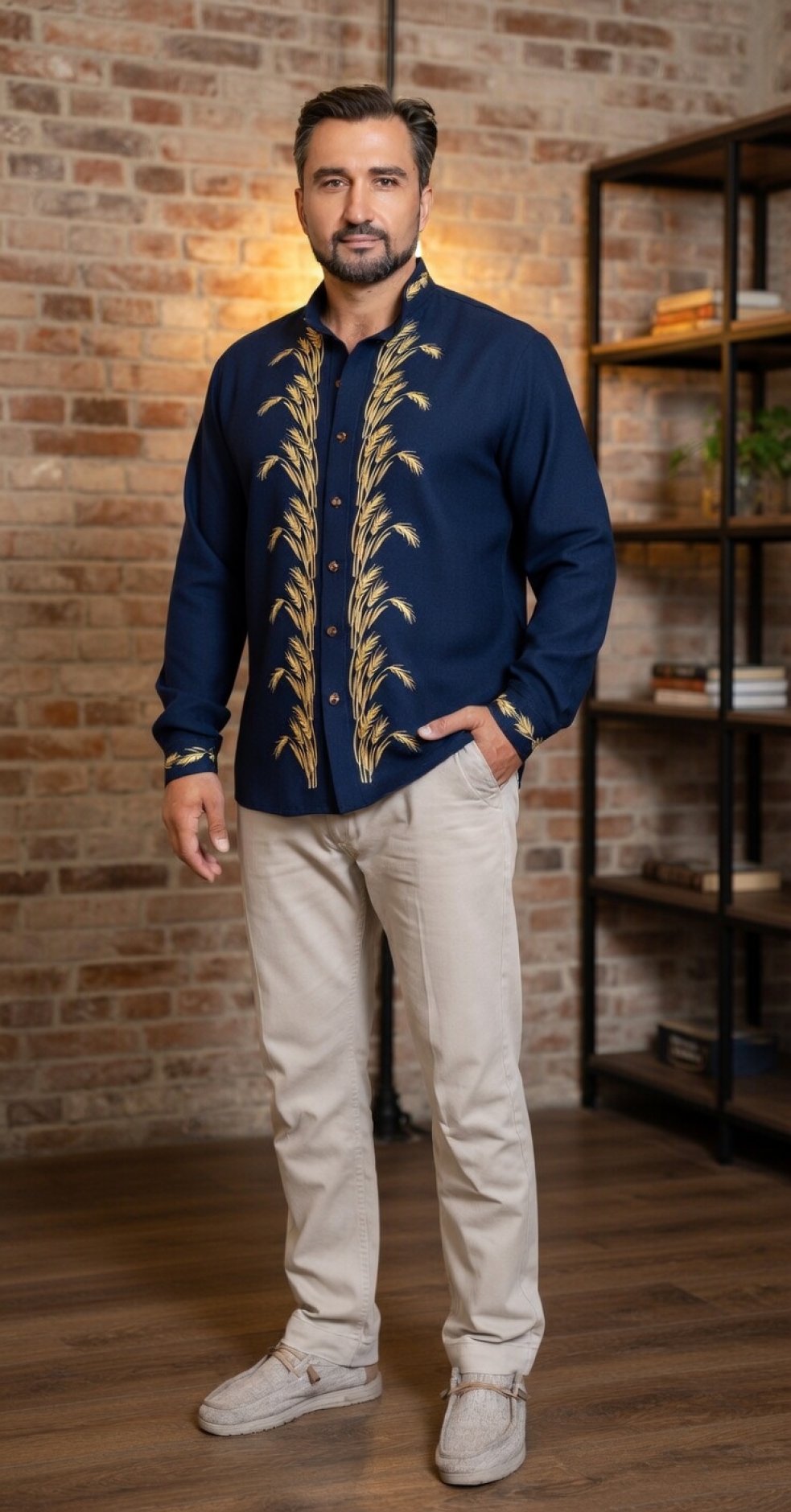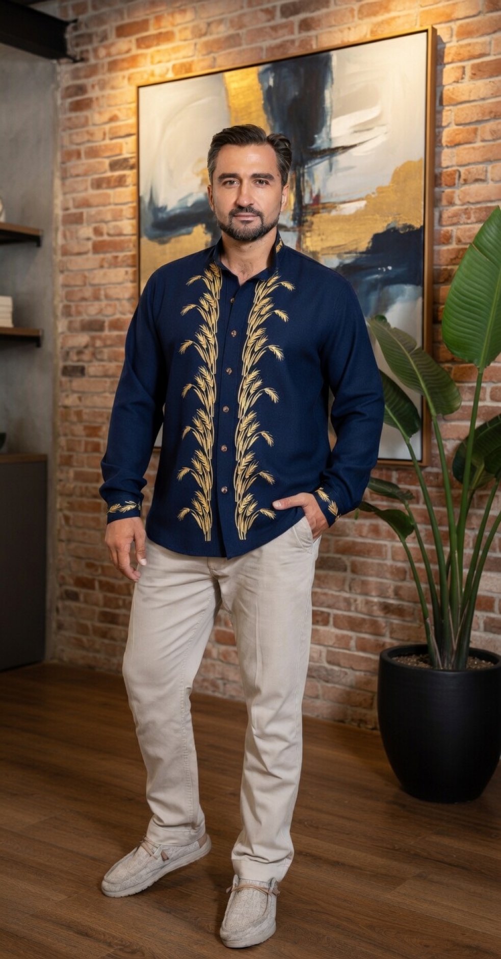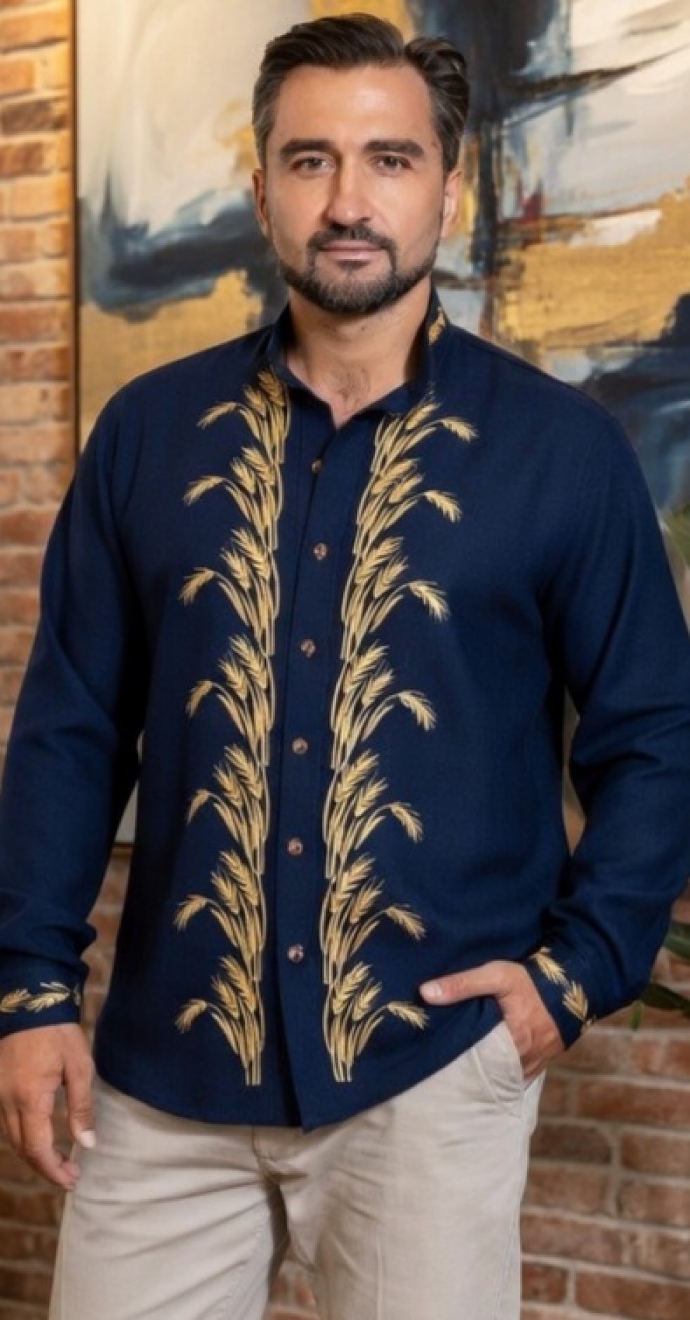 Эта эксклюзивная мужская вышиванка выполнена из натурального льна, который обеспечивает комфорт и легкость даже в самые жаркие дни. В центре внимания – роскошный узор из колосьев пшеницы, вышитый золотистой нитью. Этот орнамент, символизирующий плодородие, богатство и жизненную силу, делает "Мирослава" не просто одеждой, а настоящим оберегом.