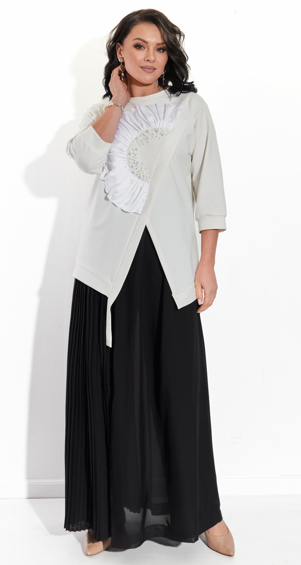 Блуза с декором, выполненная из нарядного трикотажа, придает комплекту завершенный вид. Ее уникальный дизайн и фактура делают эту женскую блузку настоящим произведением искусства.