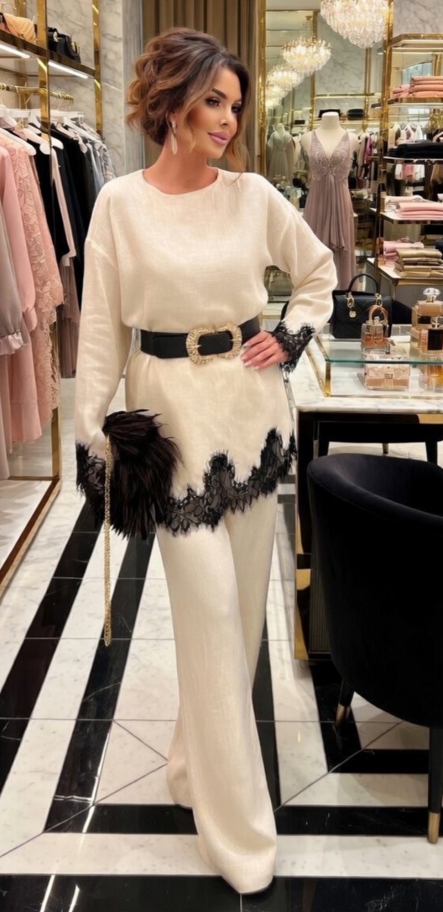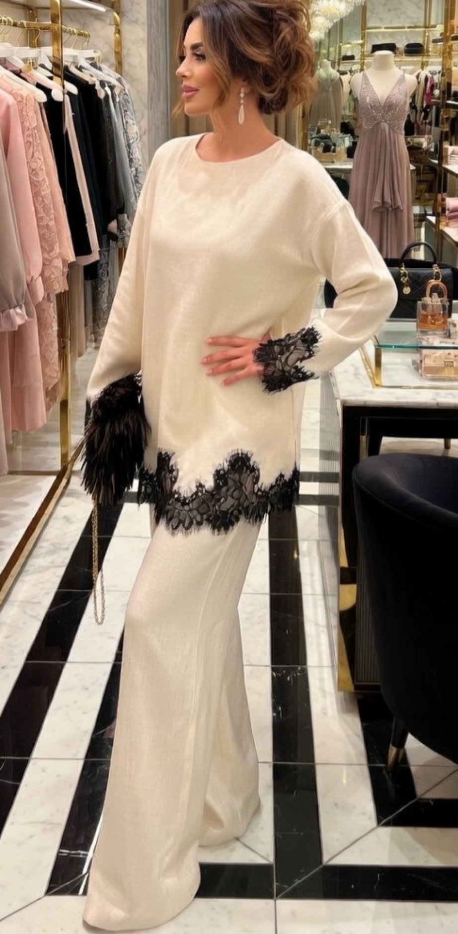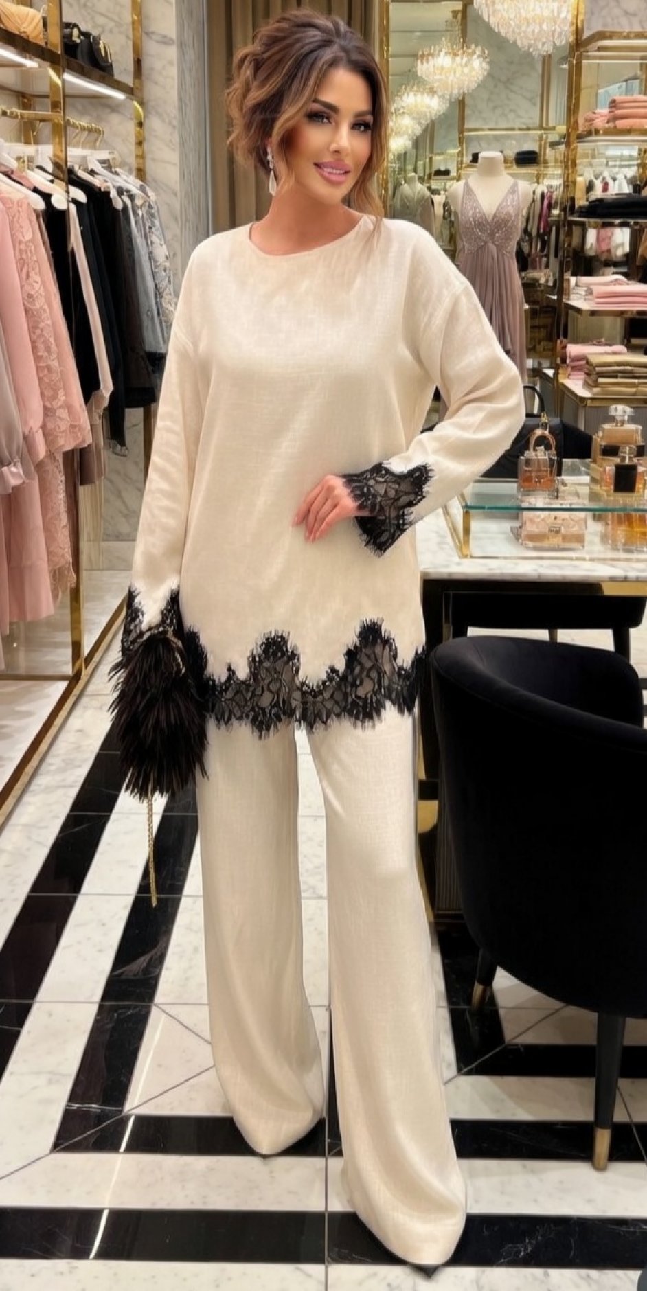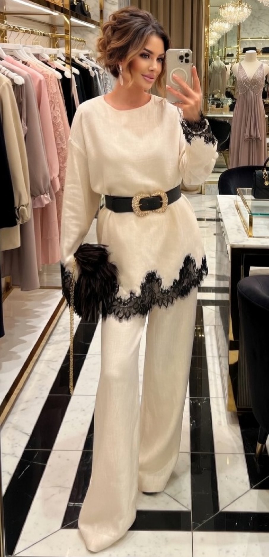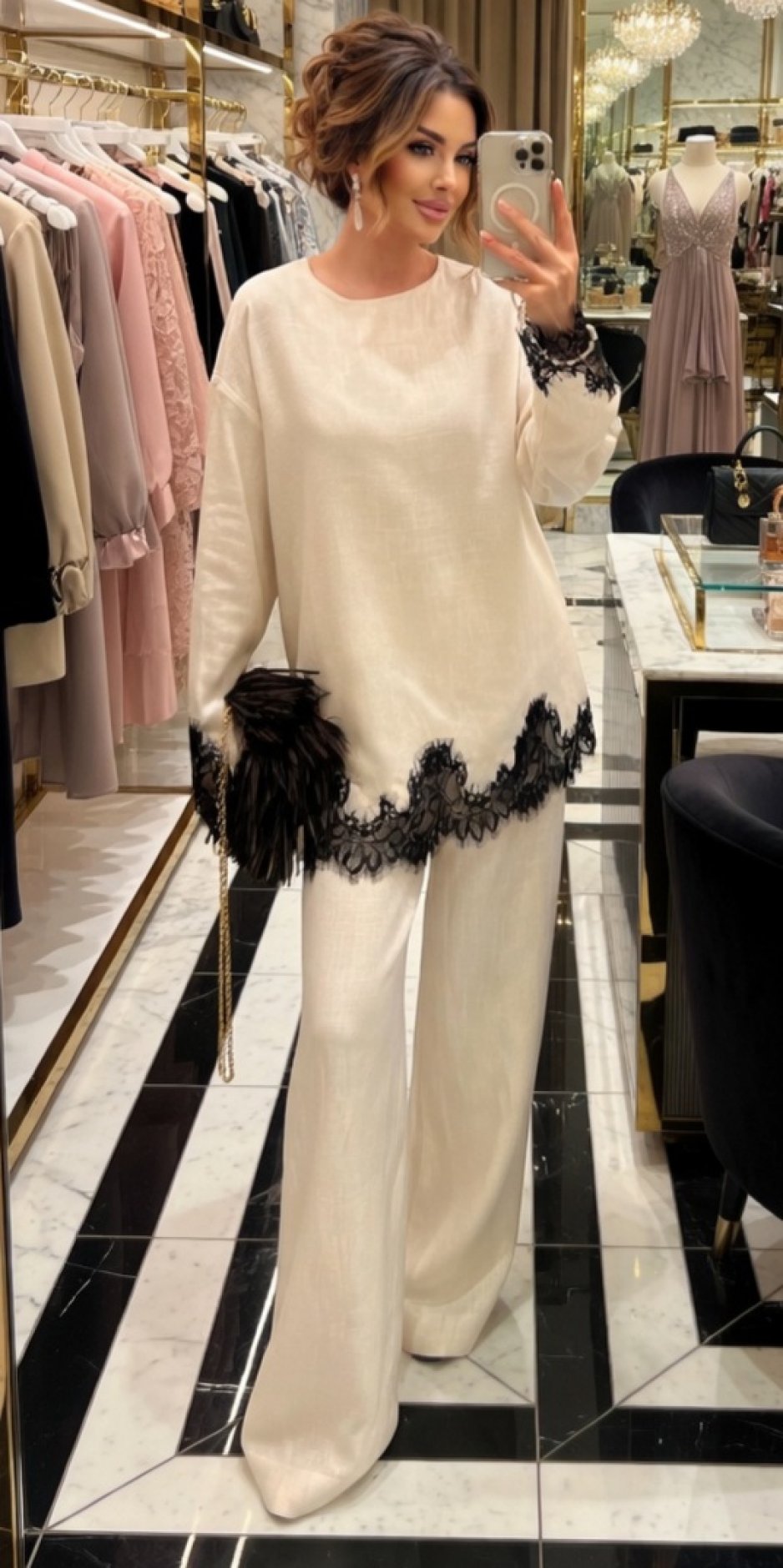 Когда домашний уют встречается с высокой модой. Наш новый костюм из плотного эко-шелка с контрастной кружевной отделкой — это история о любви к себе, эстетике и безупречном комфорте.