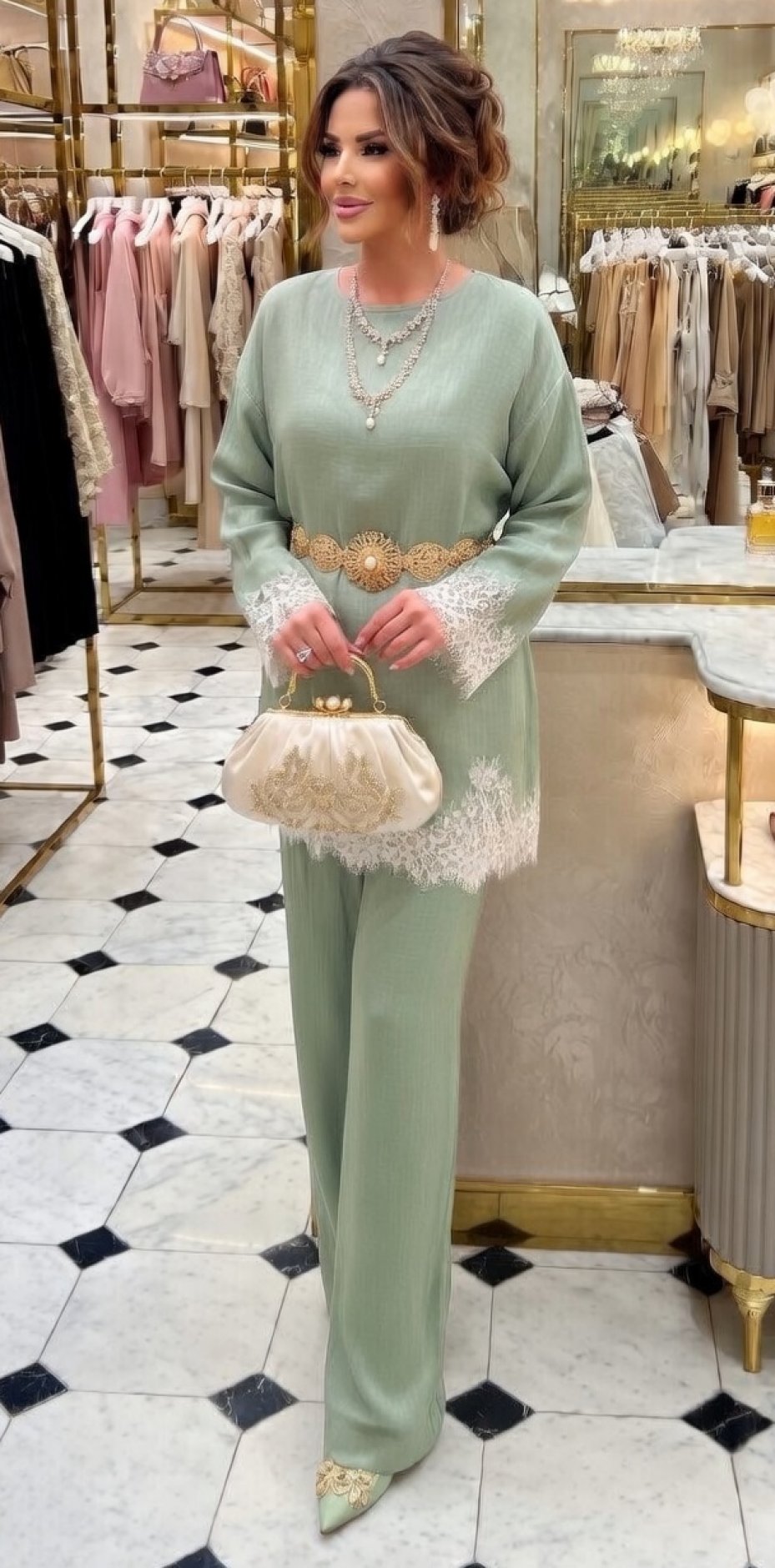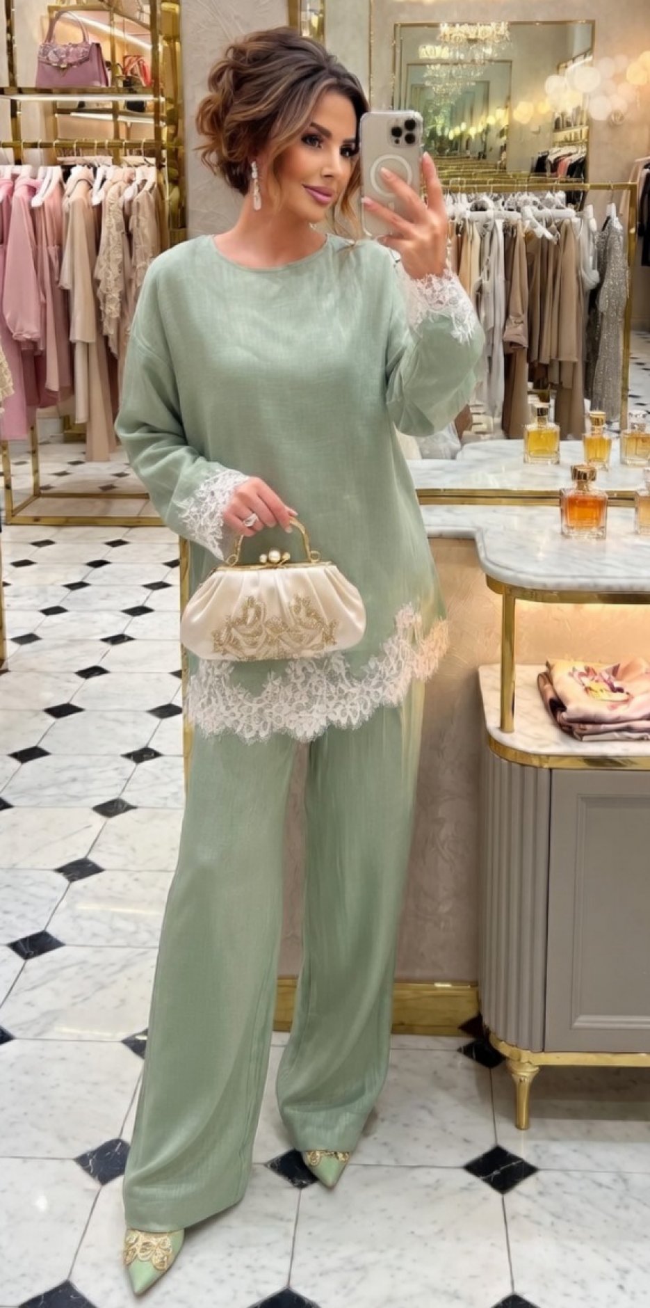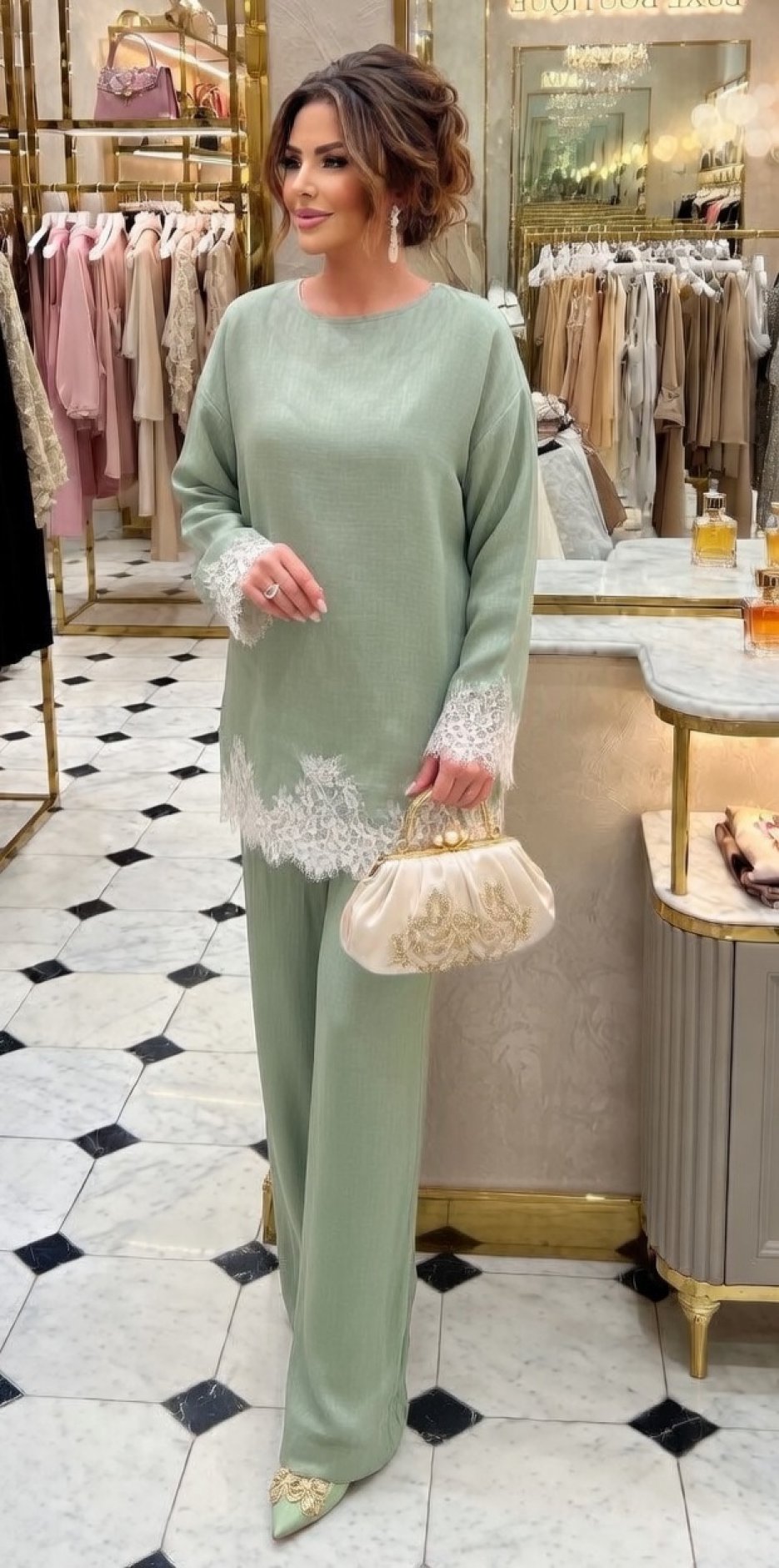 ​Когда домашний уют встречается с высокой модой. Наш новый костюм из плотного эко-шелка с контрастной кружевной отделкой — это история о любви к себе, эстетике и безупречном комфорте.