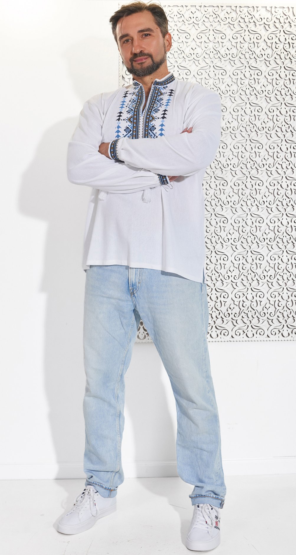 * Изысканная вышивка: Уникальный геометрический узор в синих и черных тонах украшает воротник, манжеты и переднюю часть вышиванки. Он придает ей особый шарм и выделяет из толпы.