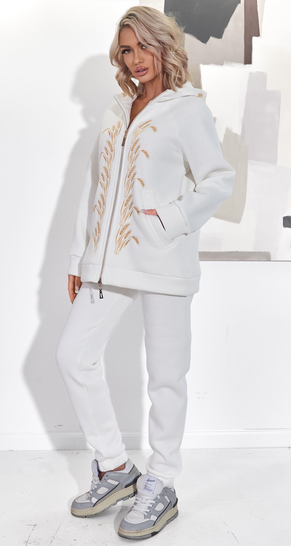 Уникальная Вышивка: Центральный акцент – изящная вышивка в виде золотых колосьев на худи. Этот символичный и стильный элемент придает костюму особую элегантность и национальный шарм.