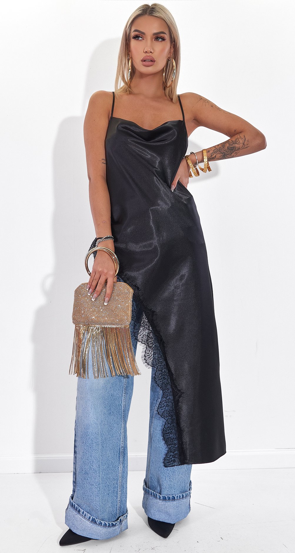 Трендова Комбінація: Ми взяли розкіш стилю білизни і перенесли її на вулицю. Носіть цю туніку поверх широких джинсів (як на фото), легінсів або велосипедів – створюйте контрастні та актуальні образи. Під ОВЕР піджак або светр.