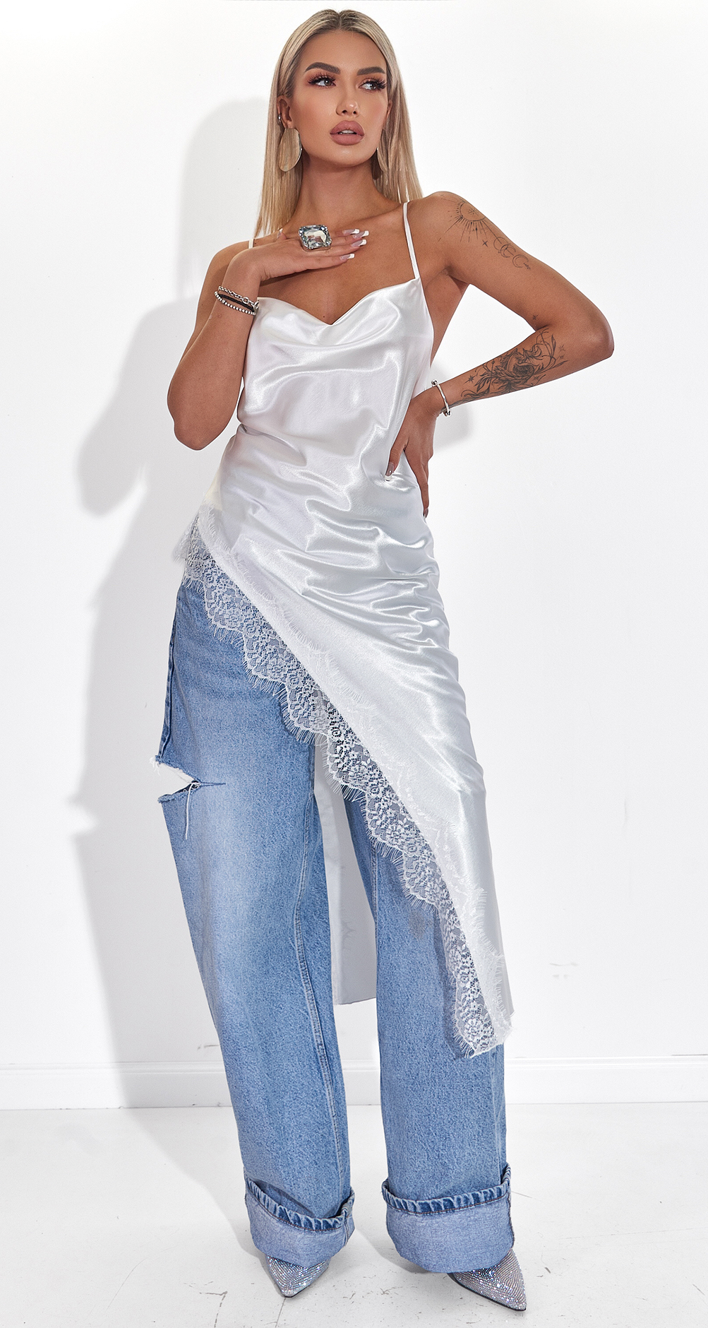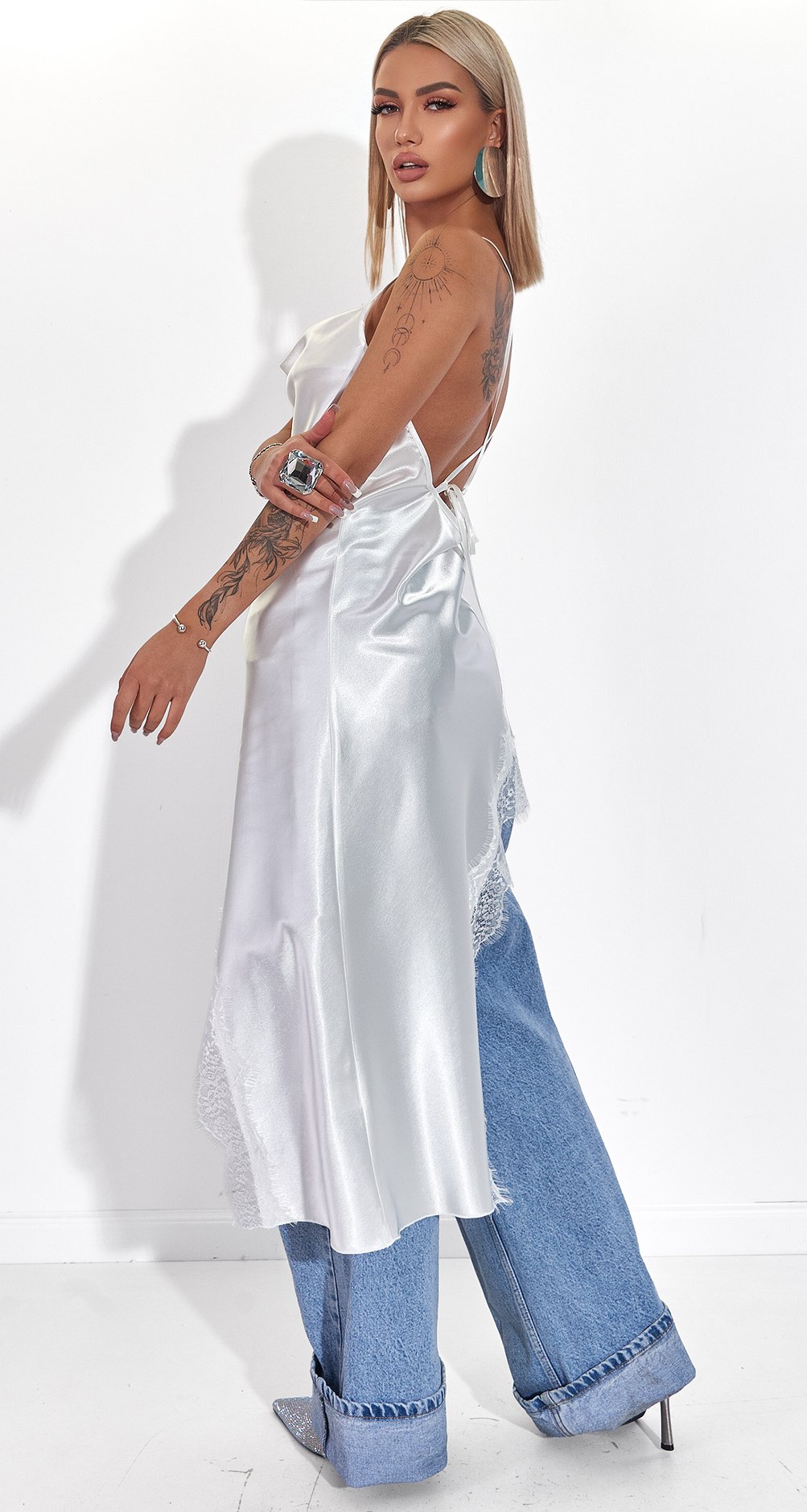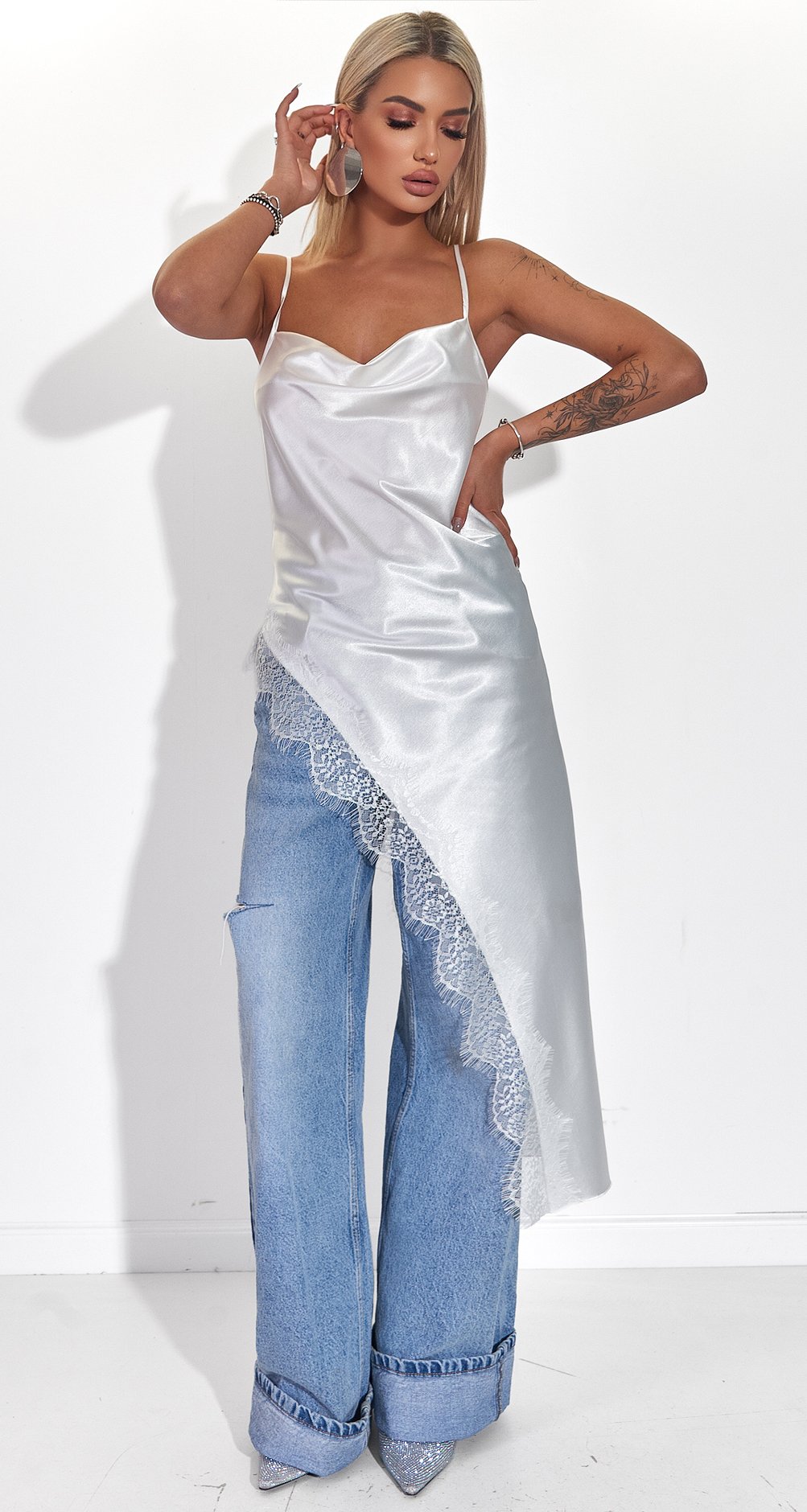 Трендова Комбінація: Ми взяли розкіш стилю білизни і перенесли її на вулицю. Носіть цю туніку поверх широких джинсів (як на фото), легінсів або велосипедів – створюйте контрастні та актуальні образи. Під ОВЕР піджак або светр.