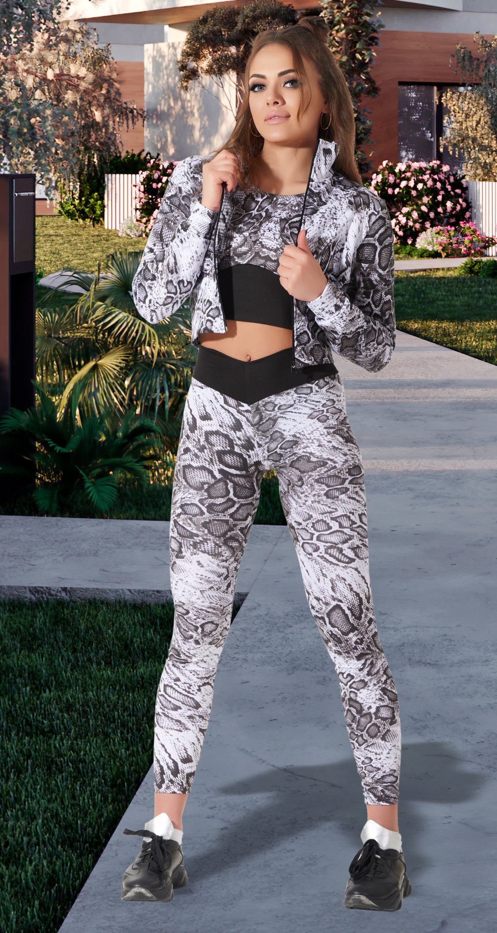 Представляємо вам ідеальний комплект для тих, хто цінує стиль та комфорт у кожному русі. Наш спортивний костюм-трійка з ефектним зміїним принтом створений, щоб ти почувала себе впевнено та привабливо на будь-якому тренуванні. Він однаково добрий для фітнесу, йоги, пілатесу та інших видів спорту.