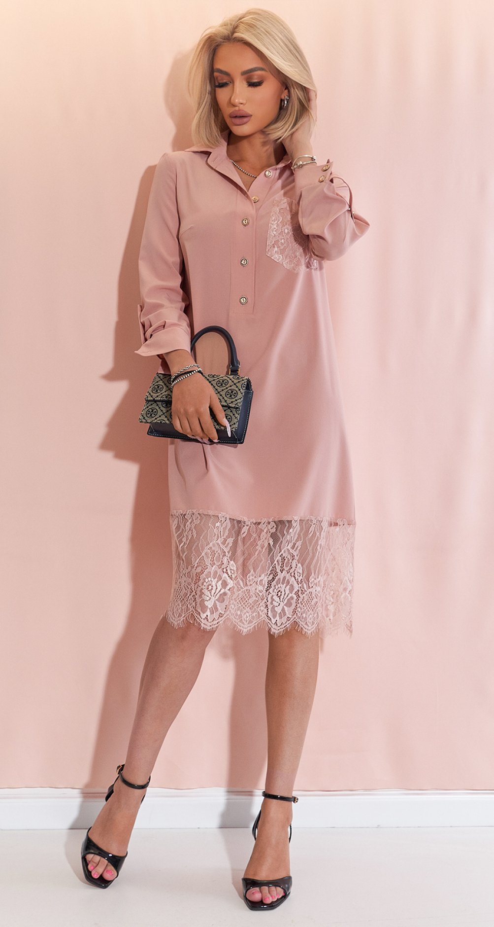 Будьте в центрі уваги з нашою неймовірно елегантною сукнею-сорочкою, доповненою розкішним французьким мереживом! Цей модний образ ідеально підкреслить вашу жіночність. Шукаєте сукню на весну або сукню на літо? Ця пудрова сукня – ваш ідеальний супутник. Довжина міді, делікатне мереживо і універсальний крій роблять його незамінним як для ділових зустрічей, так і для романтичних побачень. Відмінний варіант для тих, хто шукає якісну жіночу сукню або сукню з вишуканою обробкою. Красиво виглядає, якщо доповнити його стильним ременем! Додайте шик у свій гардероб з цією трендовою сукнею!
