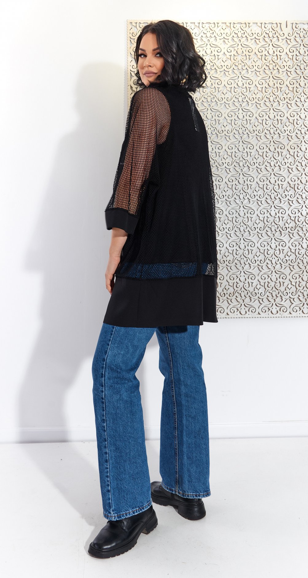 Стильний комплект, який підкреслить вашу індивідуальність! Чорна туніка вільного крою з рукавами 3/4 ідеально поєднується з топом та створює легкий, але ефектний образ. Унікальна сітка та обробка в тон надають туніку легкості, а великі накладні кишені із сріблястими змійками додають сучасний акцент. Ідеально підходить для сміливих, впевнених у собі жінок, які цінують комфорт та стиль.