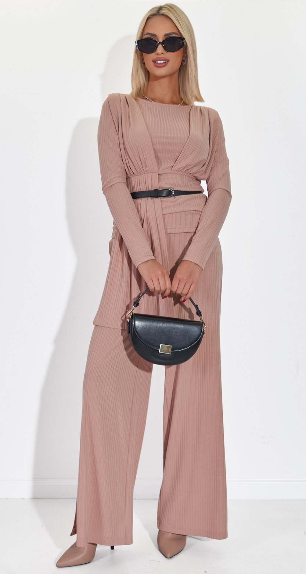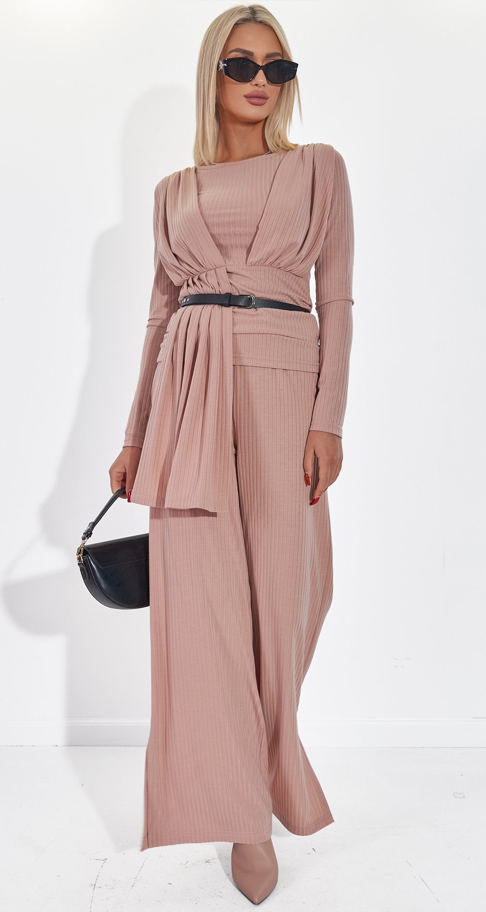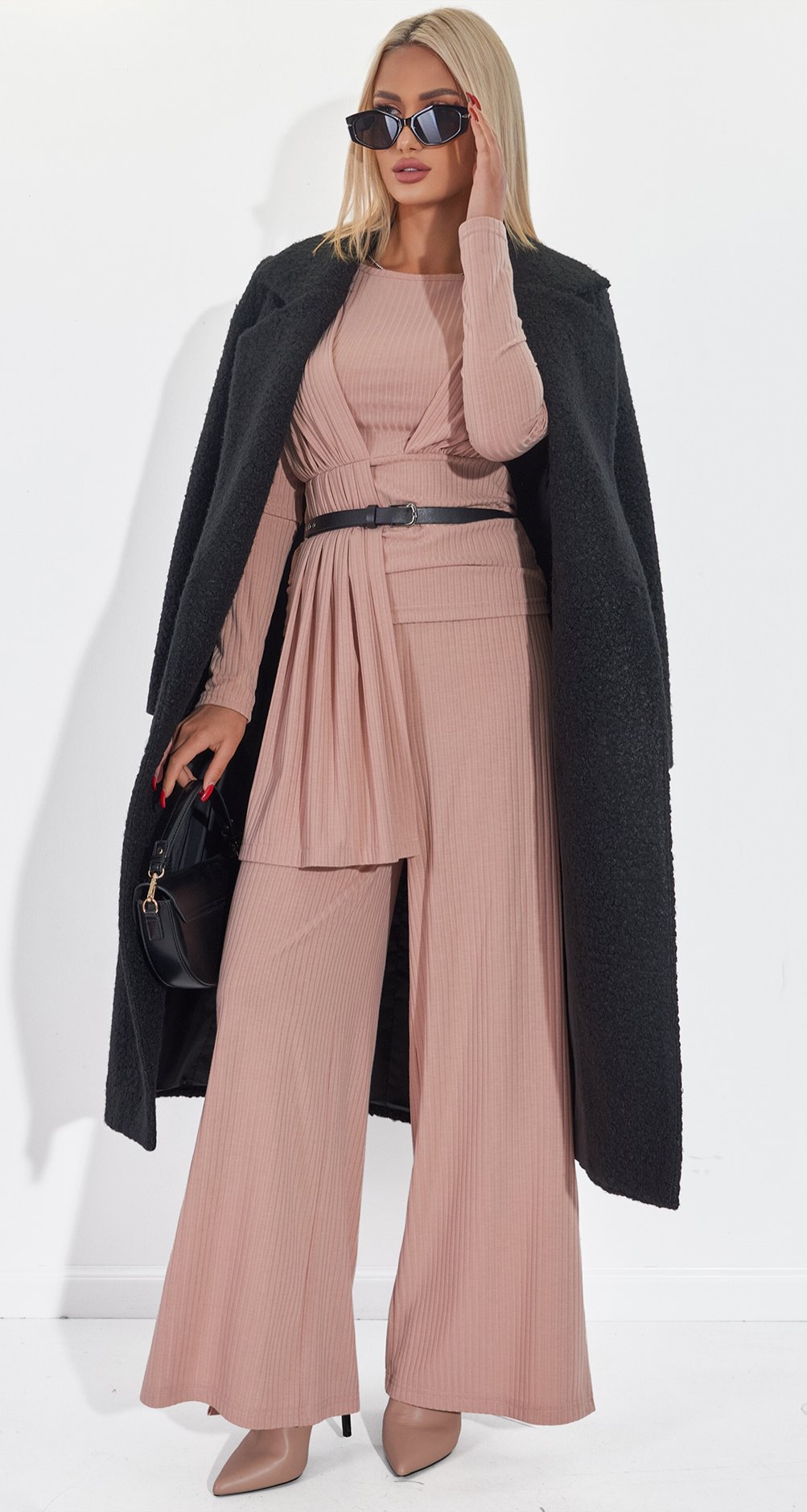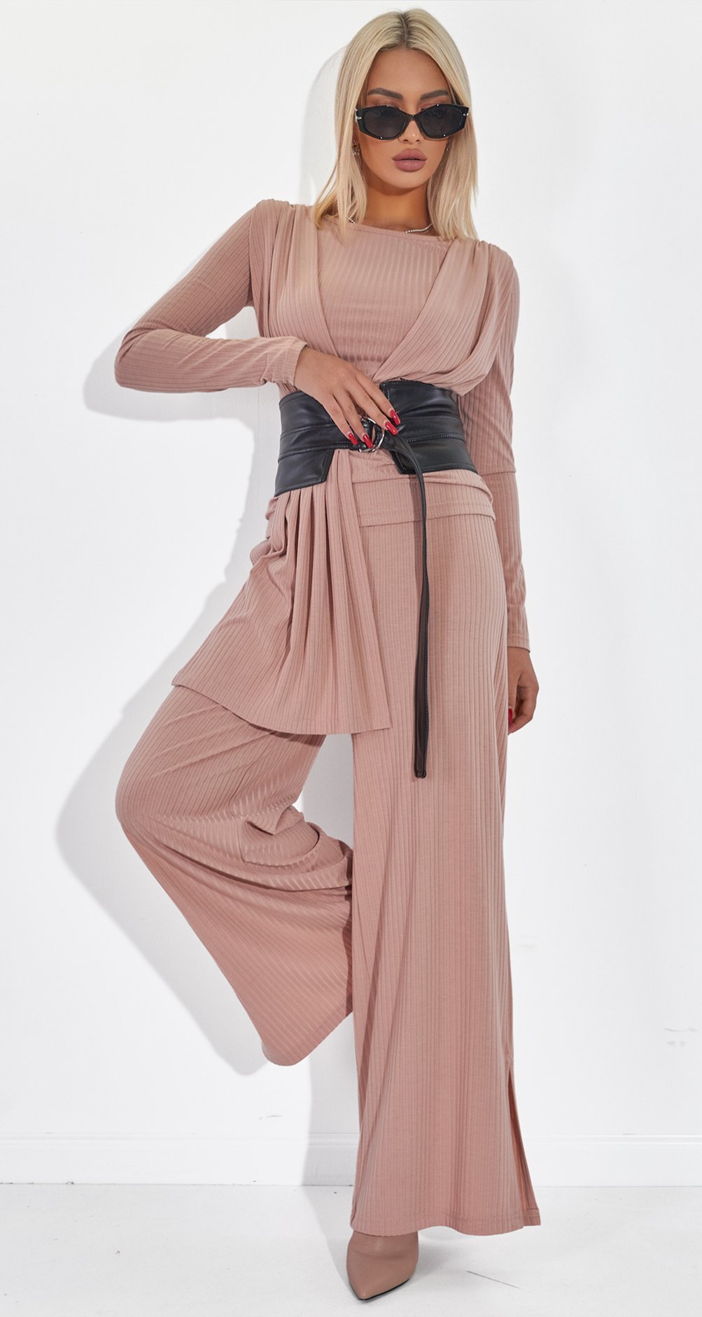 Цей костюм - справжня знахідка для тих, хто стежить за модою! Широкі штани та топ складного крою миттєво виводять ваш образ на новий рівень.