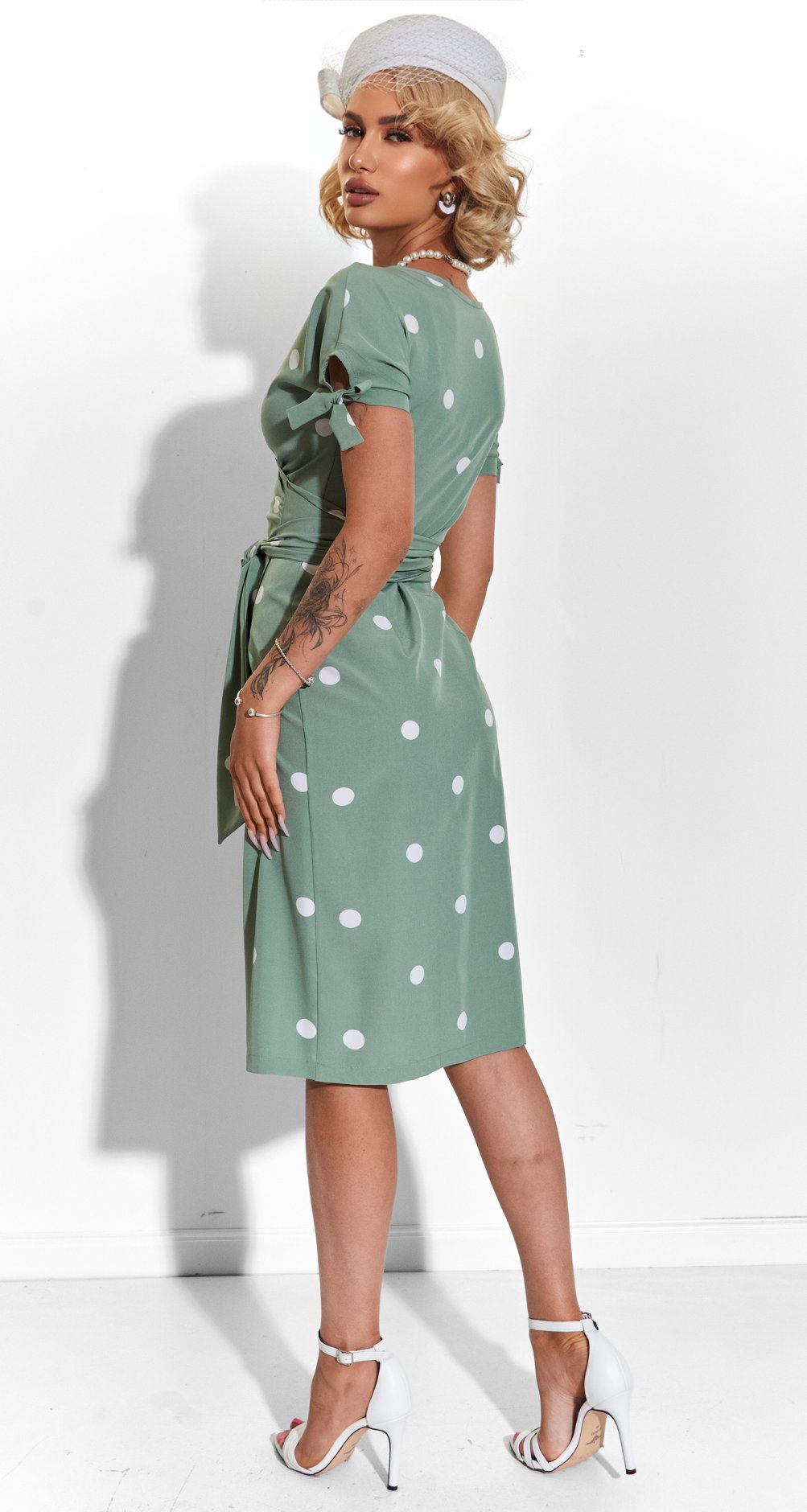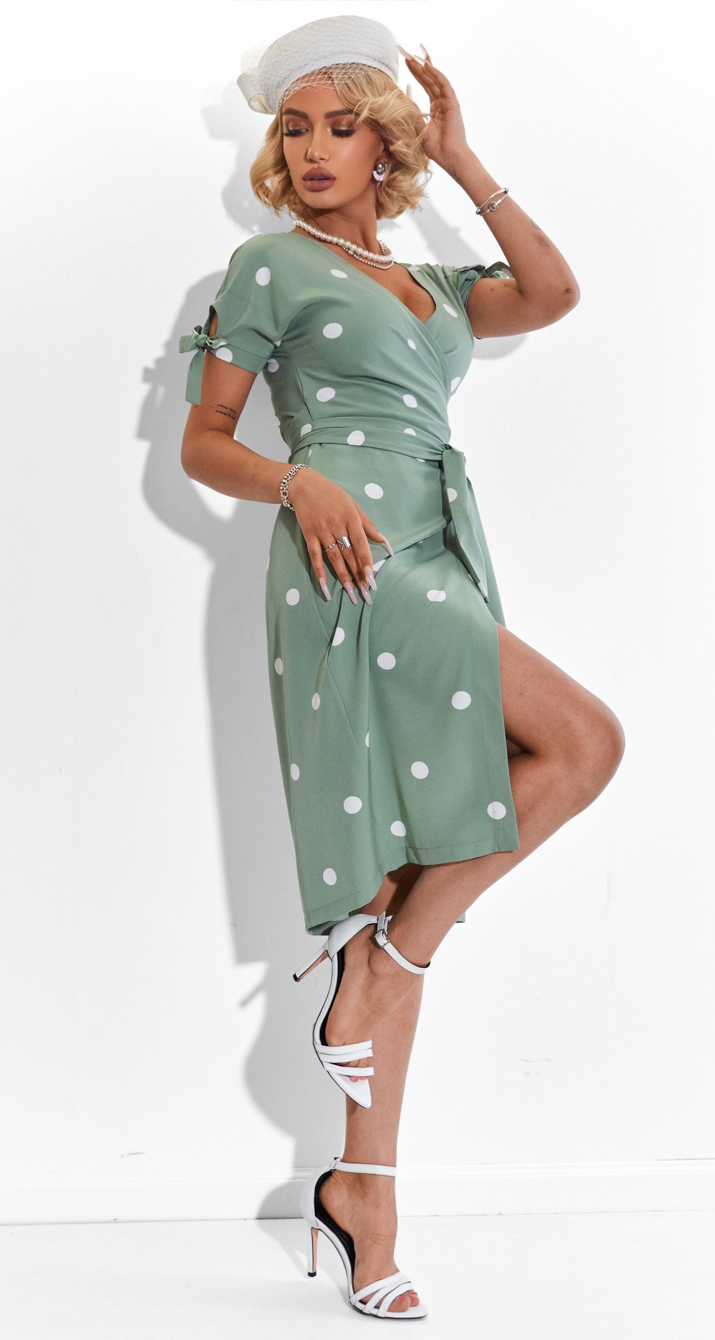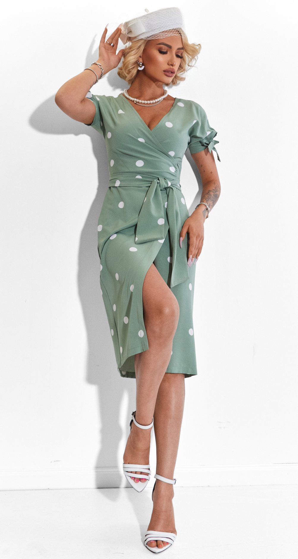 > Шукаєте легку сукню на кожен день або для особливого випадку? Представляємо вашій увазі елегантну сукню на запах з ніжним принтом в білий горошок. Цей класичний і завжди актуальний малюнок на приємному фісташковому тлі додасть вашому образу шарму і жіночності.